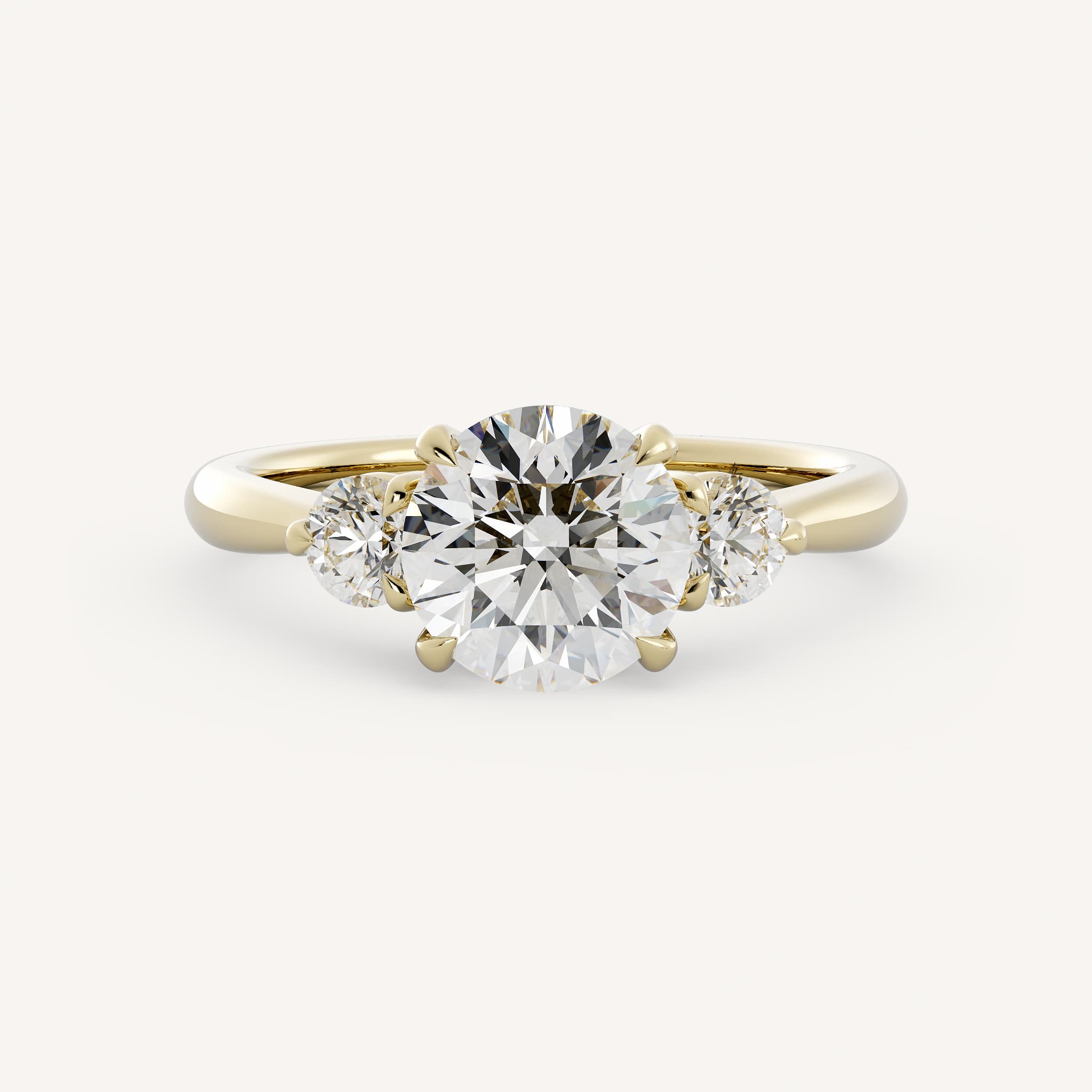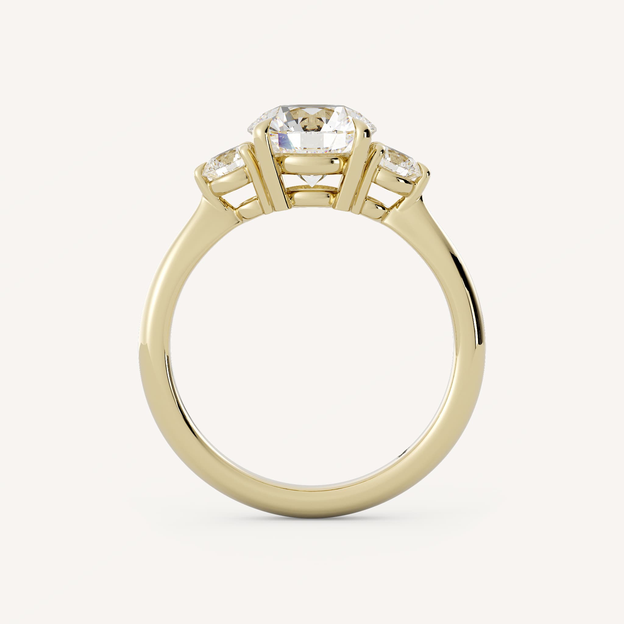 Abby features a charming round center stone with two round accent stones set in a three stone basket on a half round shank.