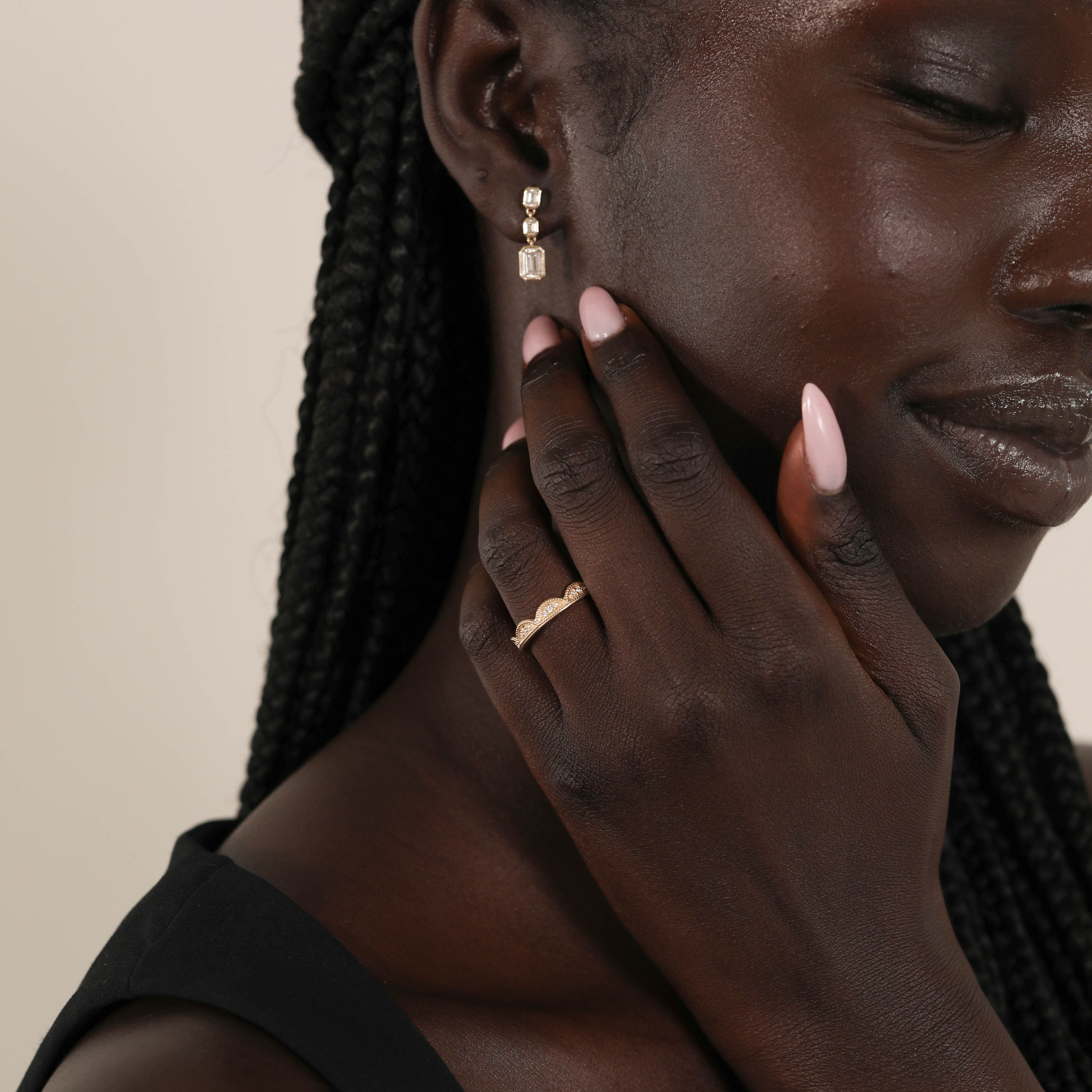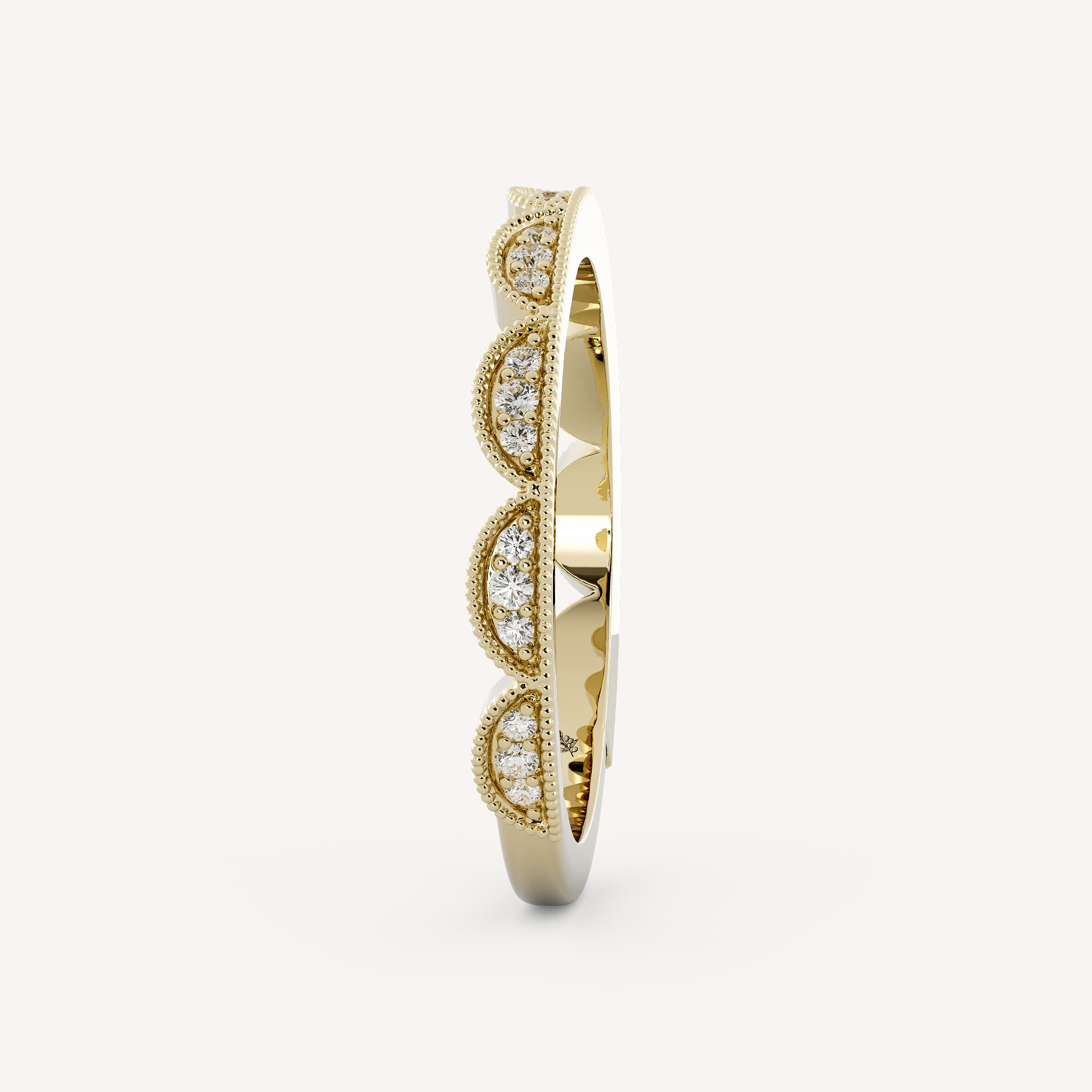 Alice is an intricate 3/4 eternity band with round stones set in a scallop edge bezel design with milgrain detail.