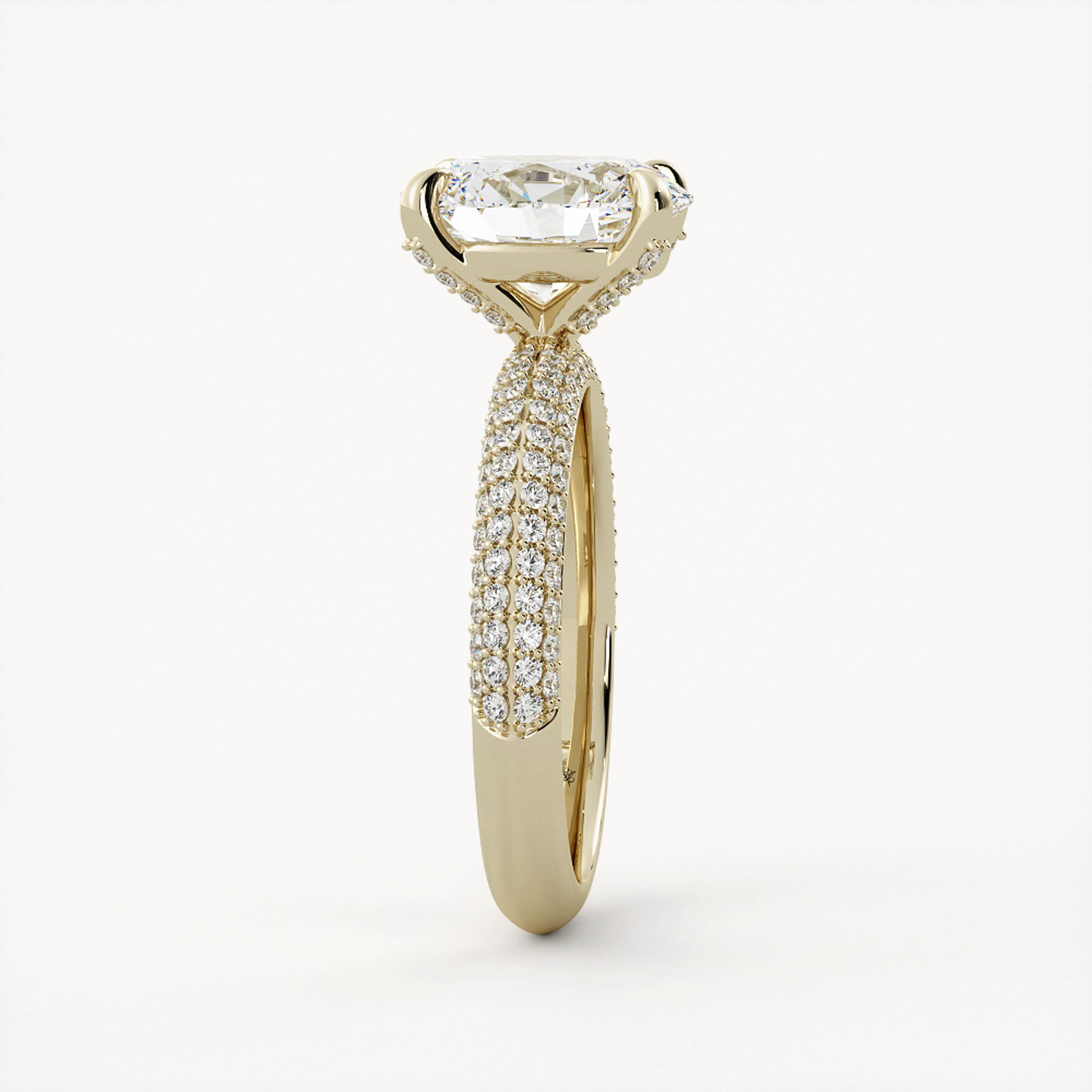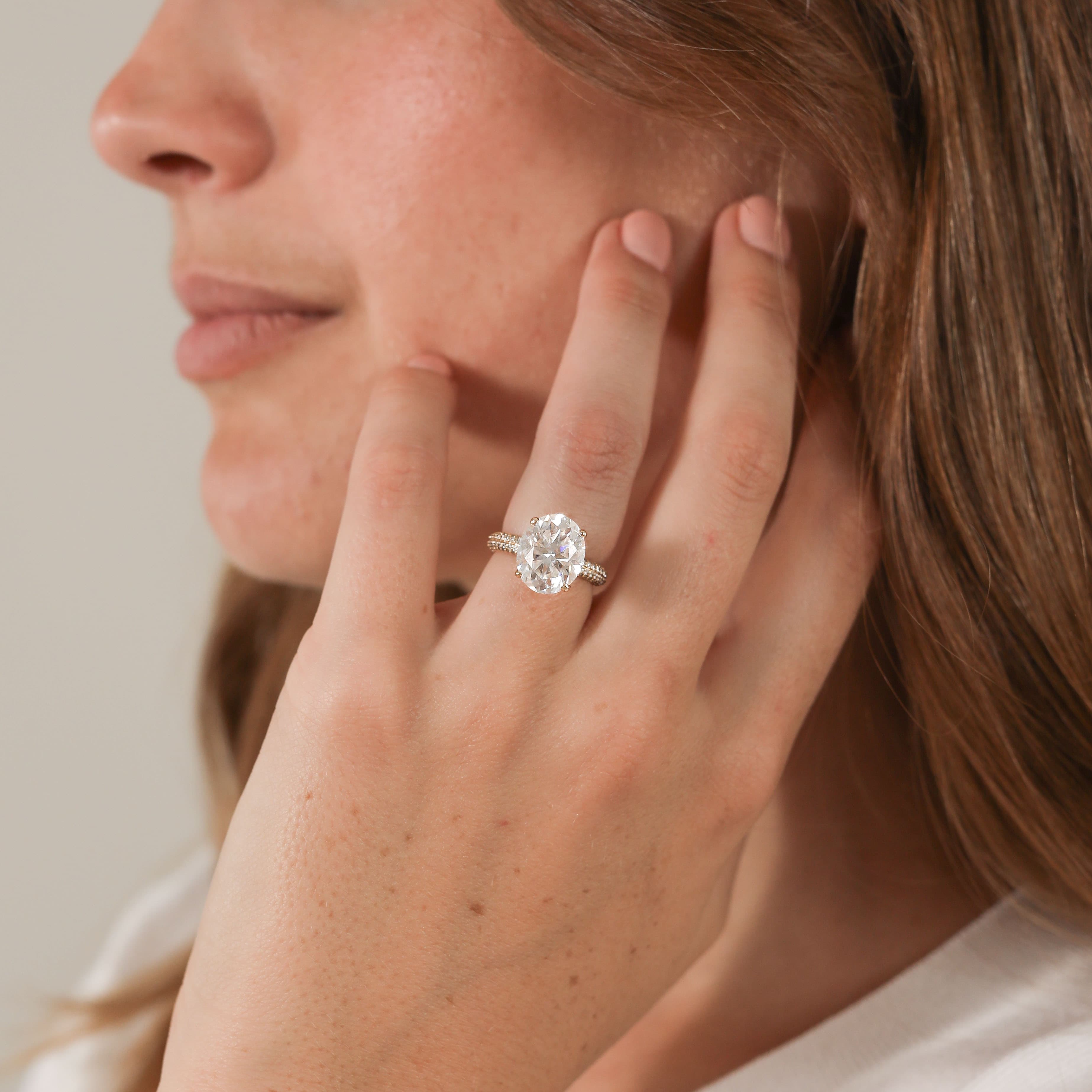 Allie features an elegant oval center stone set in an eye-catching multi-pave band with a traditional setting featuring diamond accent prongs.