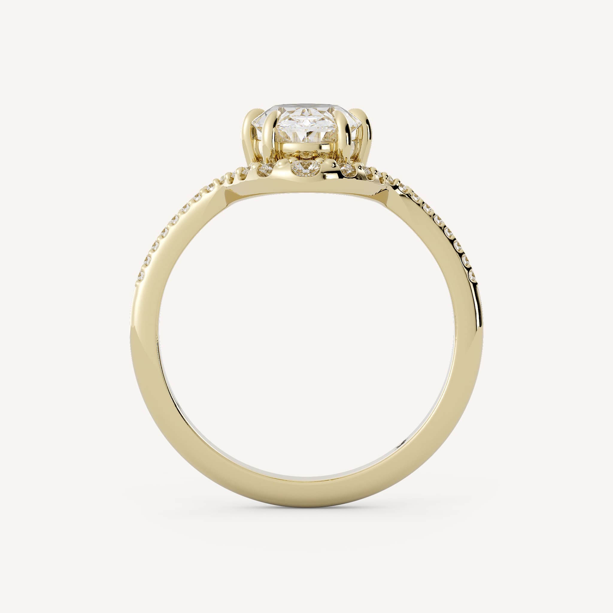 Amorette features an elongated oval center stone set with six claw prongs on a contoured shank with cascading diamonds. This design features half a hidden halo on the open side.