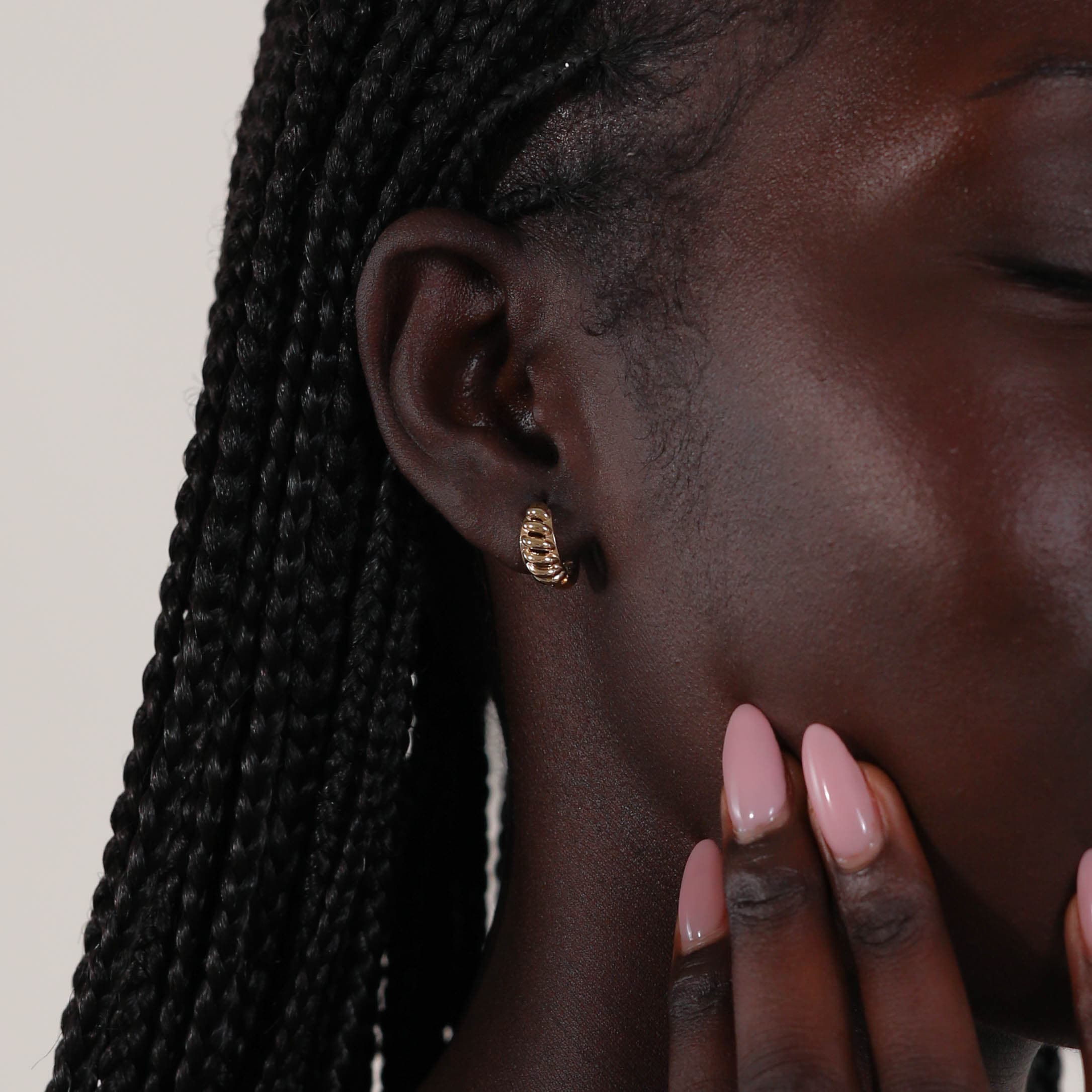 Annie Hoops feature a dome shaped hinged hoop with gold detail and negative space.