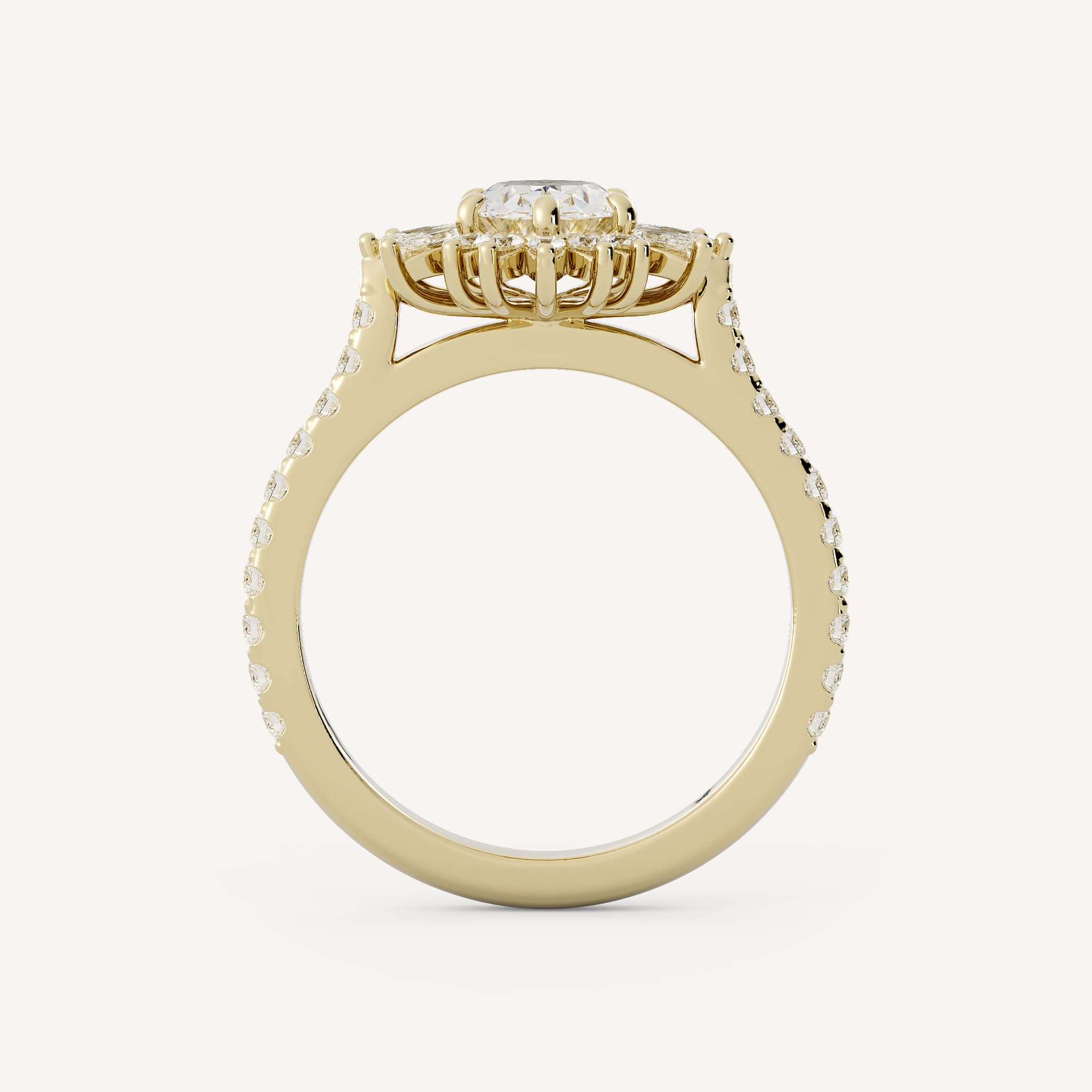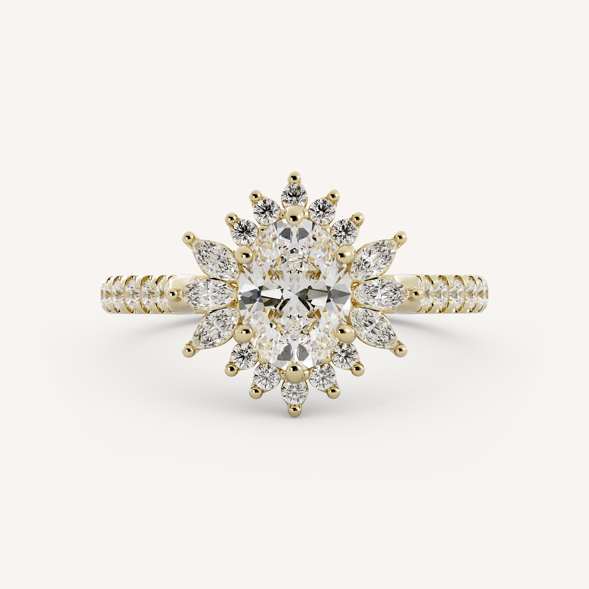 Bailey features an oval center stone with a charming burst halo of marquise and round stones. Set in a cathedral basket on a scallop prong shank.