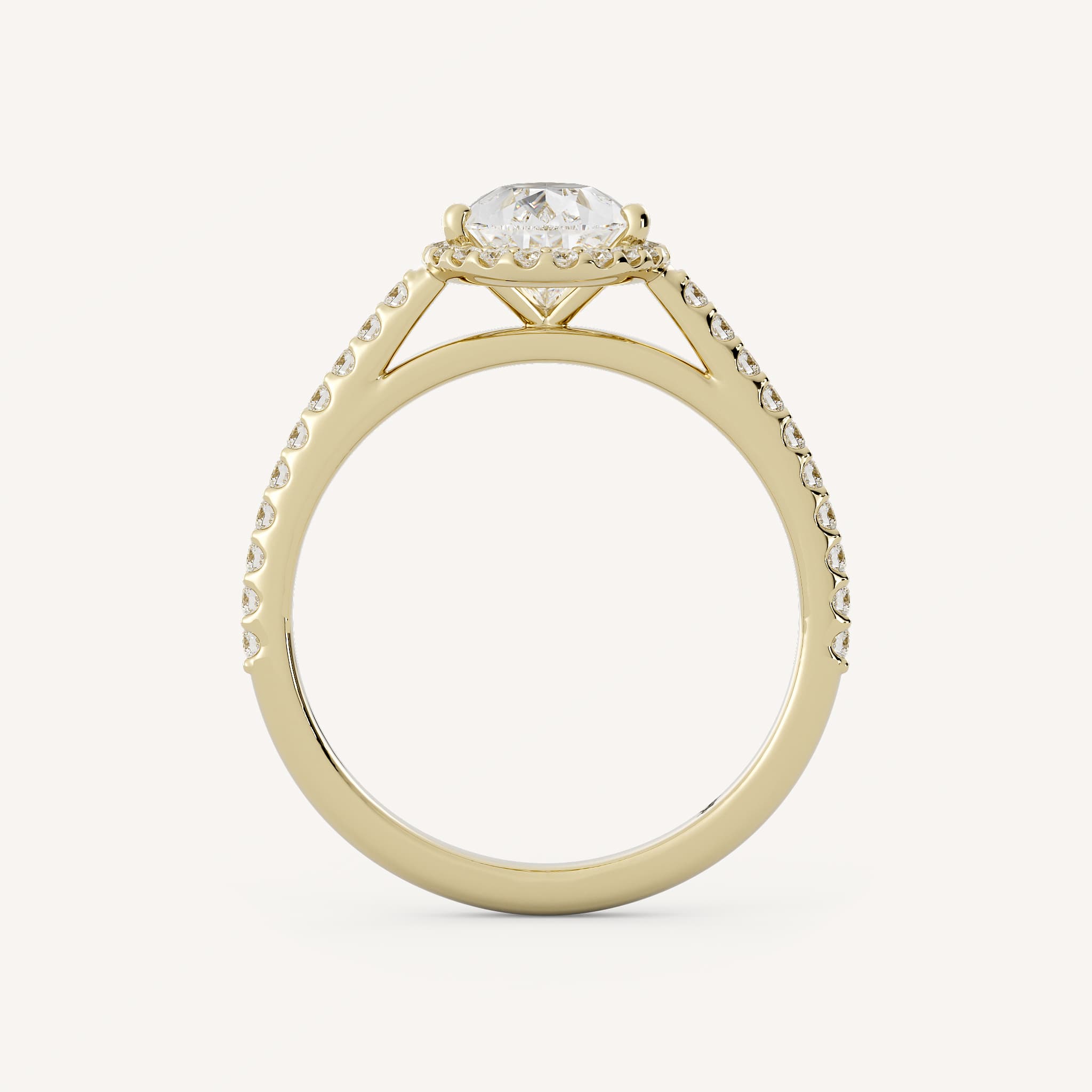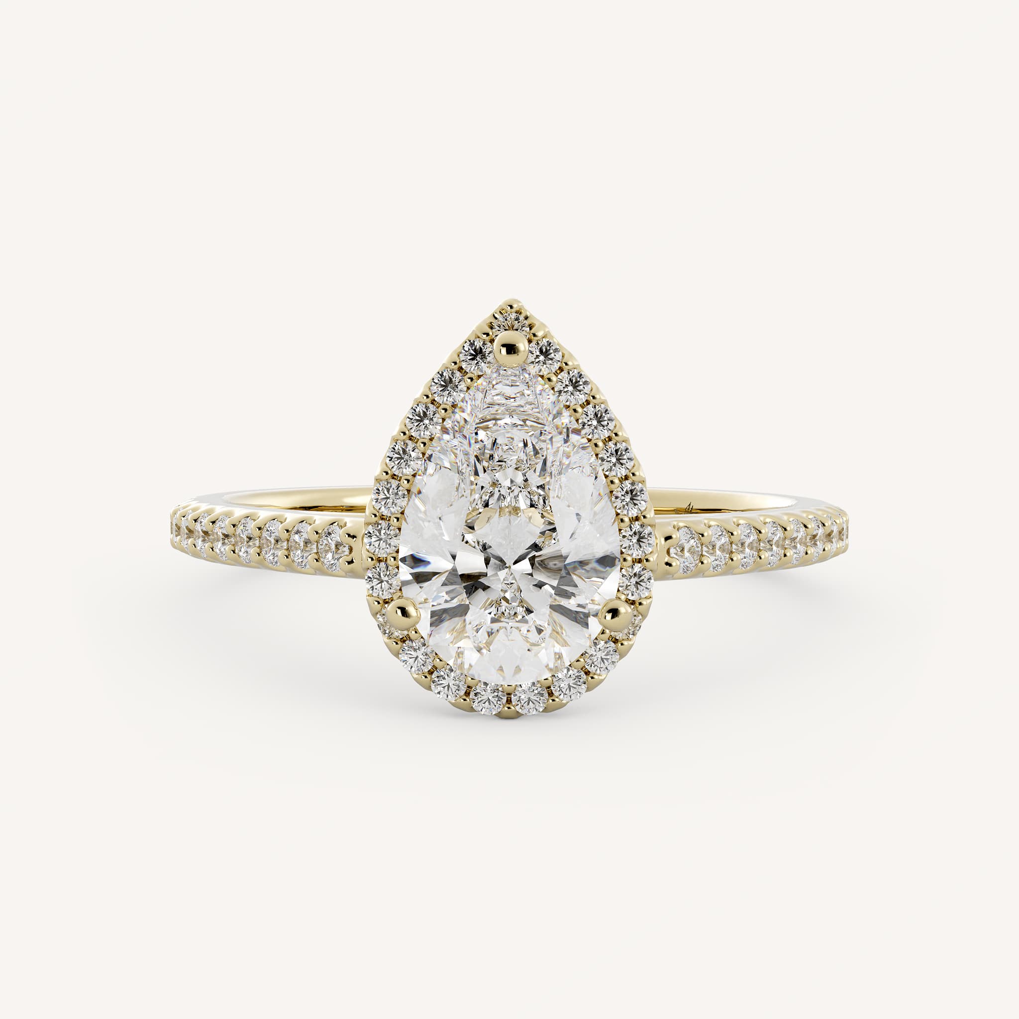 Cambria features a pear center stone with an elegant classic halo set in a cathedral setting with a scalloped prong set shank.