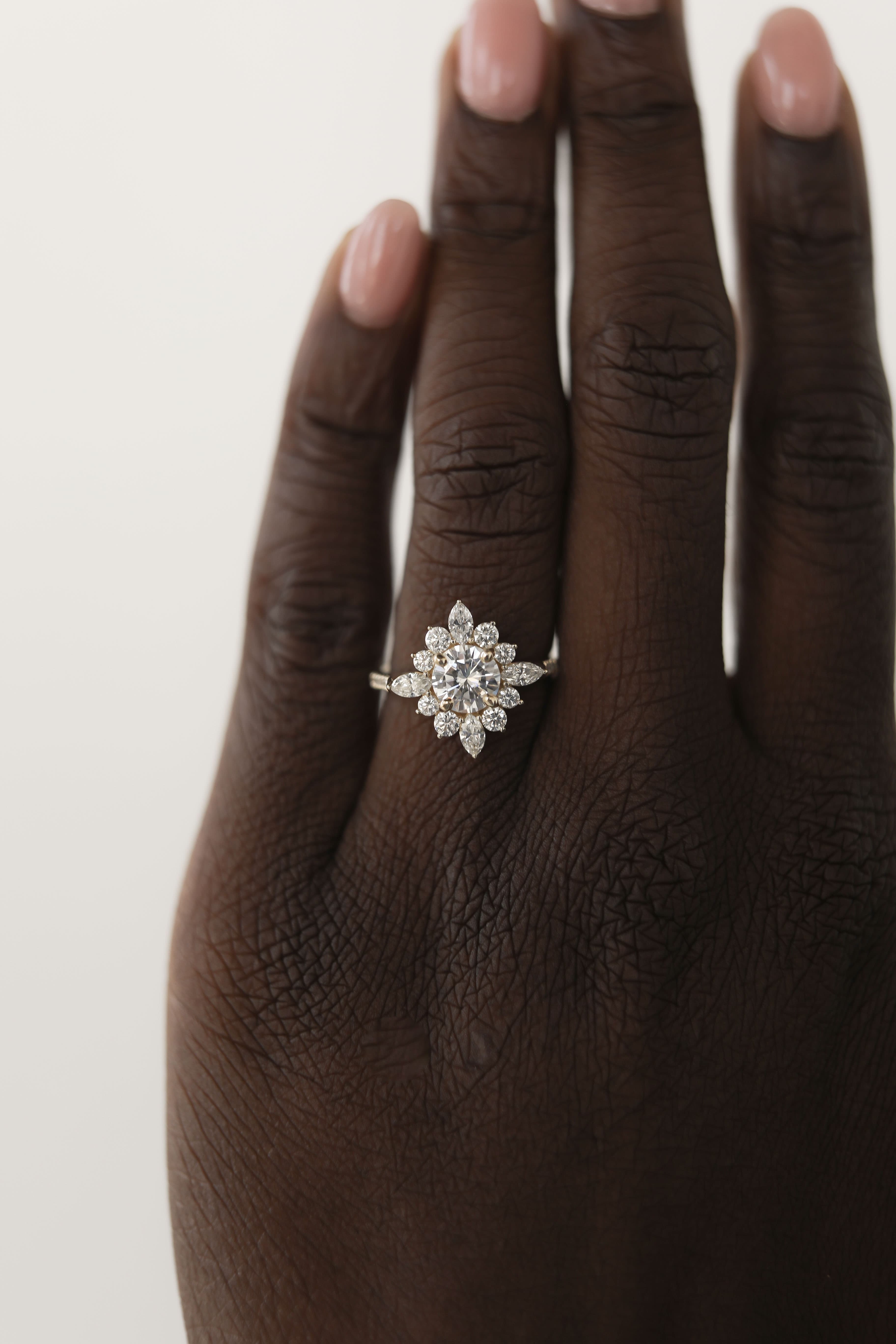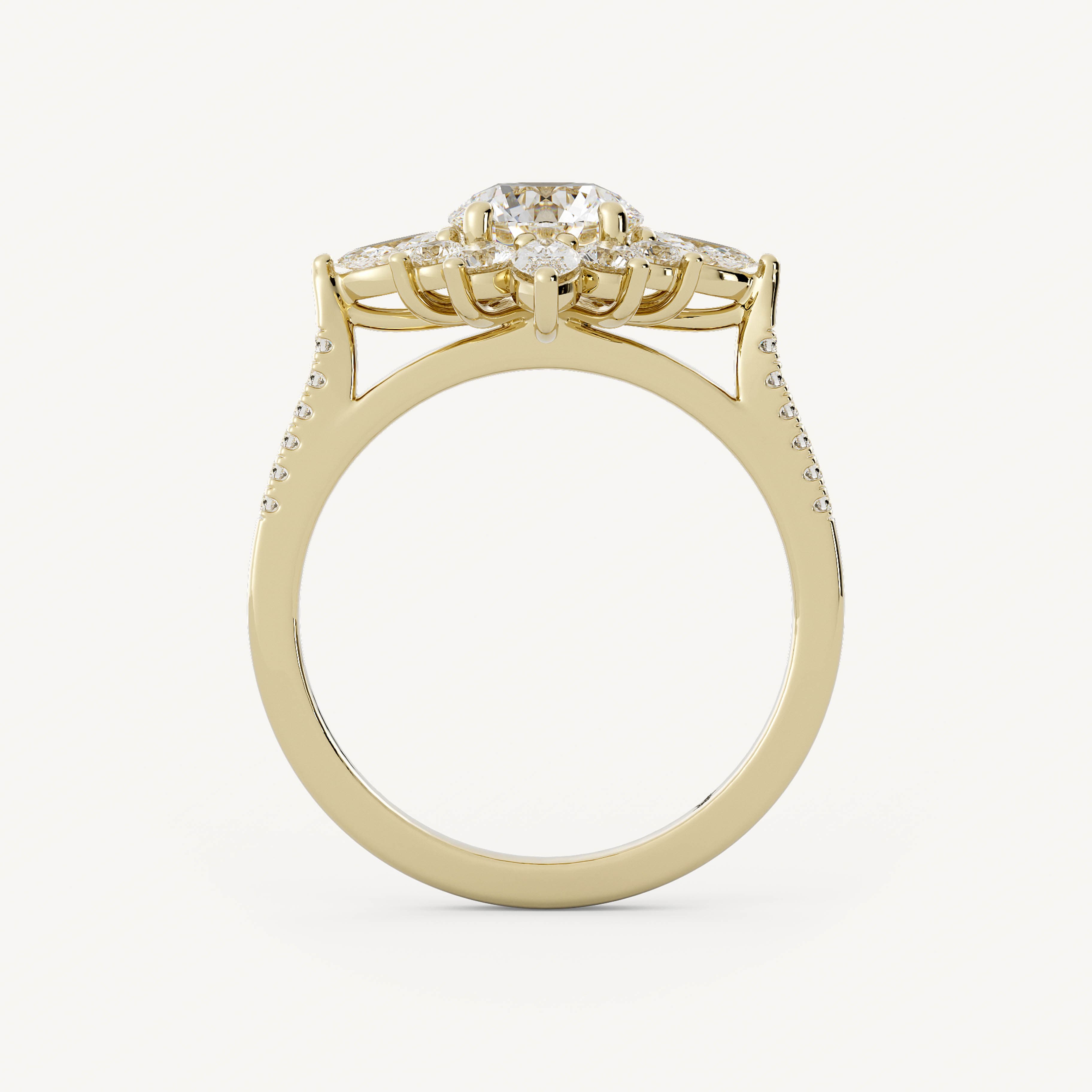 Cambridge features a round center stone with a burst halo of marquise and round stones set in a cathedral setting on a scalloped prong shank.