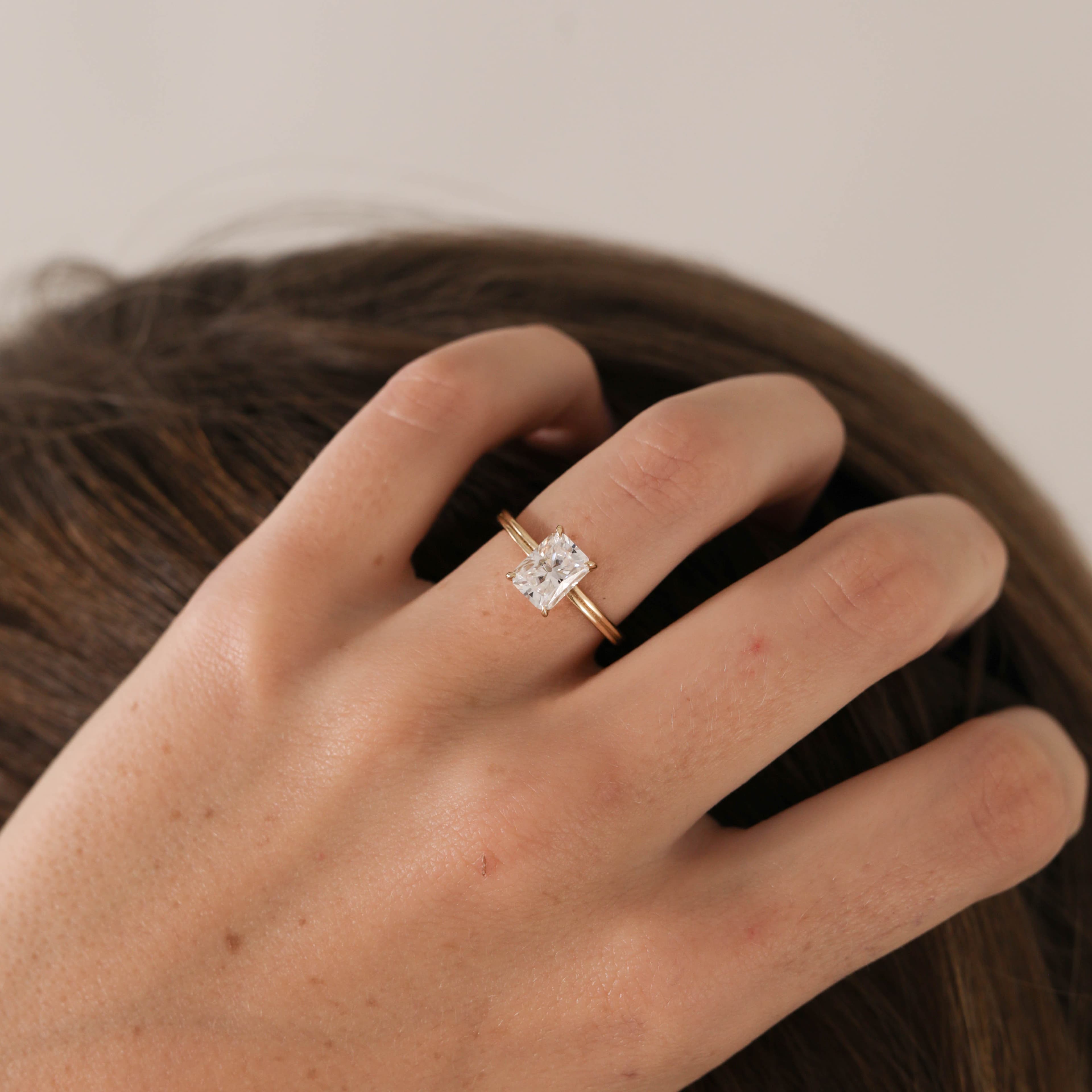 Chapel features an emerald shaped center stone set in a traditional solitaire setting with a striking grooved shank.