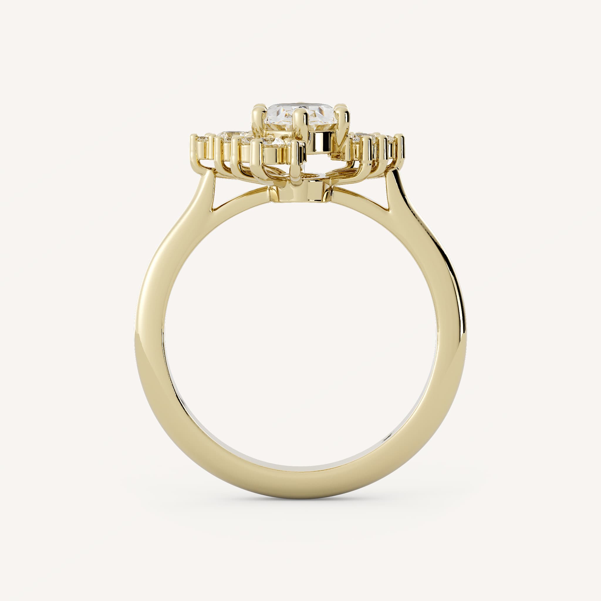 Collins features an oval center stone with an asymmetrical burst halo on a half round shank.