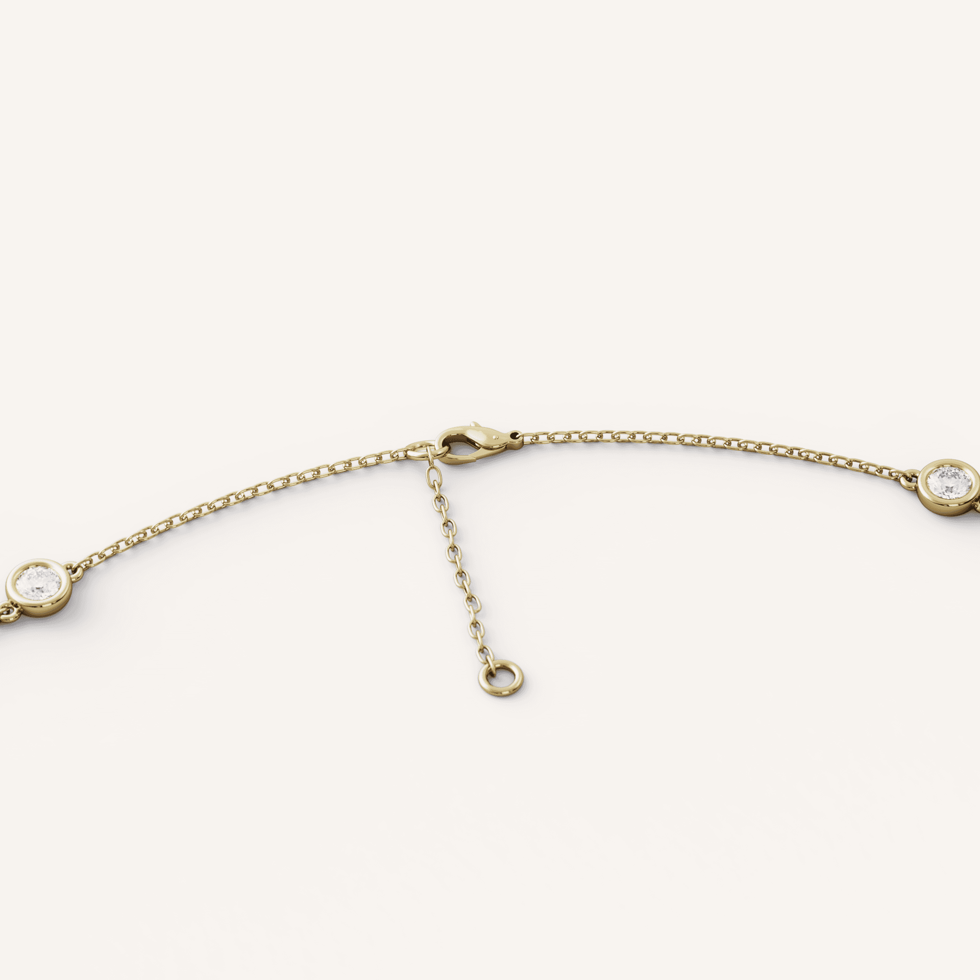 Station Necklace is a lovely 18-inch gold chain with 2 carats of round bezel set lab diamonds spaced along the chain complete with a lobster clasp.