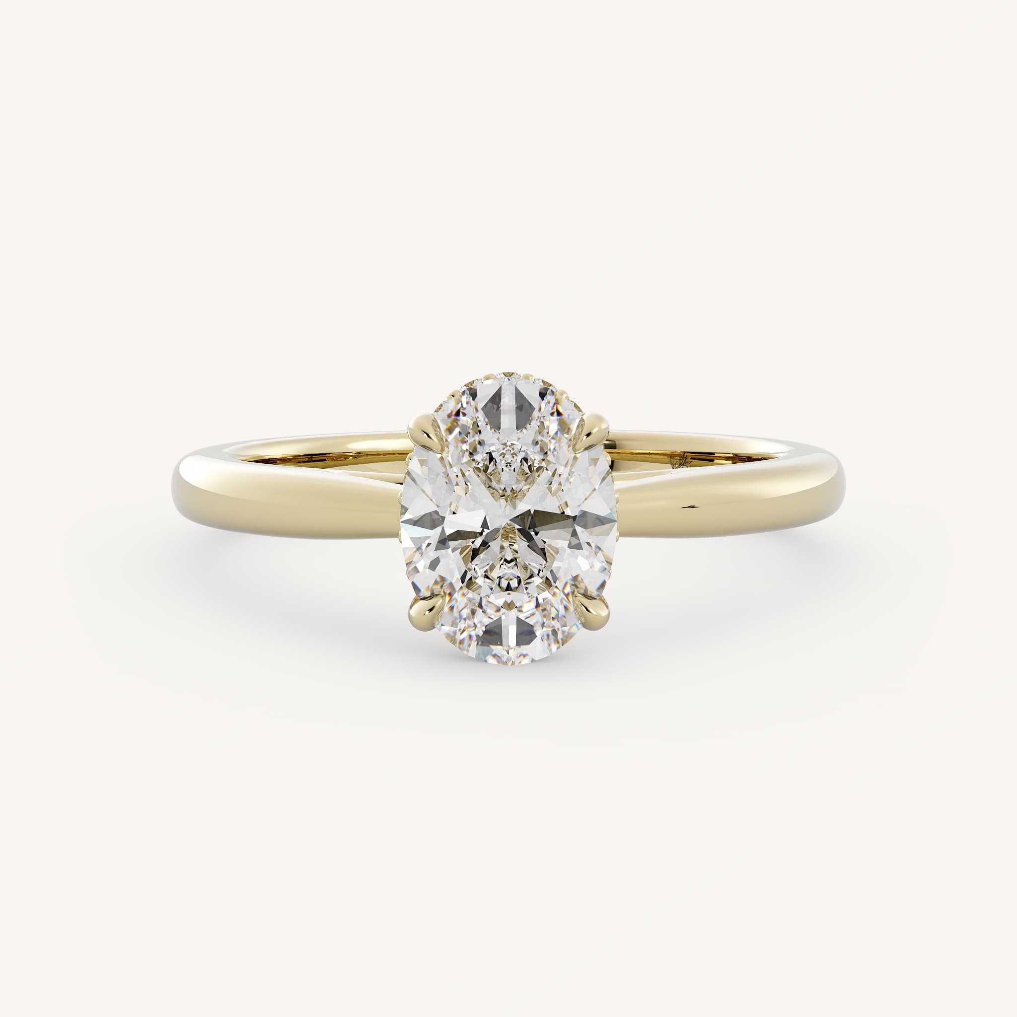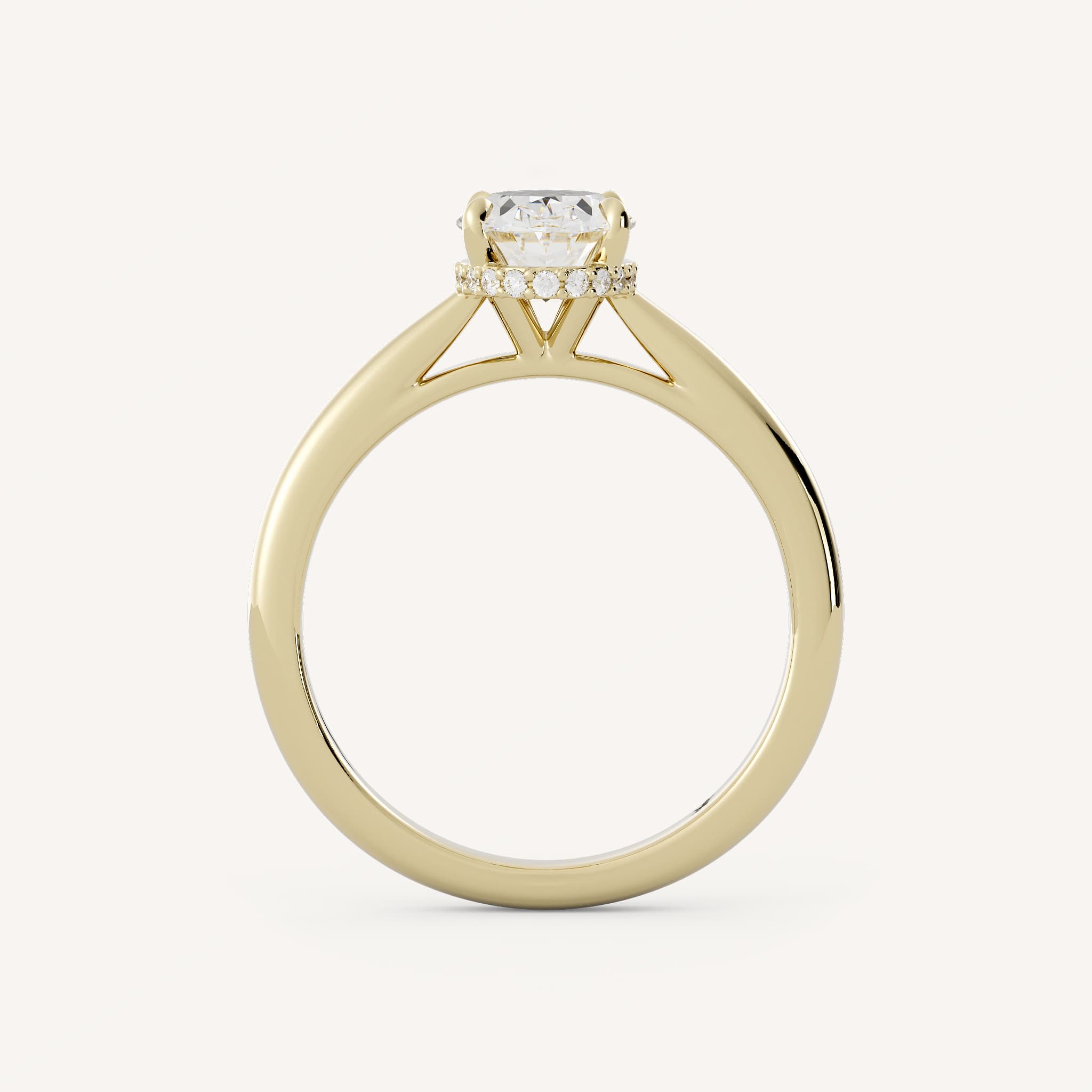 Elise features an elegant oval center stone set in a cathedral solitaire setting with a delicate hidden halo that wraps around the prongs on a half round shank.