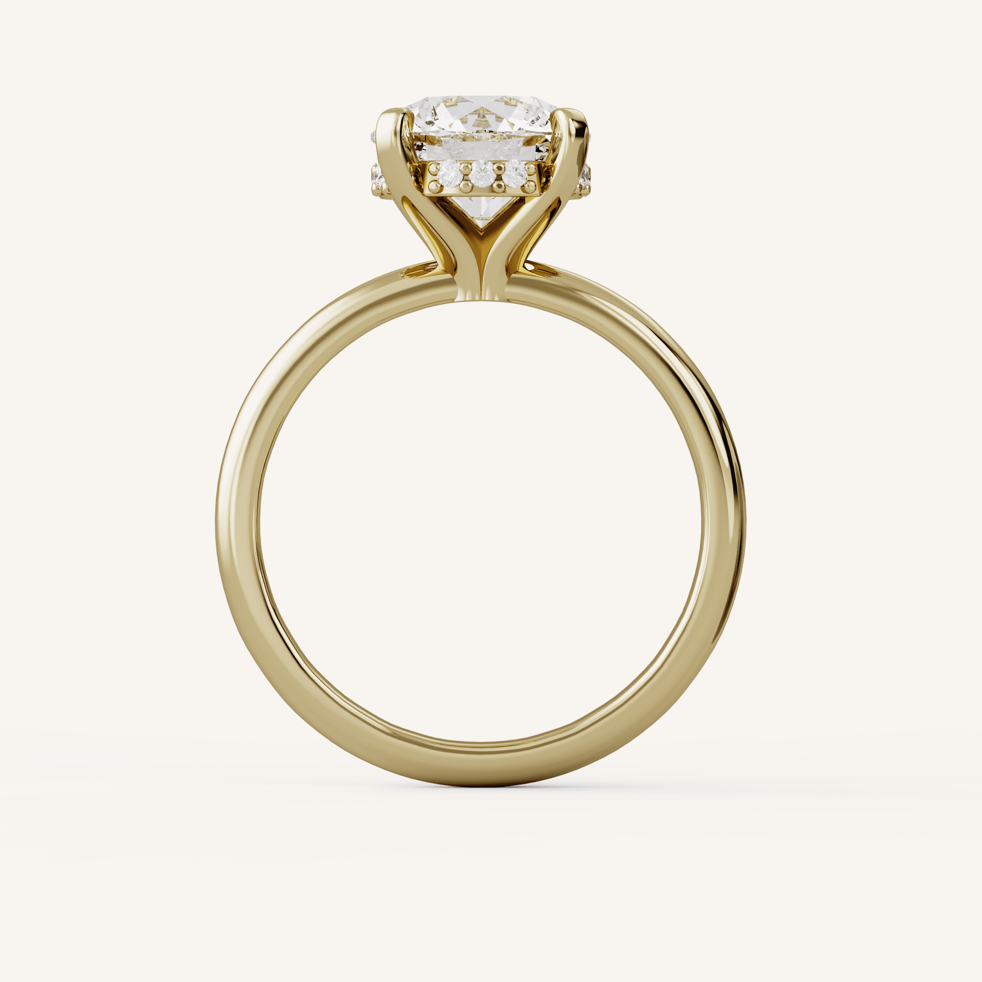 Emma features a classic round center stone with a timeless hidden halo set in a traditional solitaire setting on a half round shank.