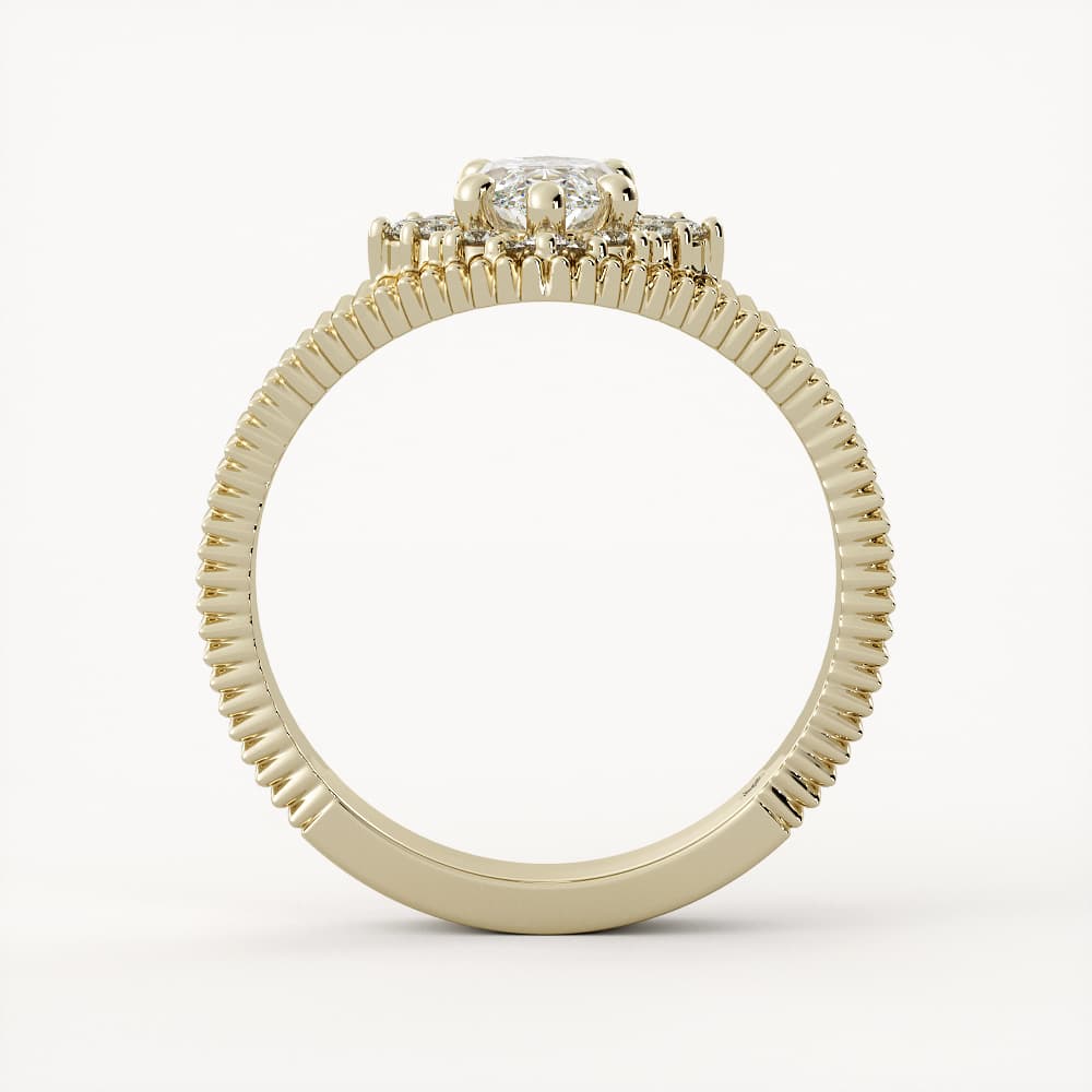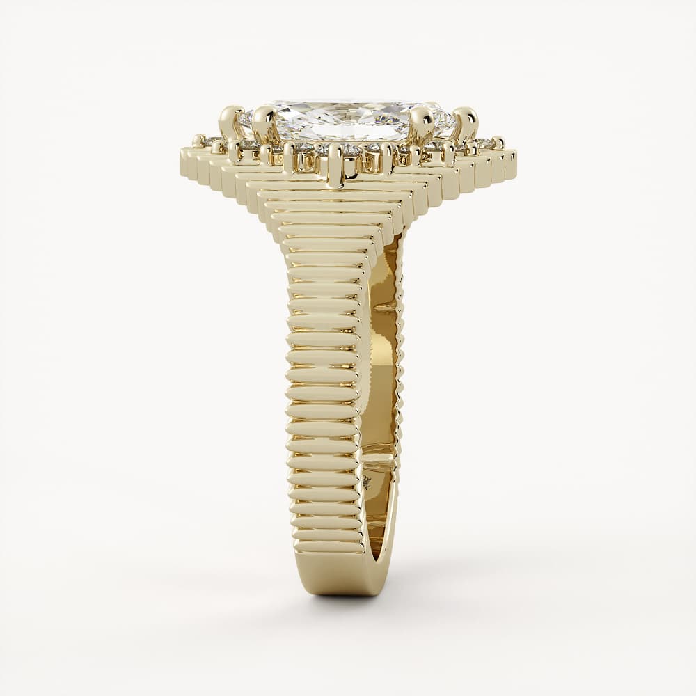 Essex emerges as a study in harmony, uniting elements of our Edison and Emerson rings into a singular vintage expression. A 10x5mm marquise center stone rests at its peak, framed by an adapted Emerson halo of round accent stones that encircle it with reverence. The tapered, grooved band narrows gracefully from approximately 14.7mm to 3mm, allowing the design to sit flush against the finger. Textured gold evokes the grit of lived experience, the rises and falls that shape a life, while the diamond stands as a symbol of the blessings that come with endurance along the journey.