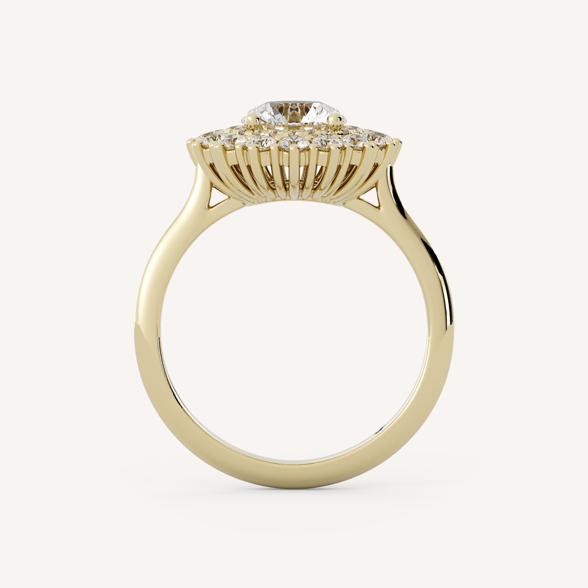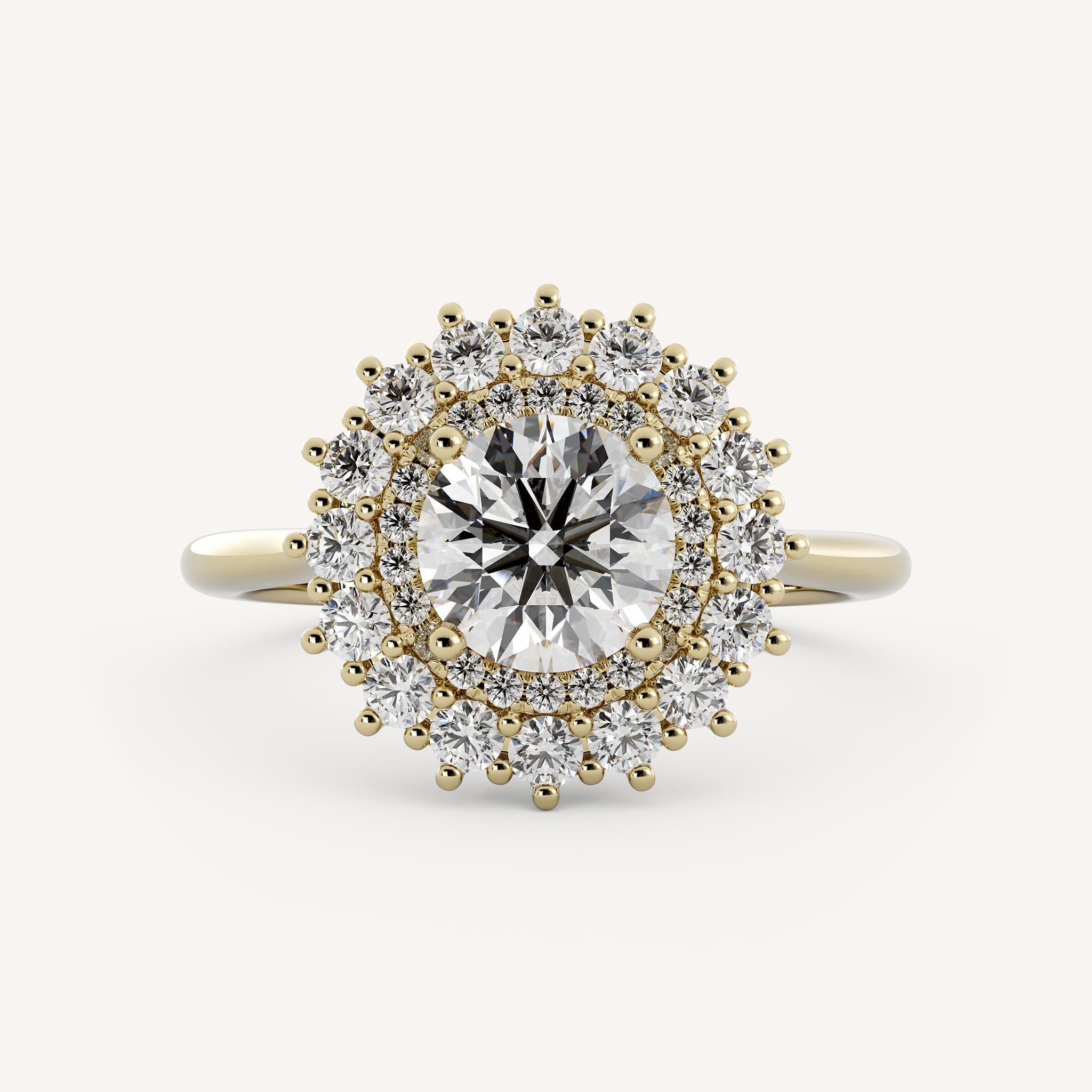 Etta features a round center stone with in a stunning double burst halo set in a cathedral basket setting on a half round shank.