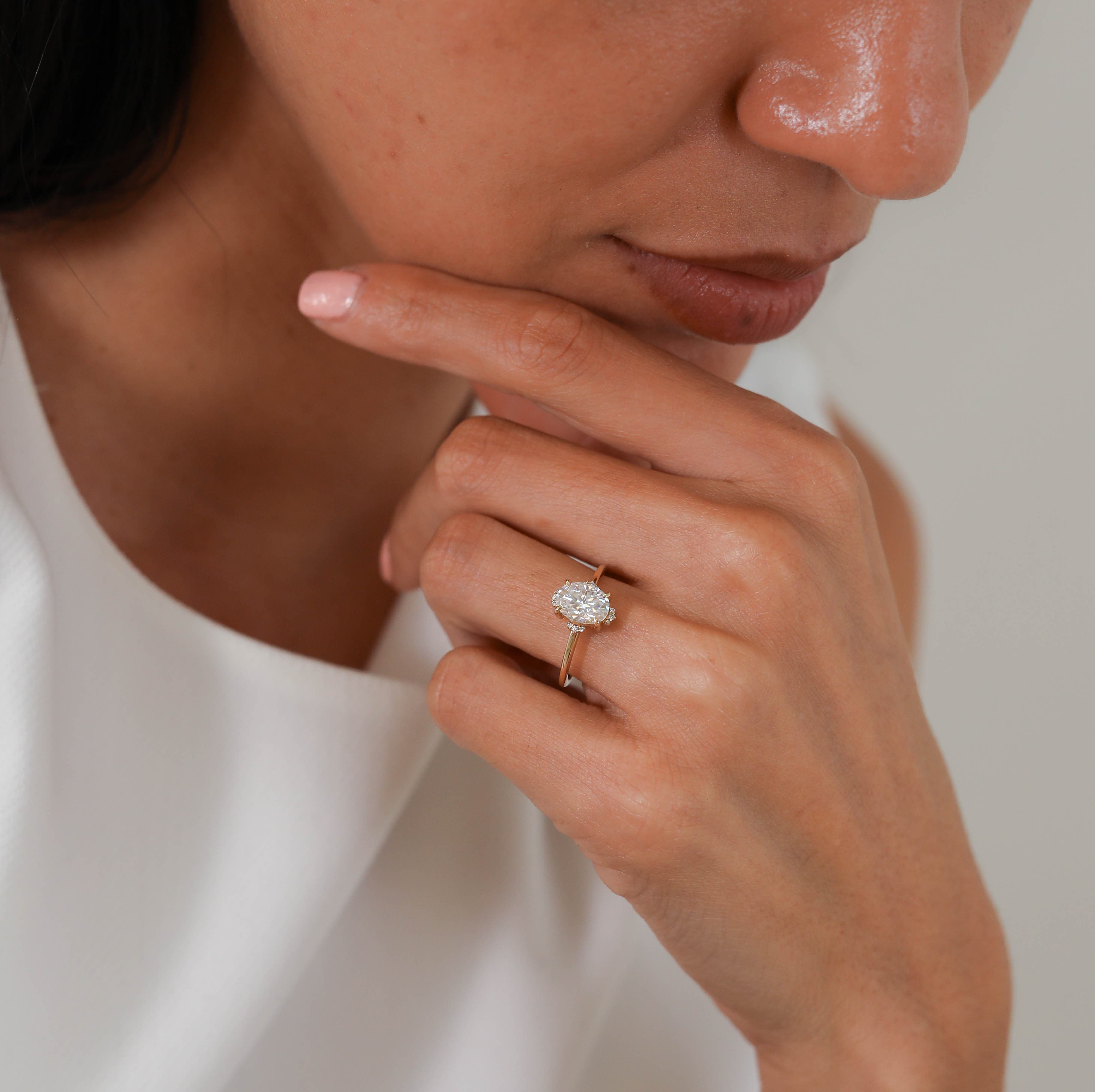 Gemma features an Oval shaped center stone set with claw prongs and clusters of three round accent stones on a half round shank.