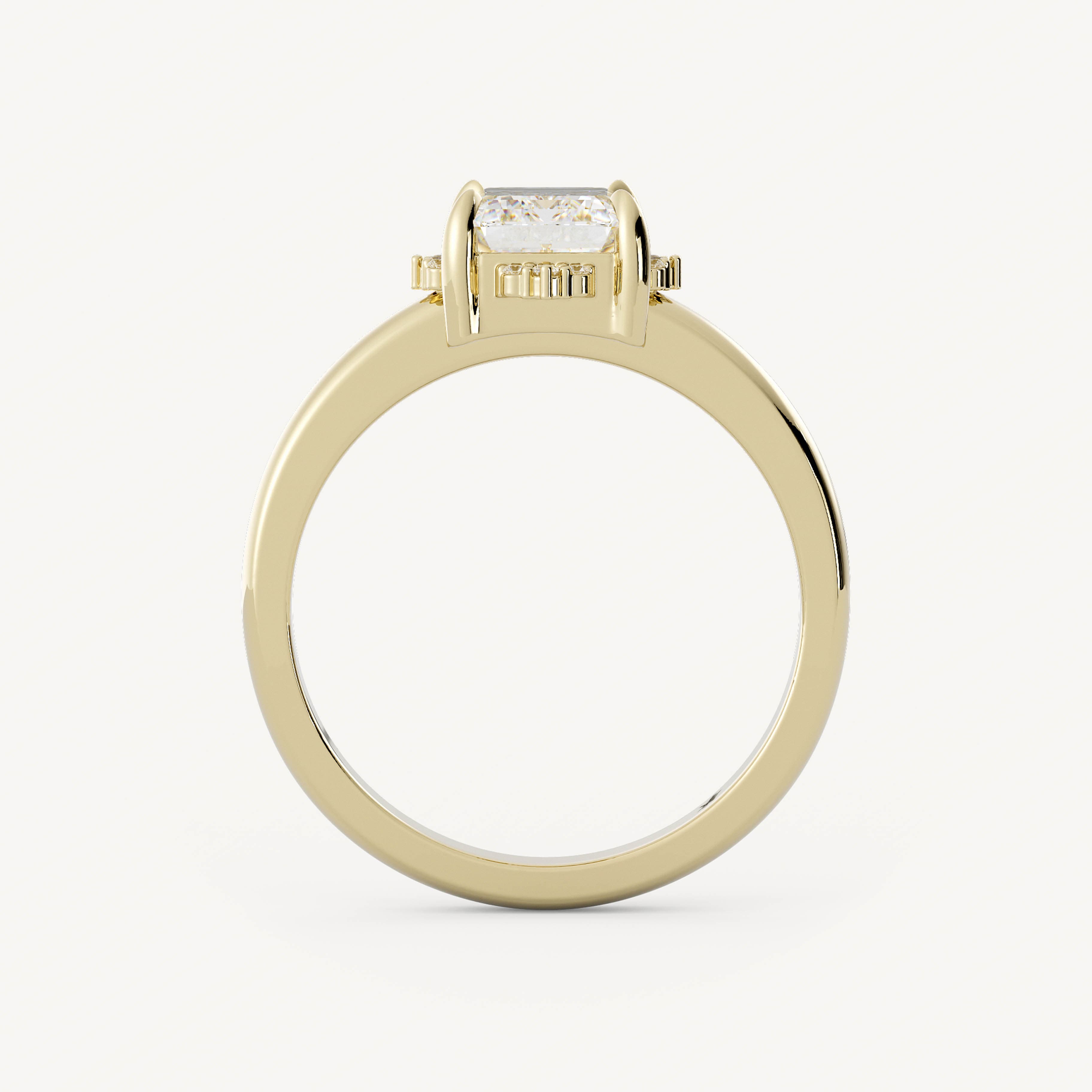 Genevieve features an emerald shaped center stone set with claw prongs and clusters of three round accent stones on a half round shank.