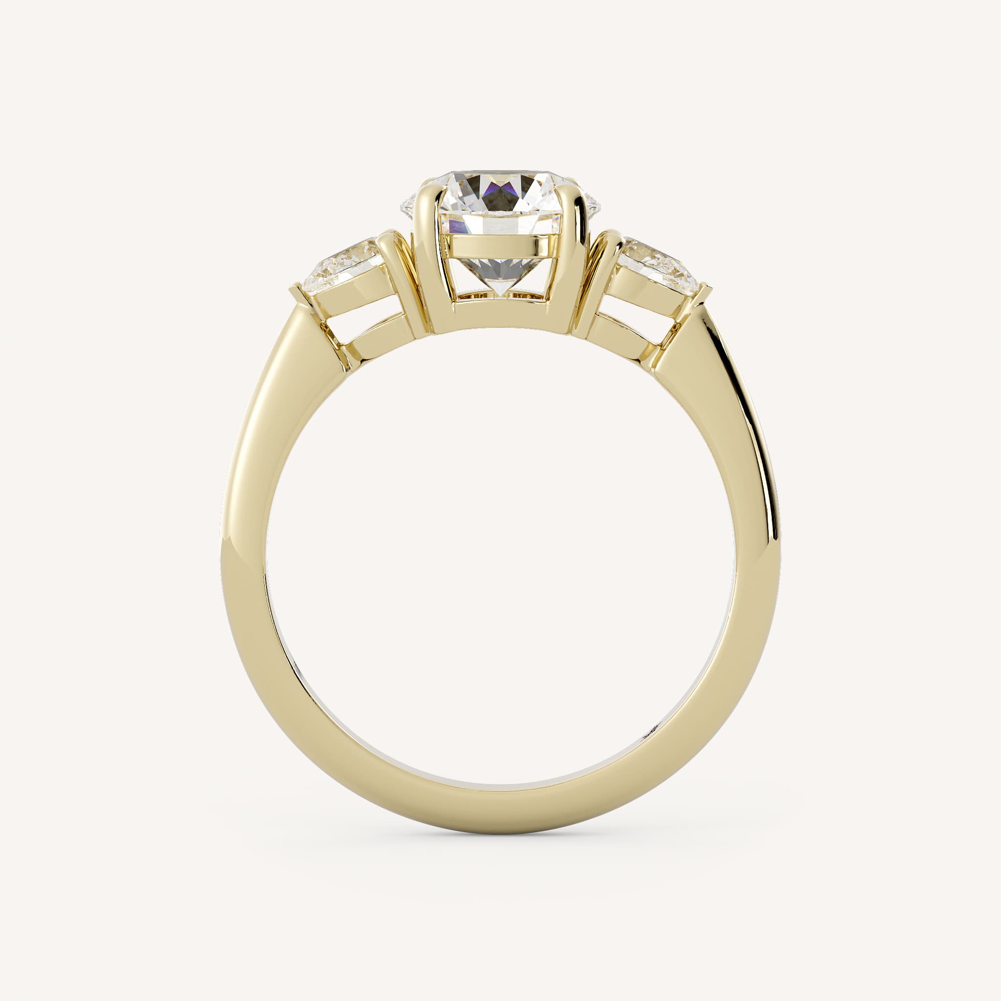 Holland features a classic round center stone with two pear accent stones in a three stone basket setting on a half round shank.