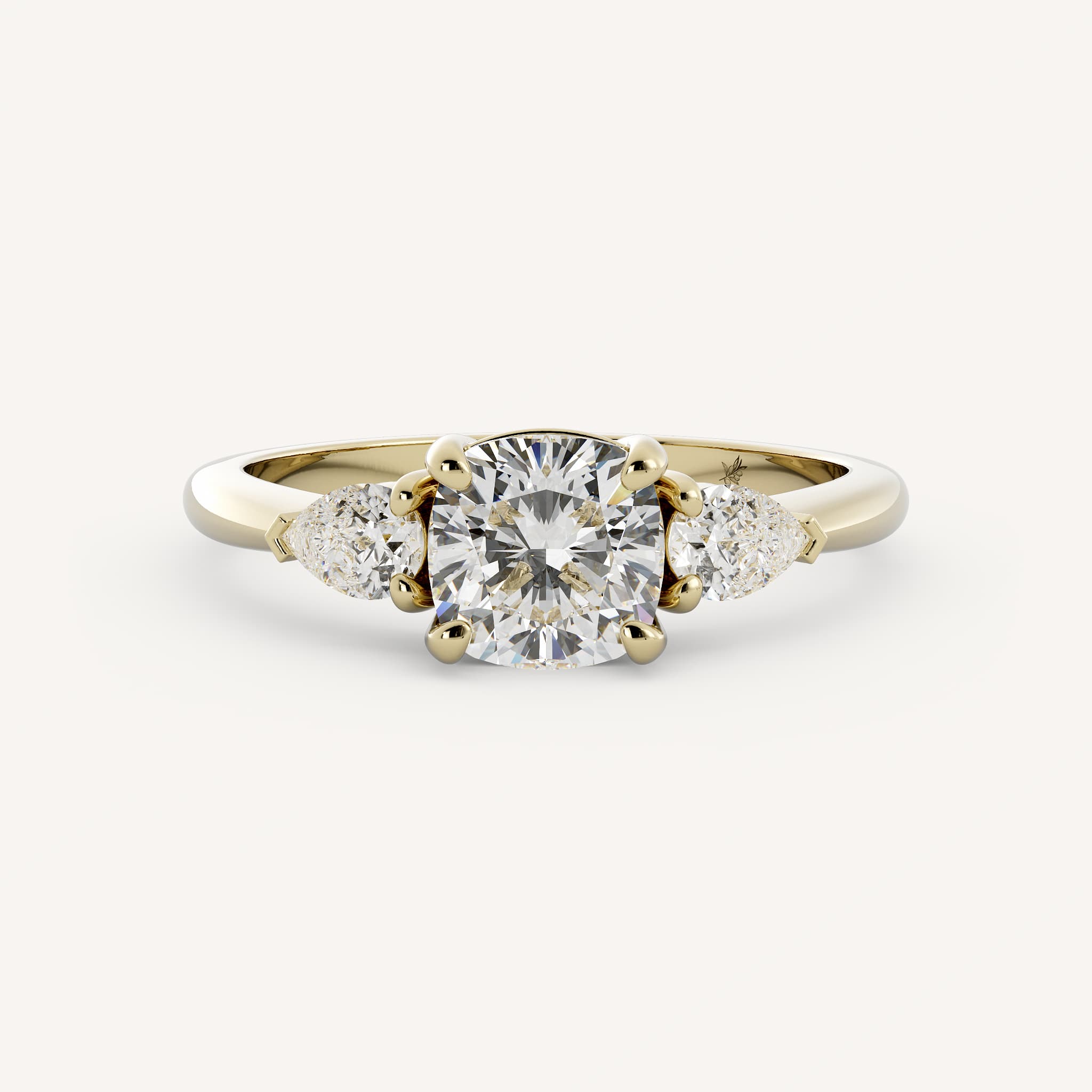 Hollis features a stunning cushion center stone with two pear side stones set in a three stone basket on a half round shank.