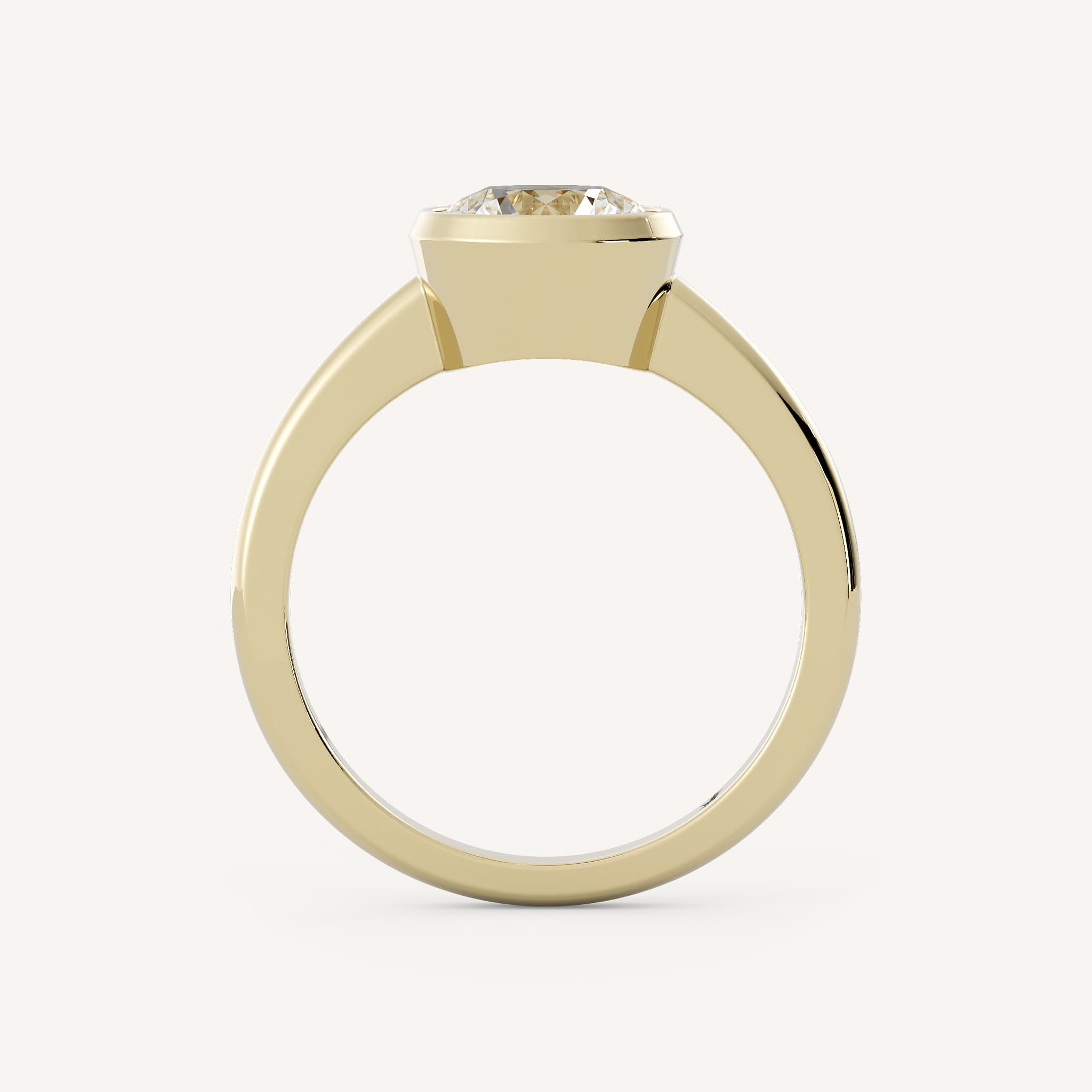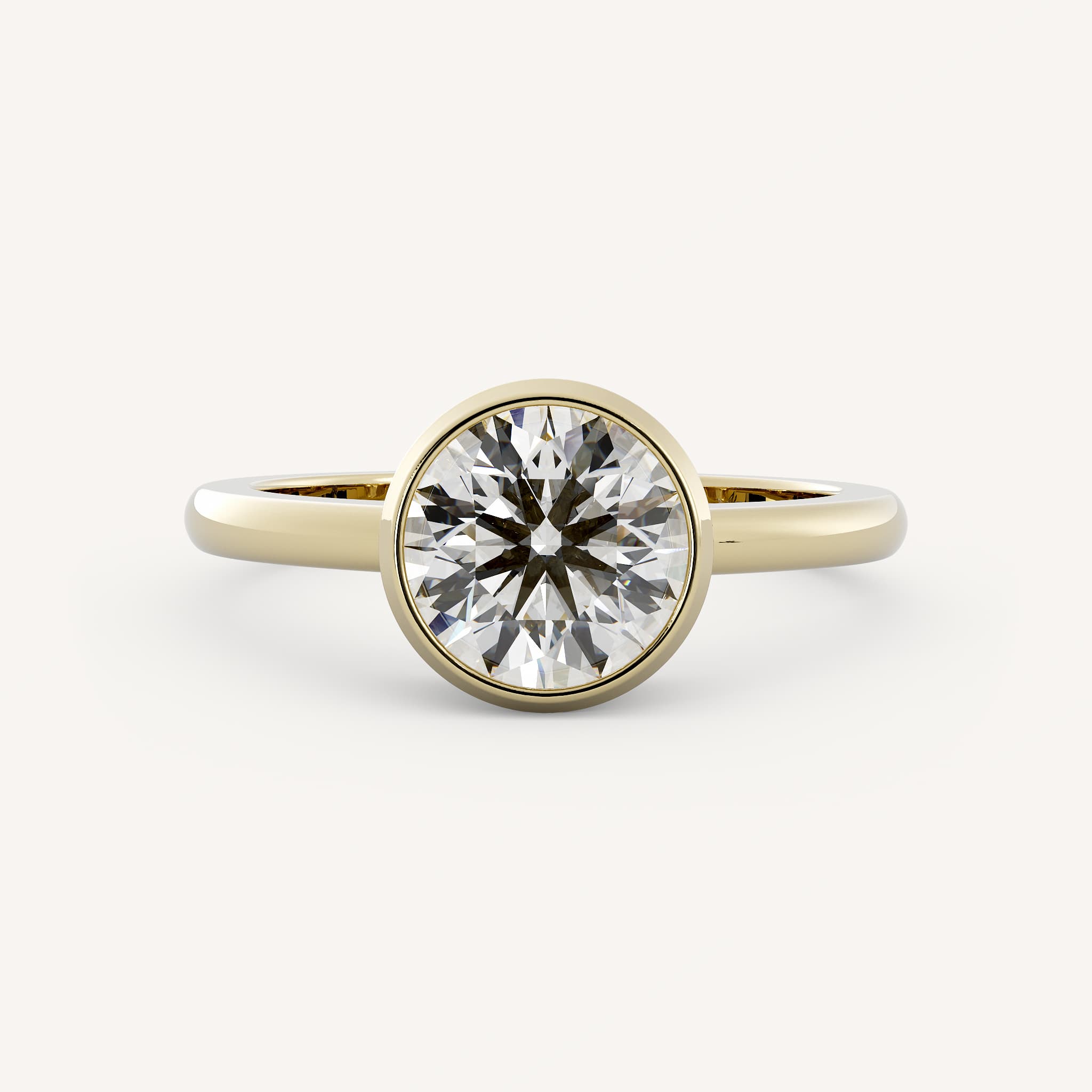 Holmes features a bold round center stone set in a bezel setting on a half round shank.
