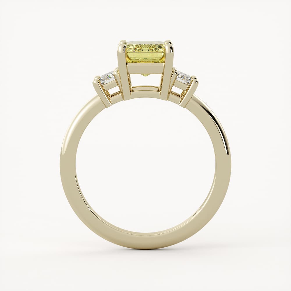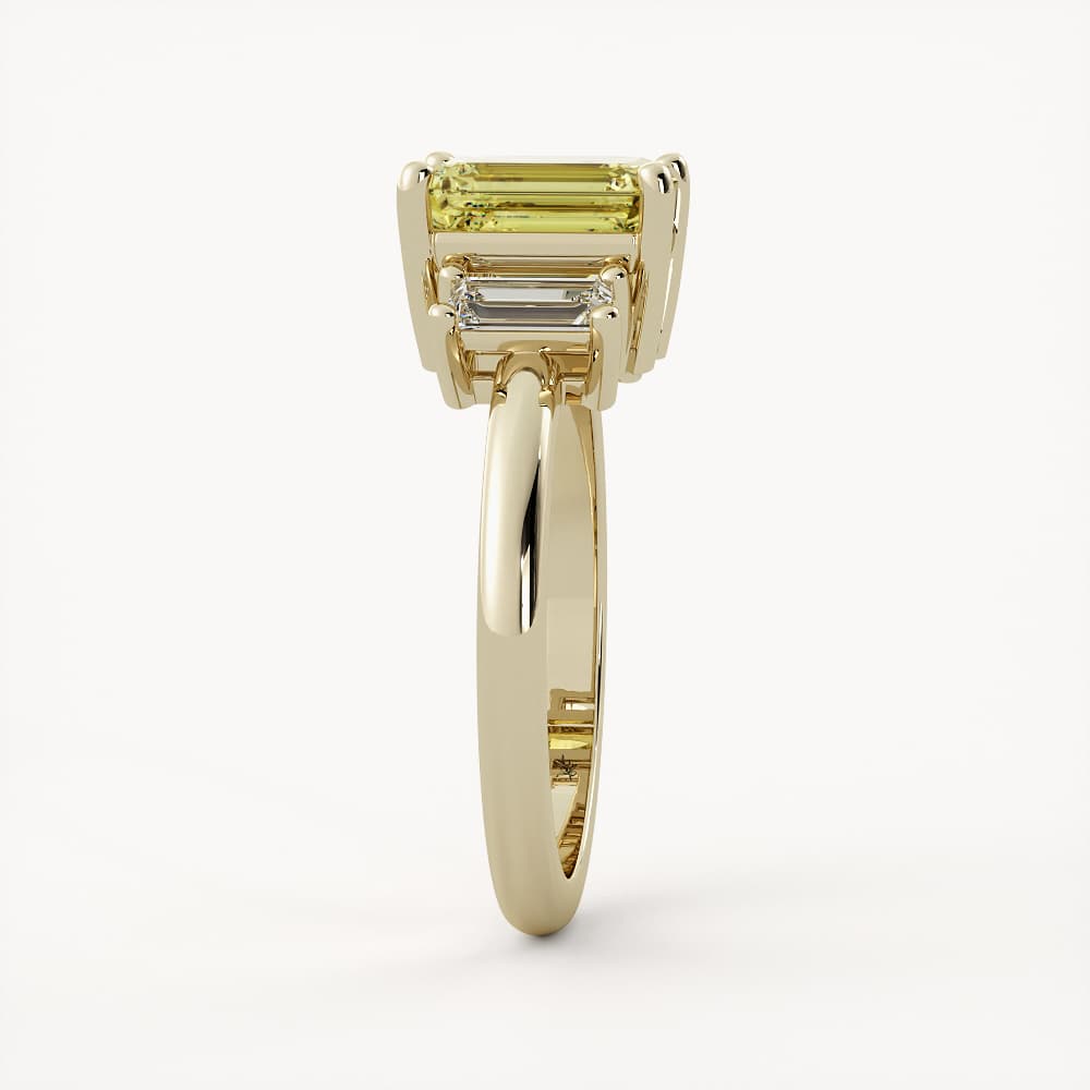 The Ives captivates with a vivid 8x6mm emerald cut yellow lab-grown sapphire framed by 5x2.5mm baguette side stones in an elegant basket setting. Set upon a polished half round shank, Ives balances modern radiance with timeless refinement, an unforgettable statement of color and craftsmanship.