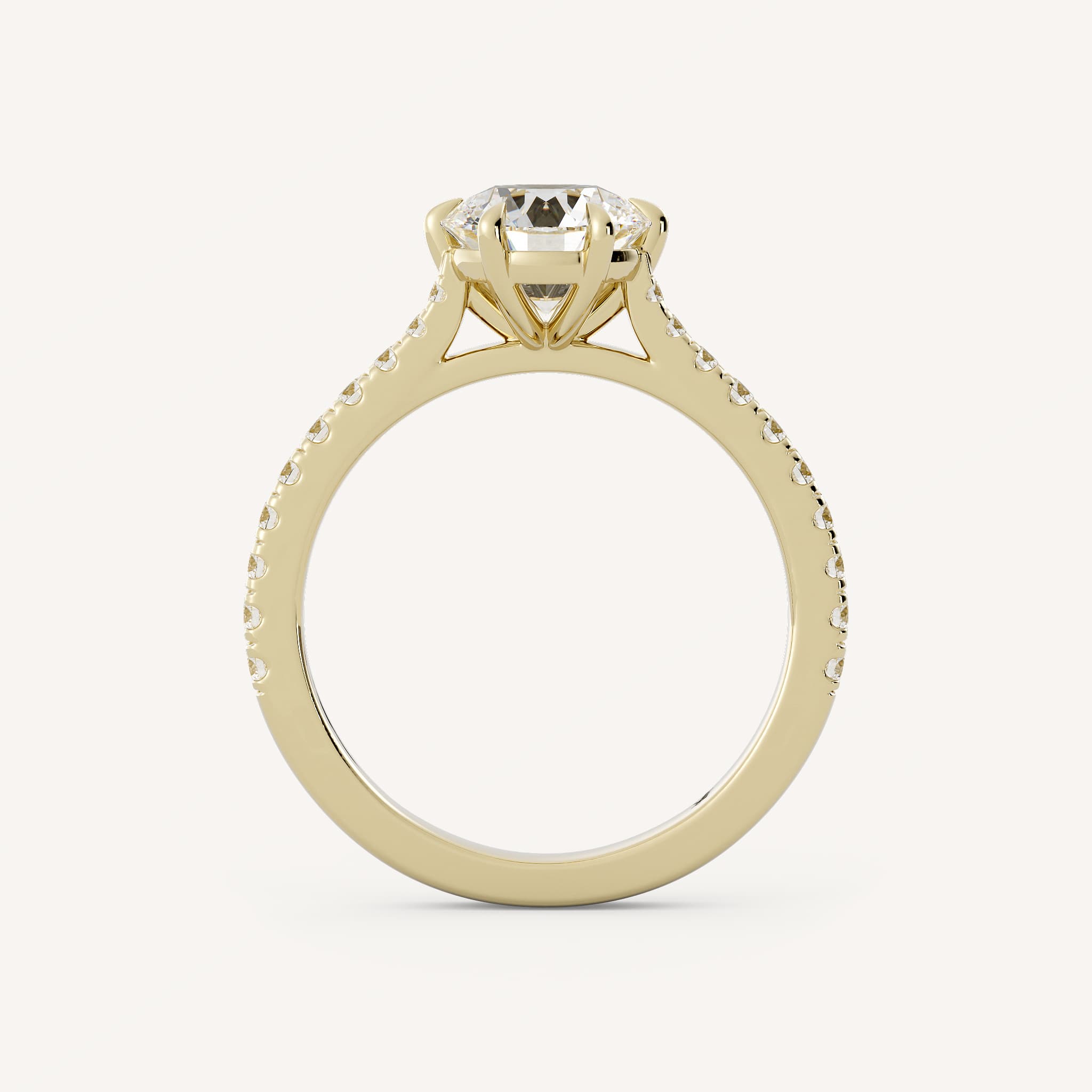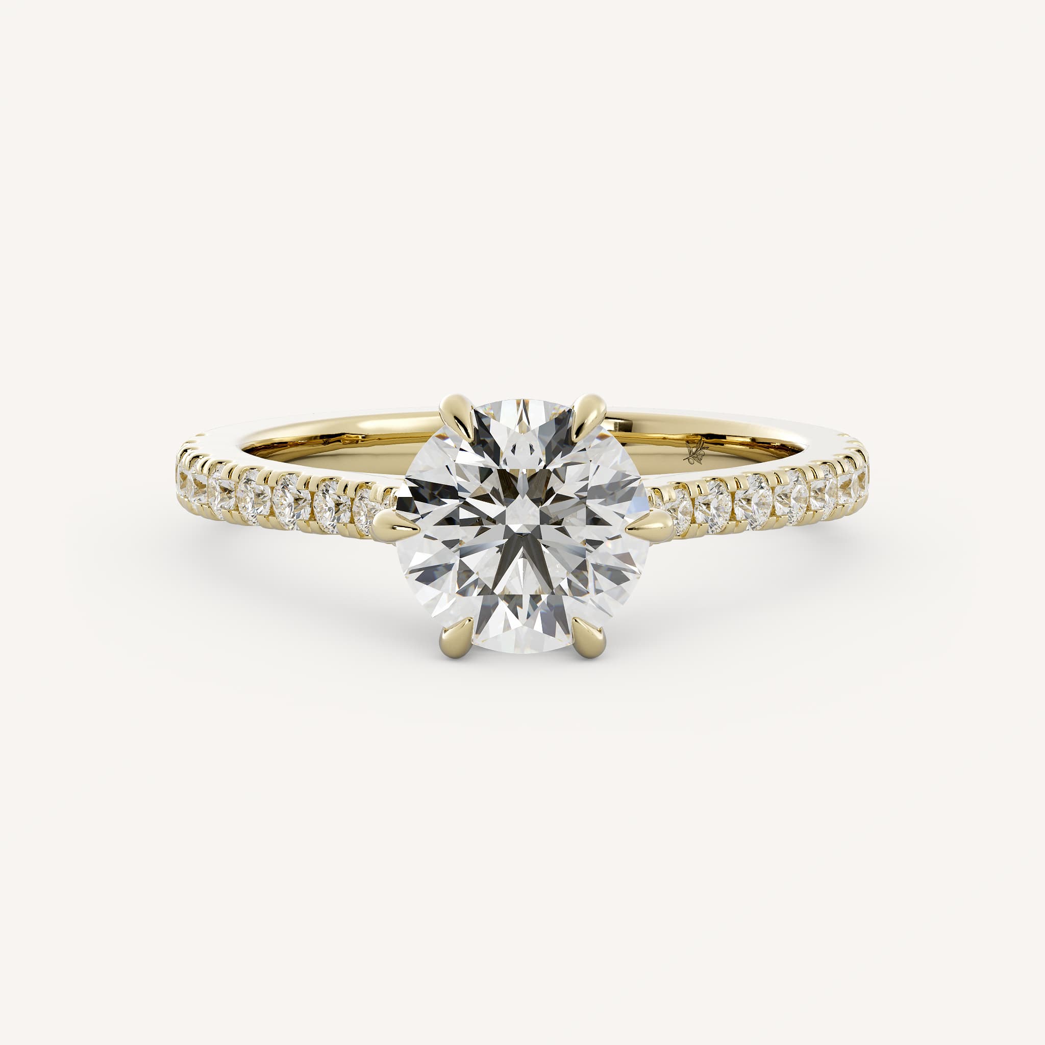 Jacie features a round center stone set in a traditional solitaire setting with six claw prongs on a scalloped prong shank.