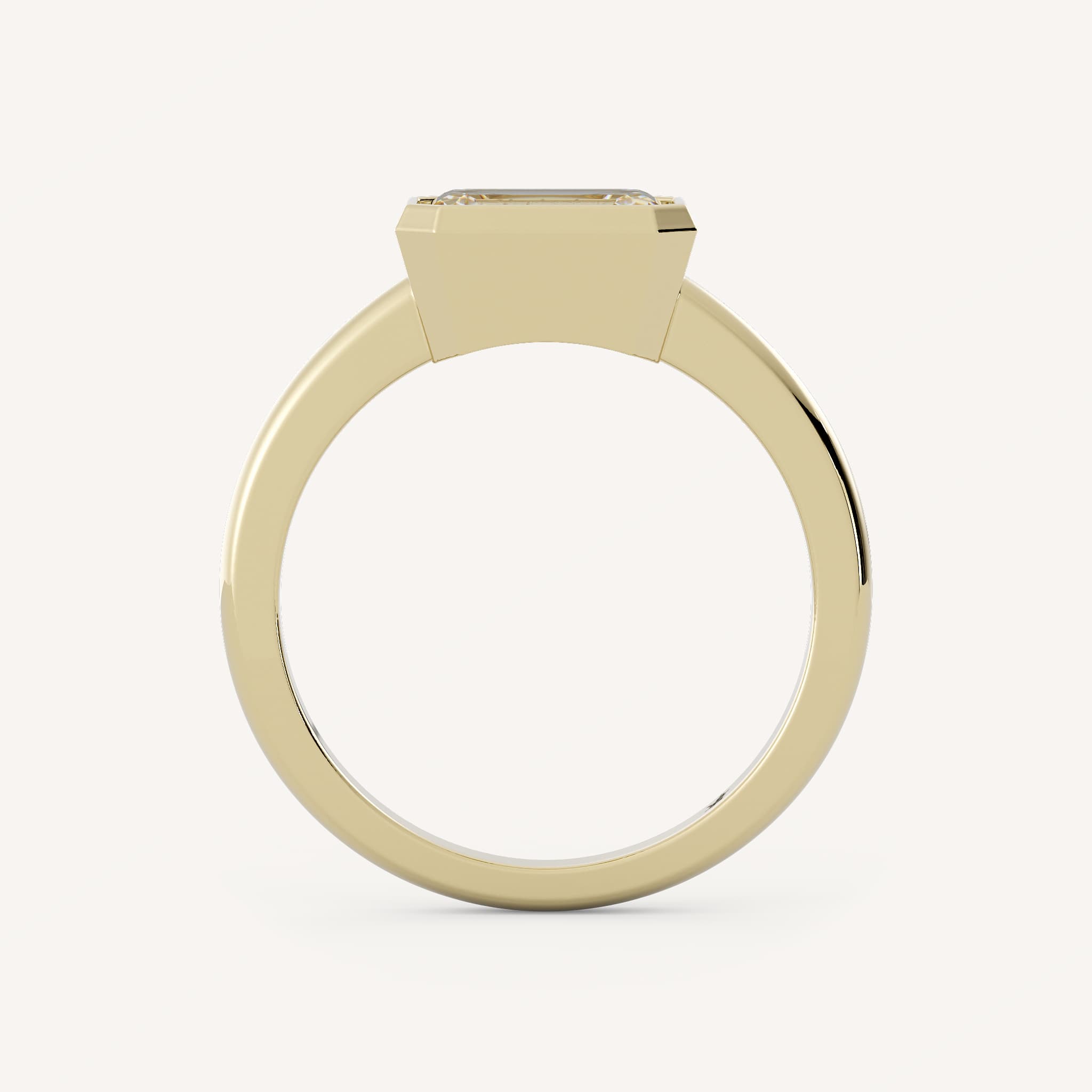 James features a beautiful east-west bezel set emerald shaped center stone on a half round shank.