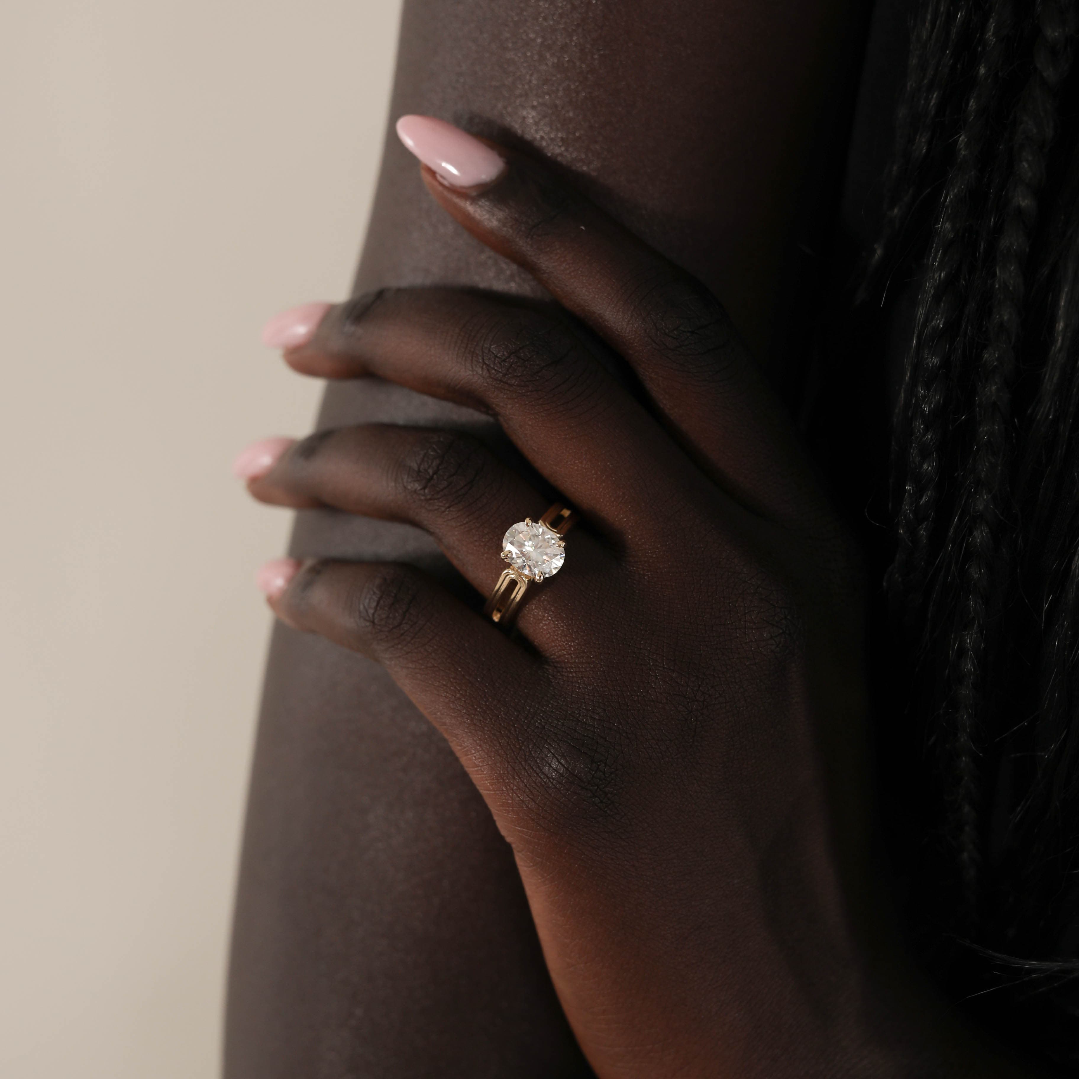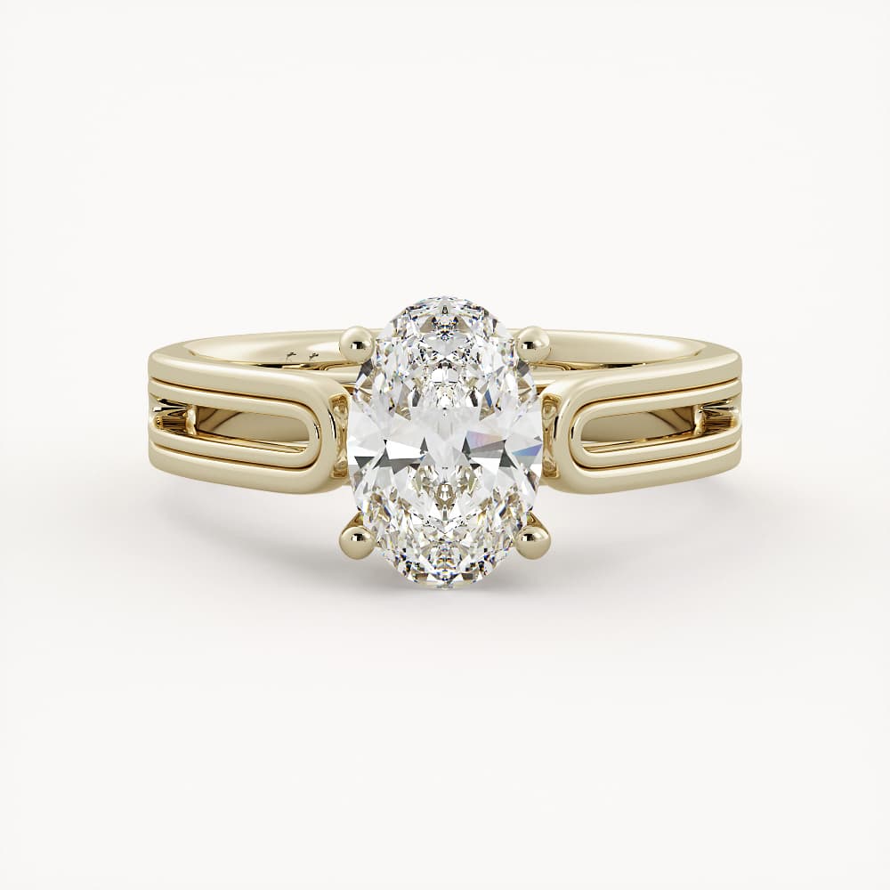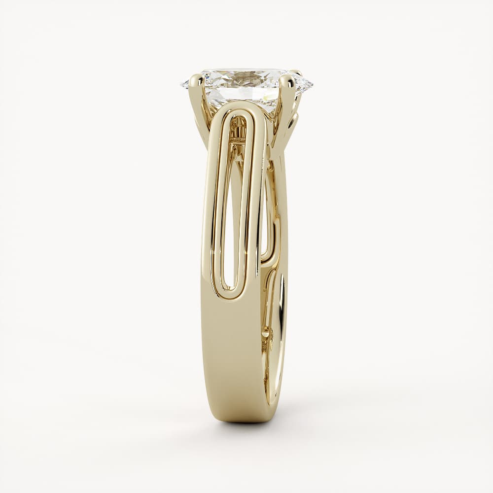A golden masterpiece, Jeanne features a solitaire with hidden details, including a romantic side cutout and gold details on the head. Jeanne has a raised setting that pairs best with straight bands, but could also sit lovely with contour bands.