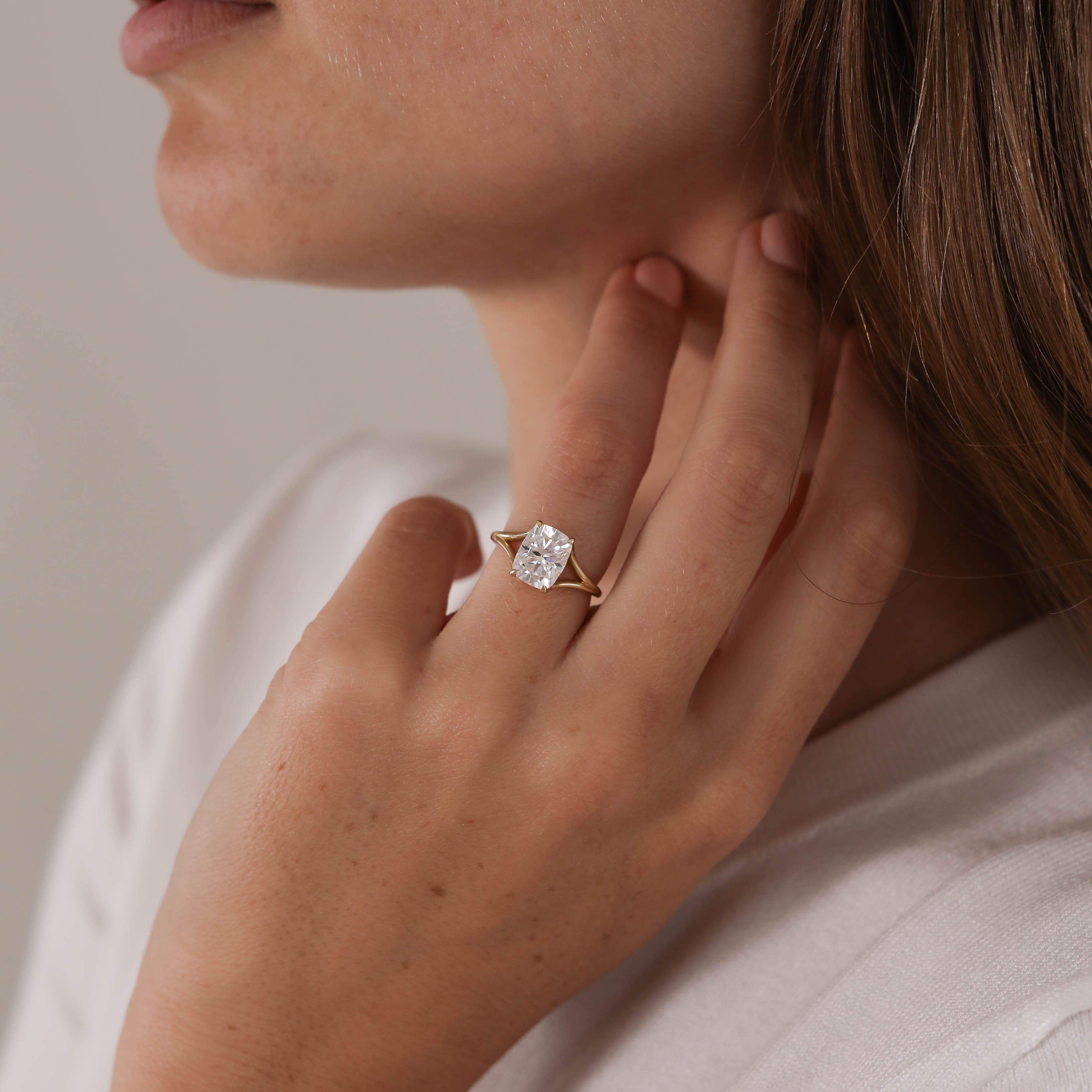 Jude features an elongated cushion center stone set with claw prongs in a dramatic split shank.