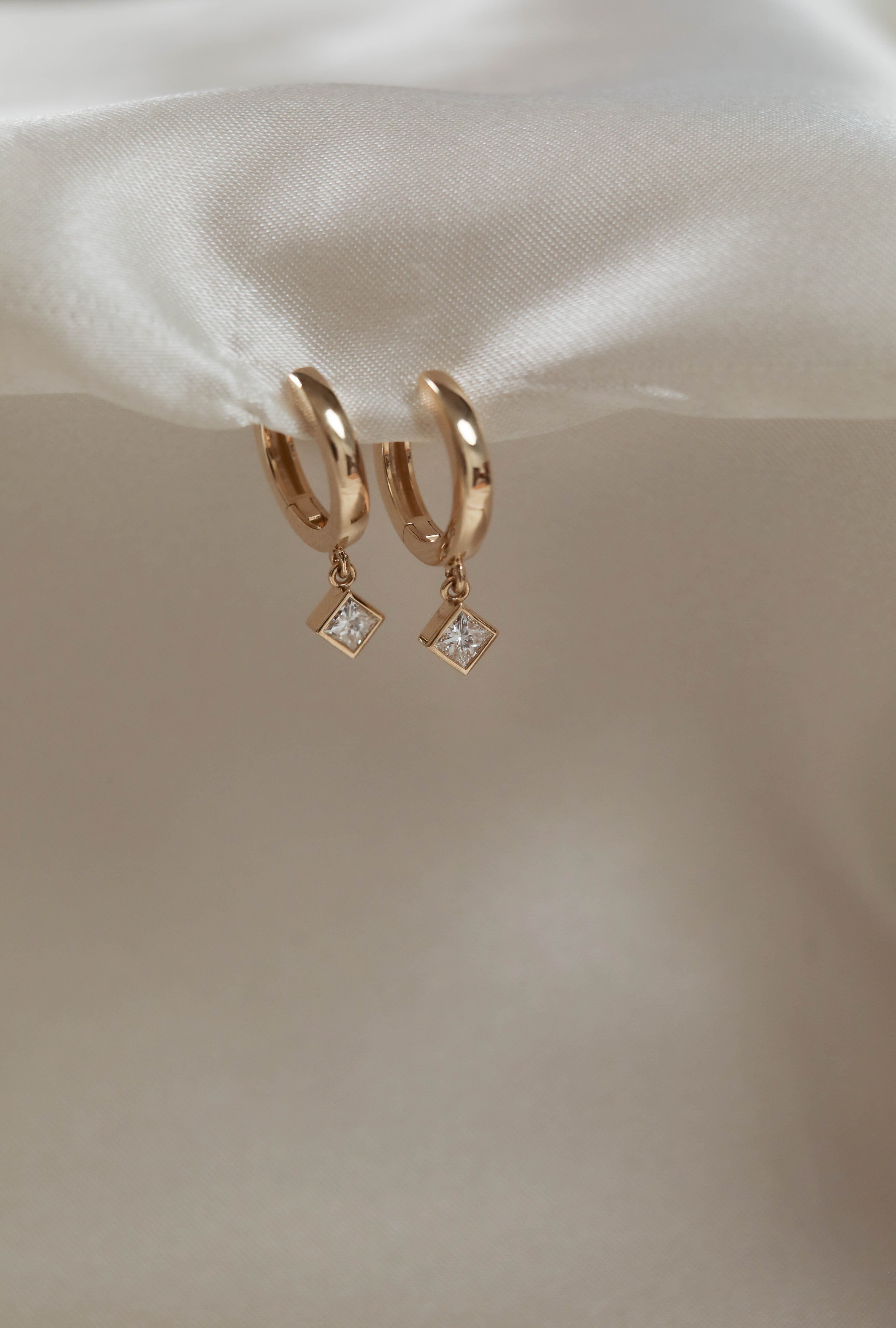 Kite Drop Hoops feature a beautiful gold hoop with a dangling kite set princess diamonds in a bezel on a hinged post closure.