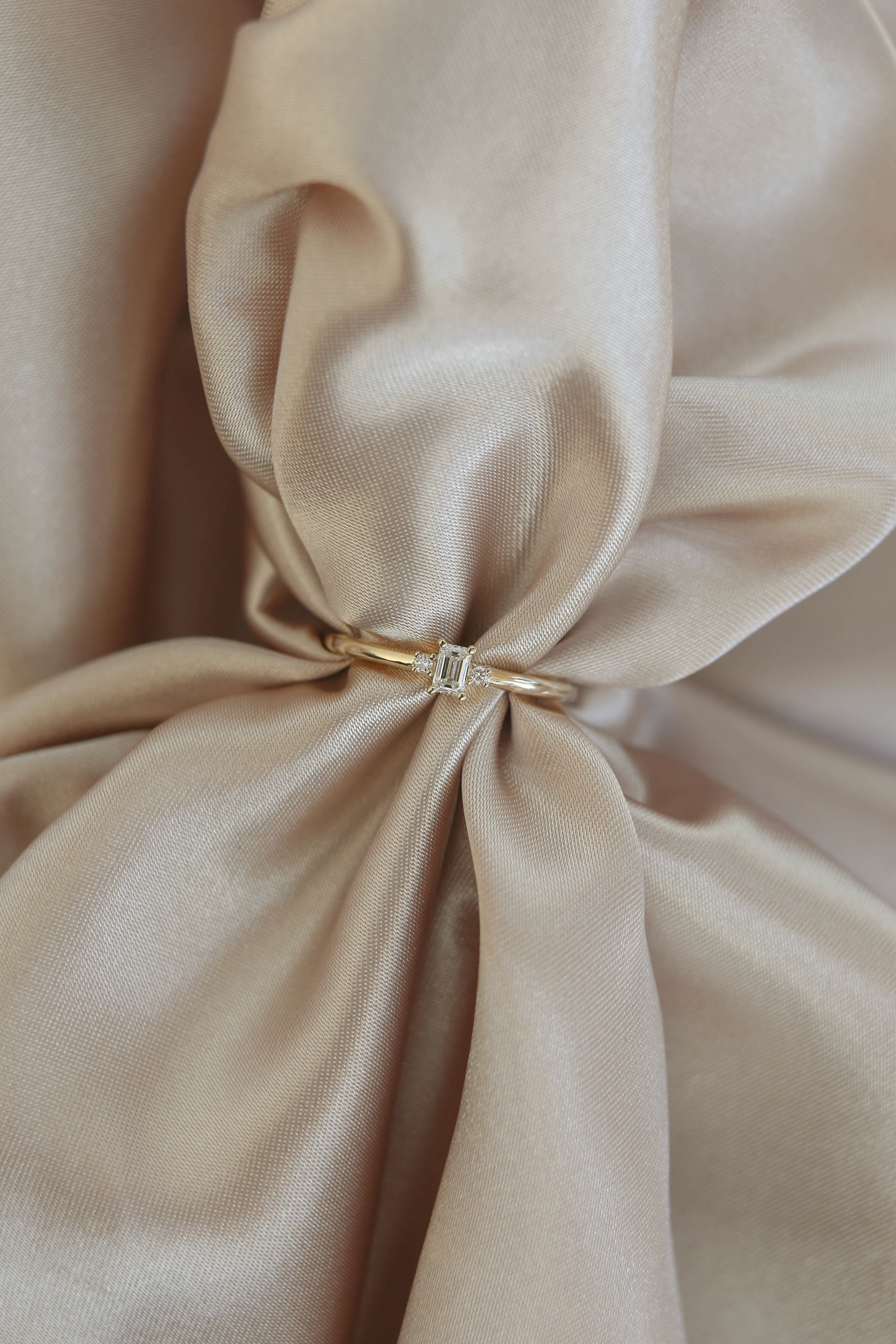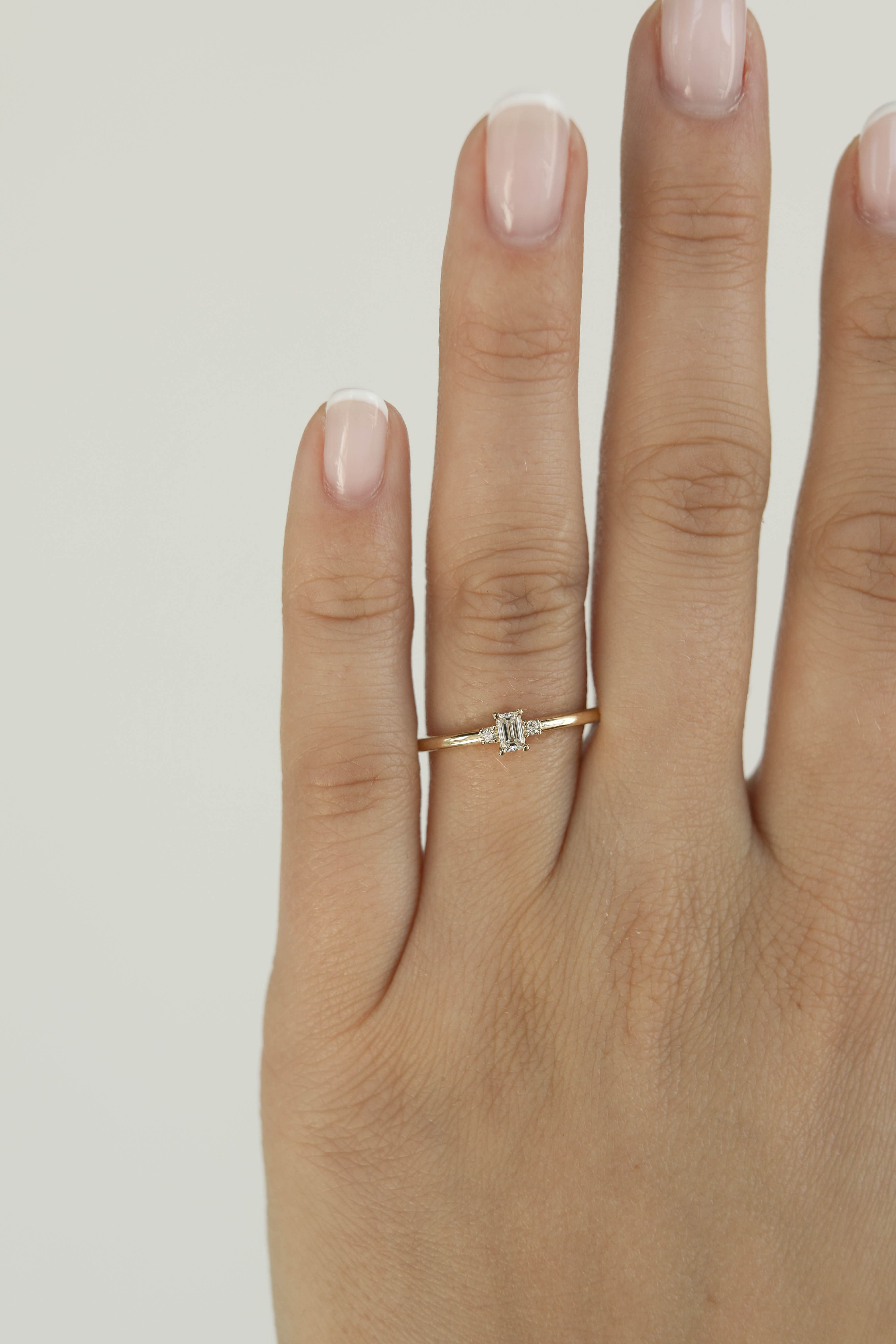 Lark features a dainty emerald shaped center stone with two round accents set flush on a half round shank.