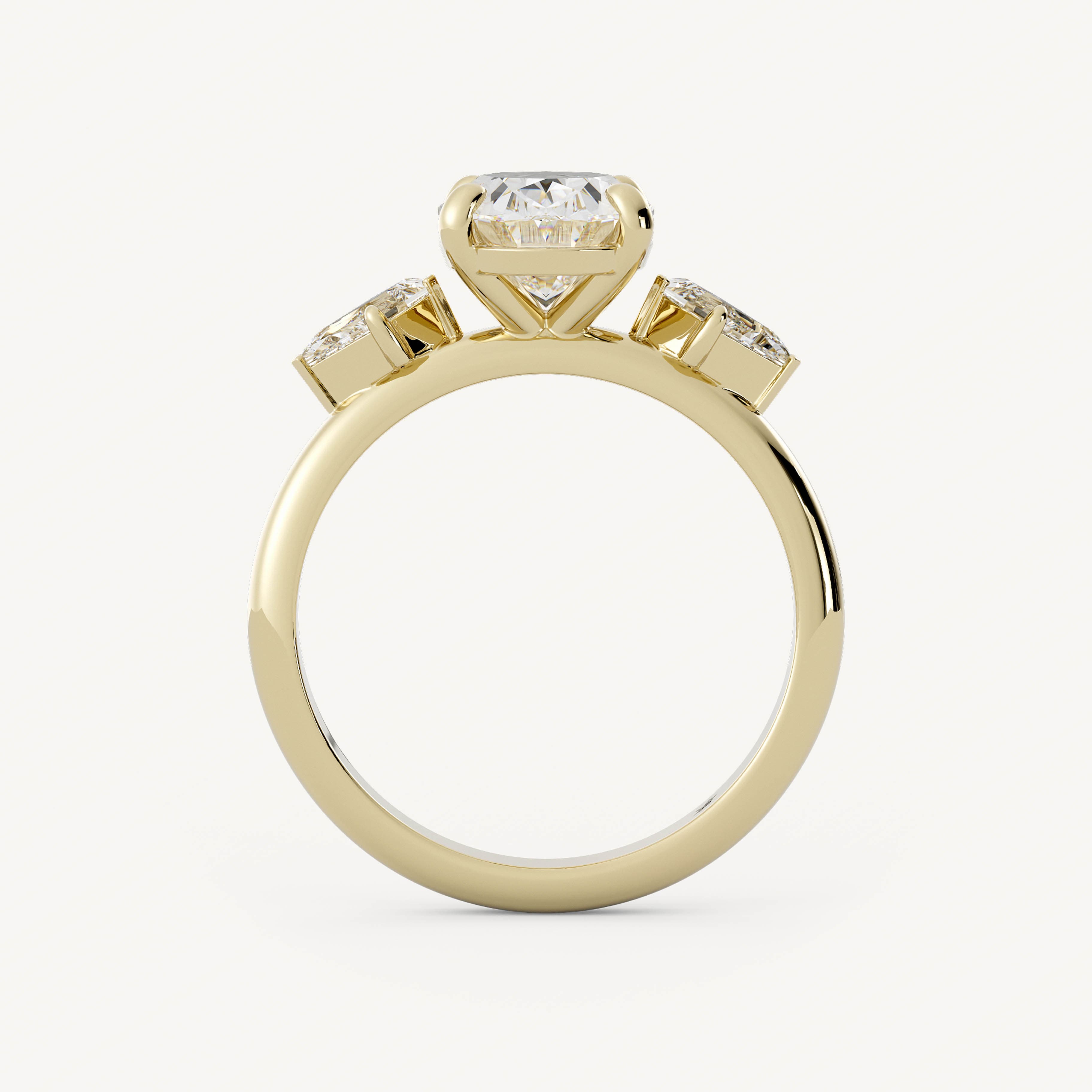 Lindon features an elegant oval center stone with kite shape accent stones set traditionally on a half round shank.