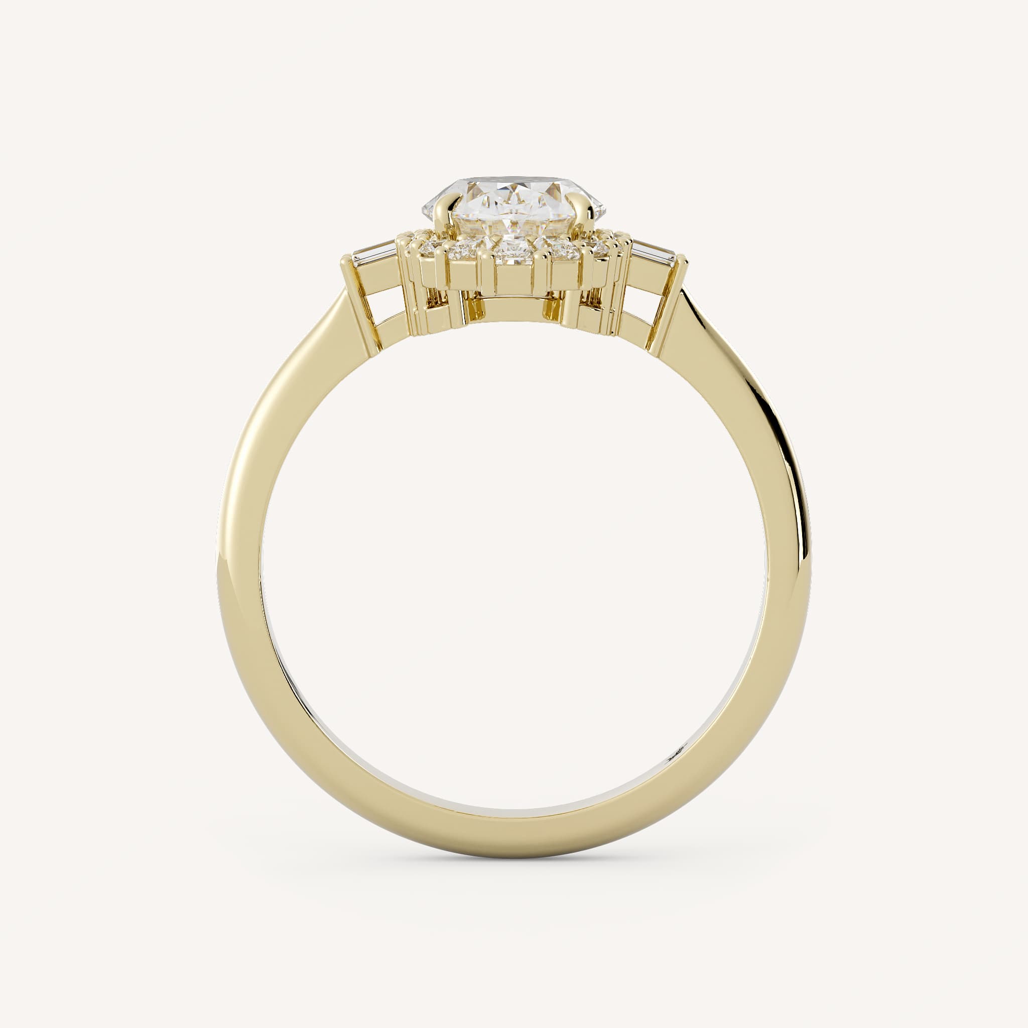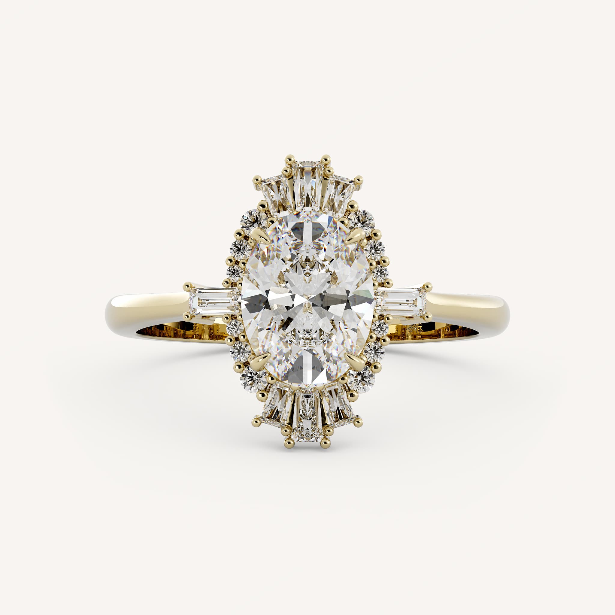 Lyric features a striking oval center stone with a burst halo composed of round and baguette stones in a basket setting on a pinch taper shank.