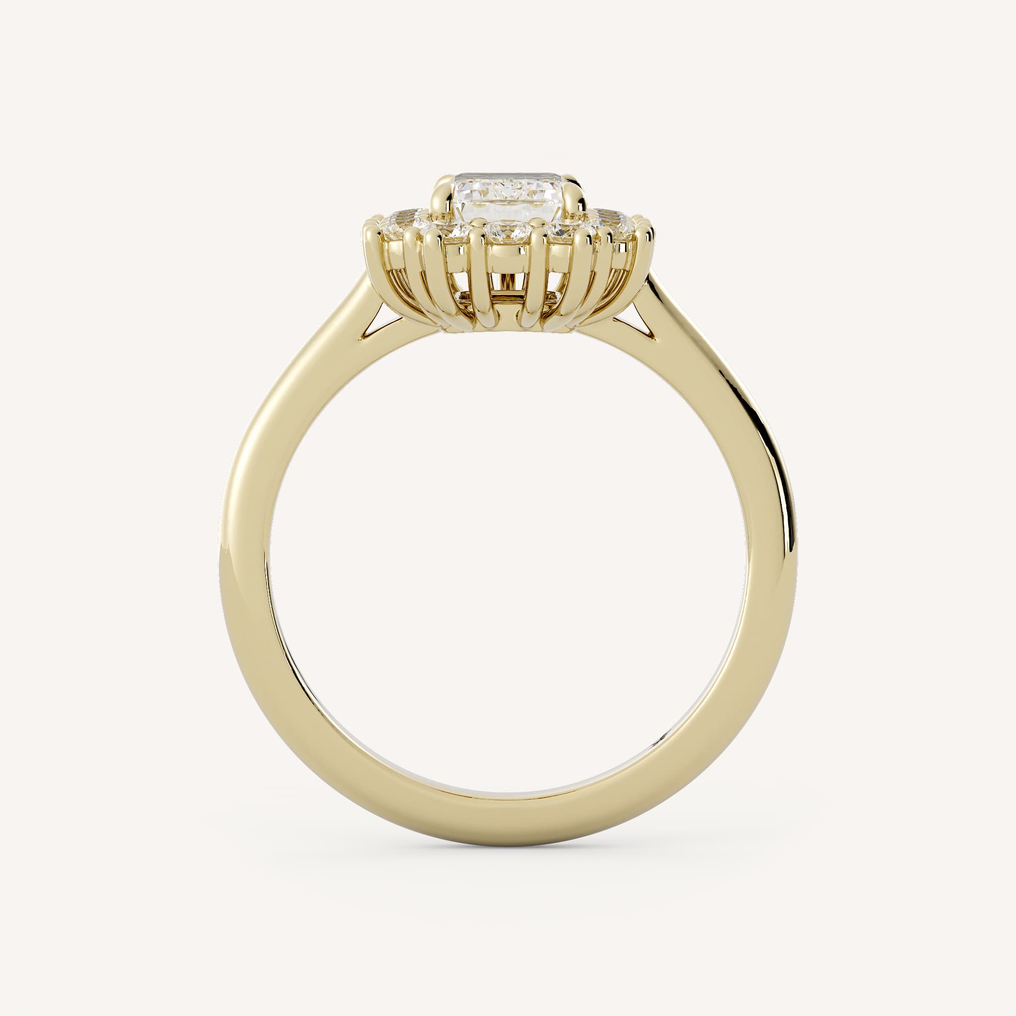 Mable features an emerald shaped center stone with a uniform burst halo set in a basket setting on a half round shank.