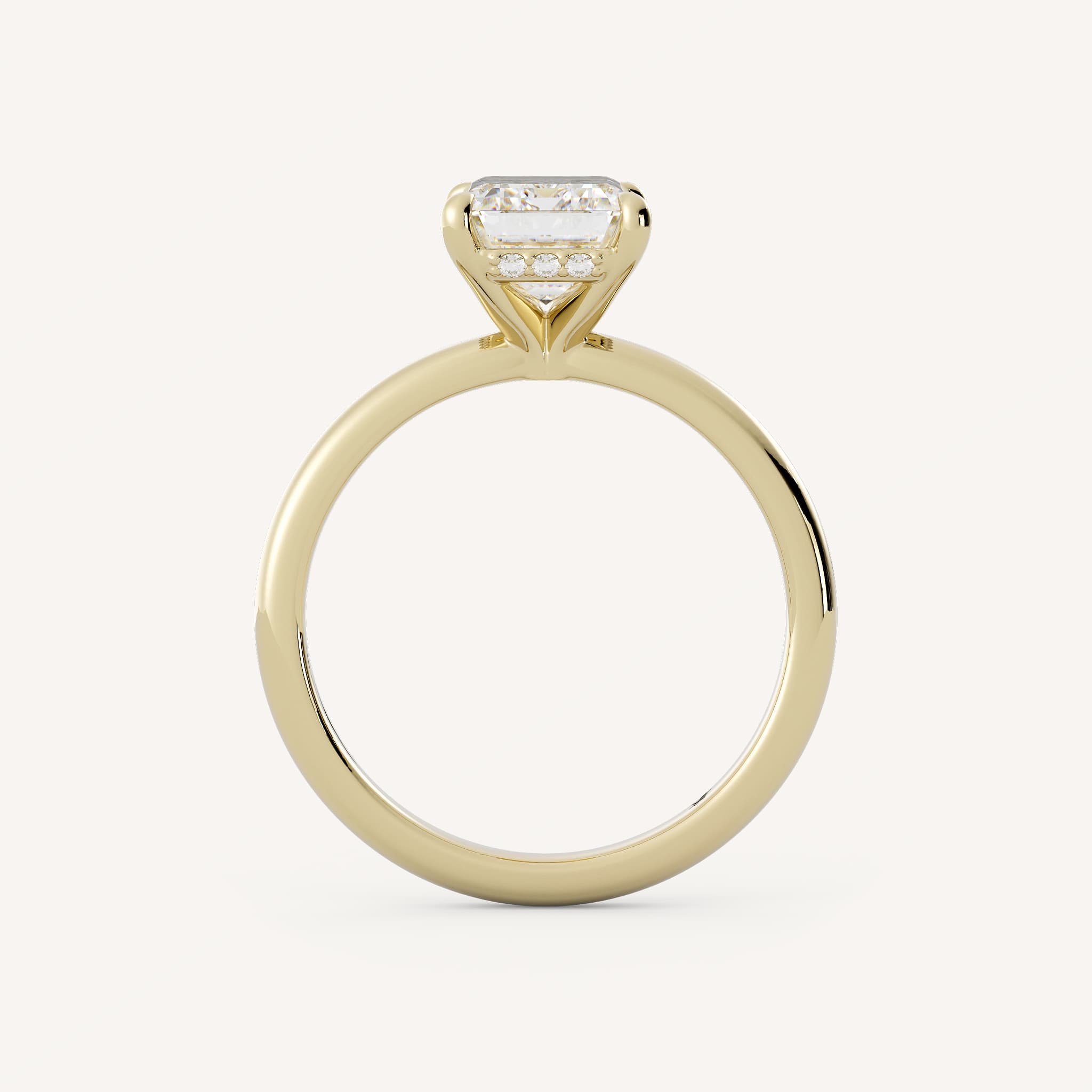 Maddi features a gorgeous emerald shaped center stone set in a traditional solitaire setting with a subtle hidden halo on a half round shank.