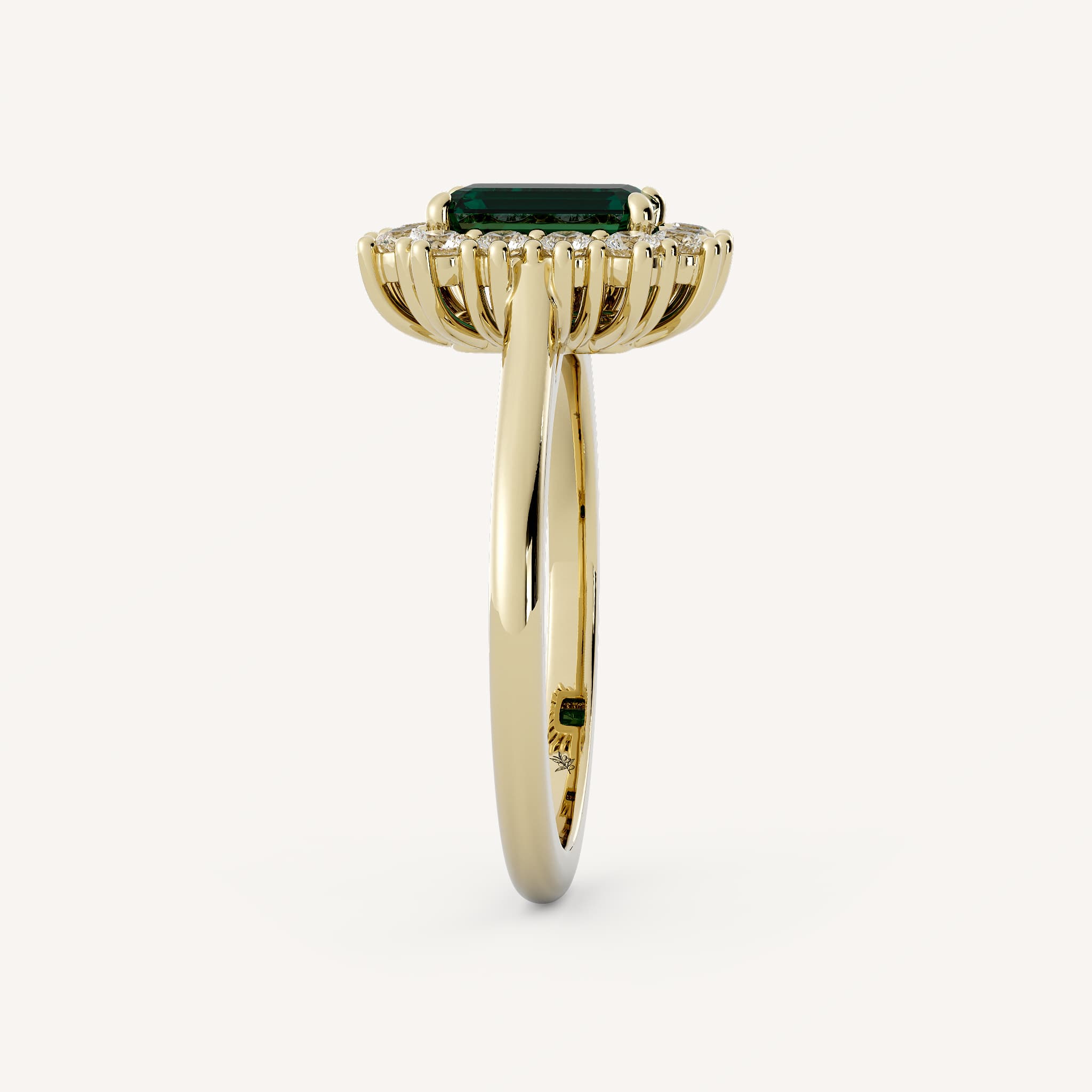 Maggie features a charming emerald shaped emerald center stone with a burst halo. Set in a cathedral basket setting on a half round shank.