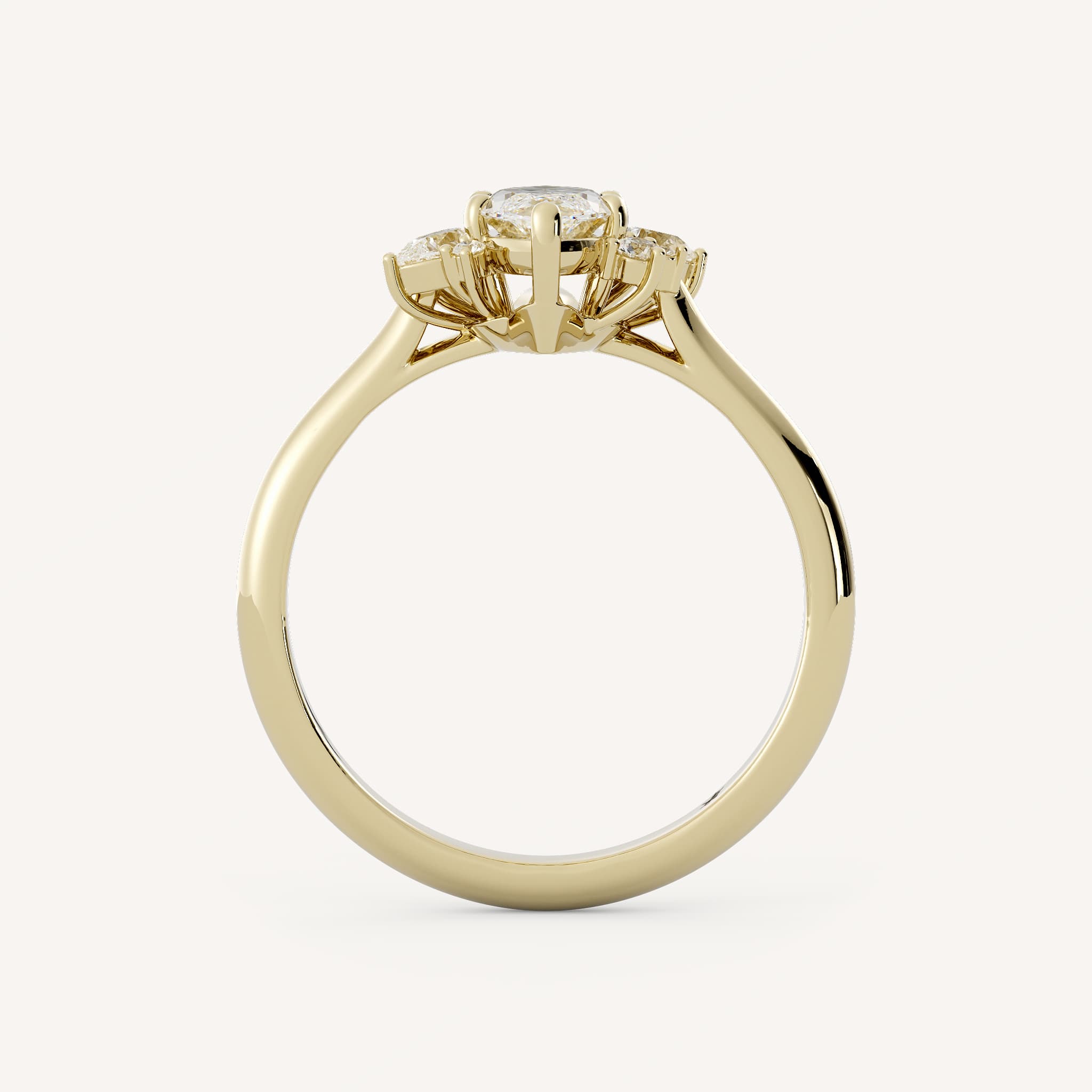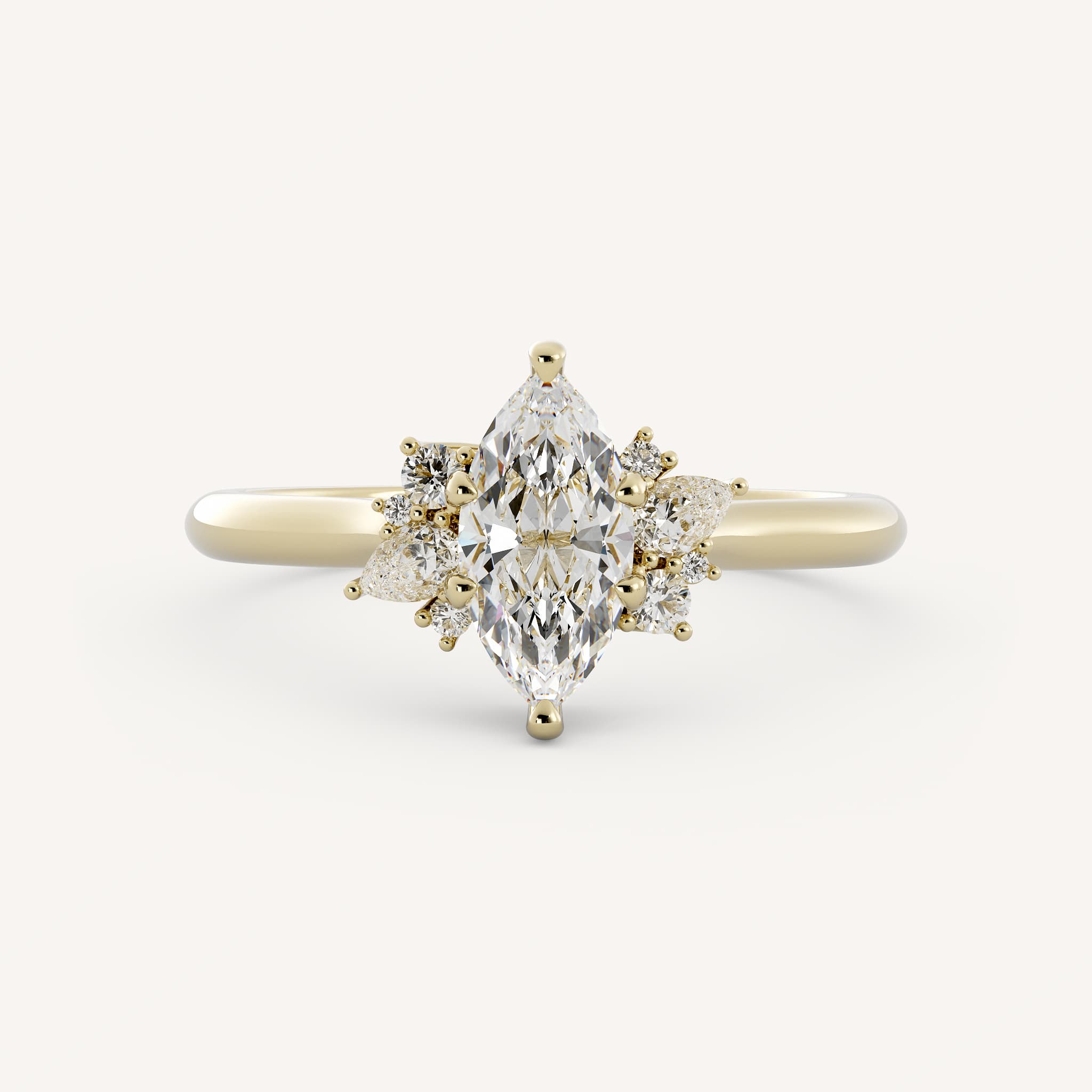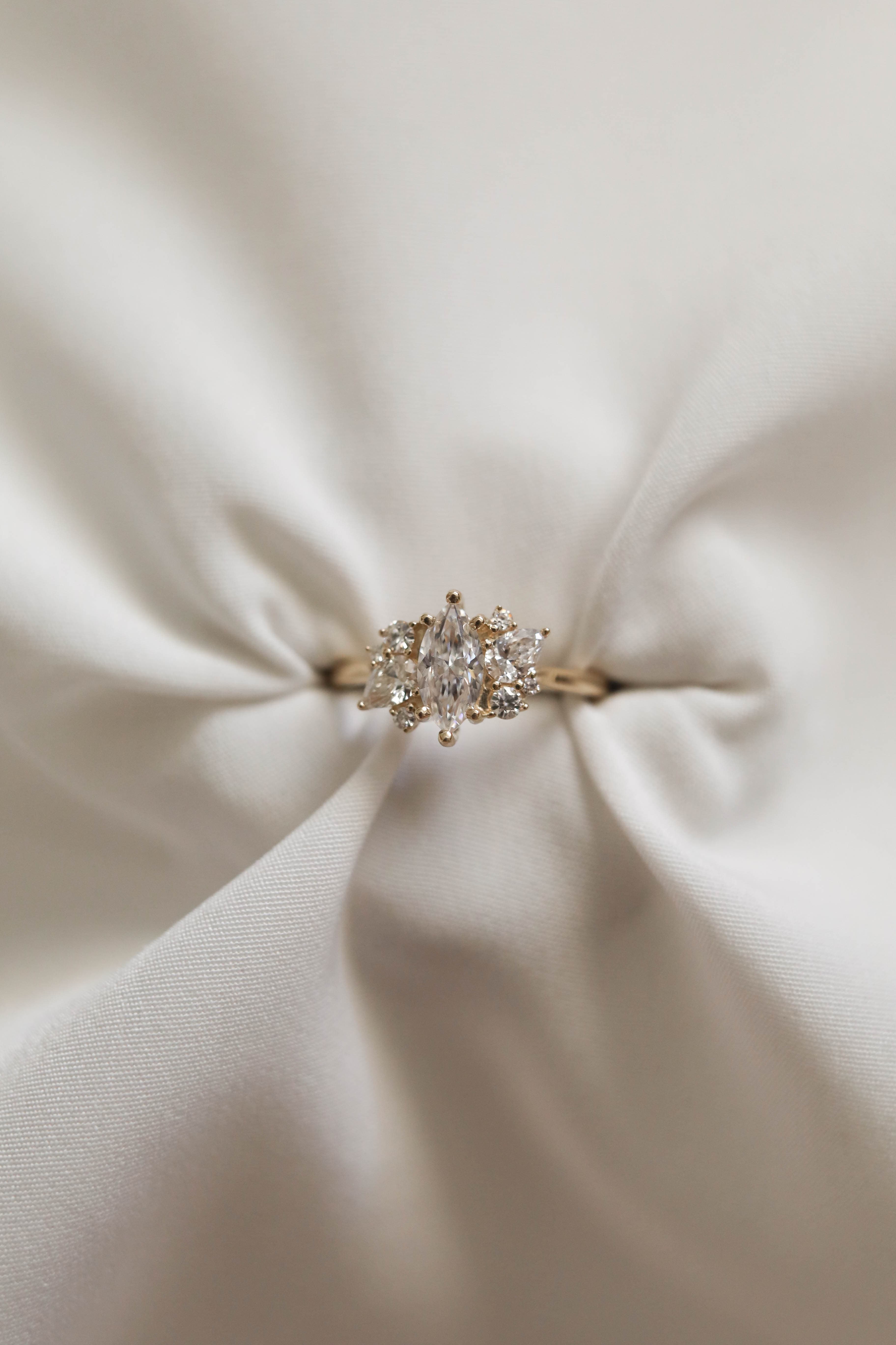 Marlee features a beautiful marquise center stone with clusters of pear and round stones set in a basket setting on a half round shank.