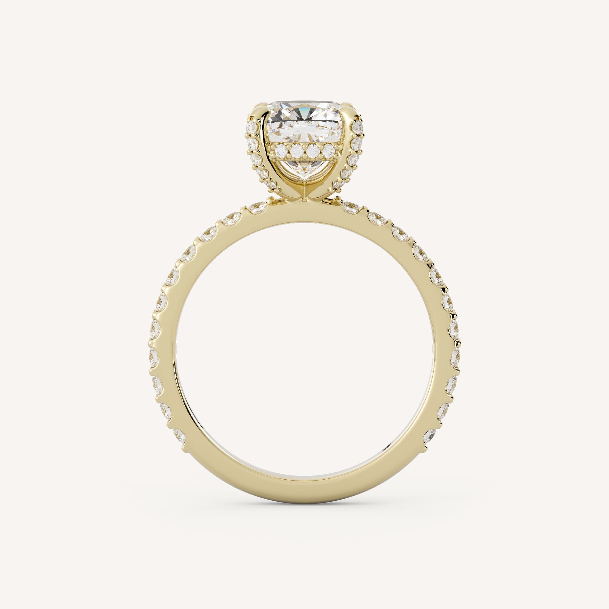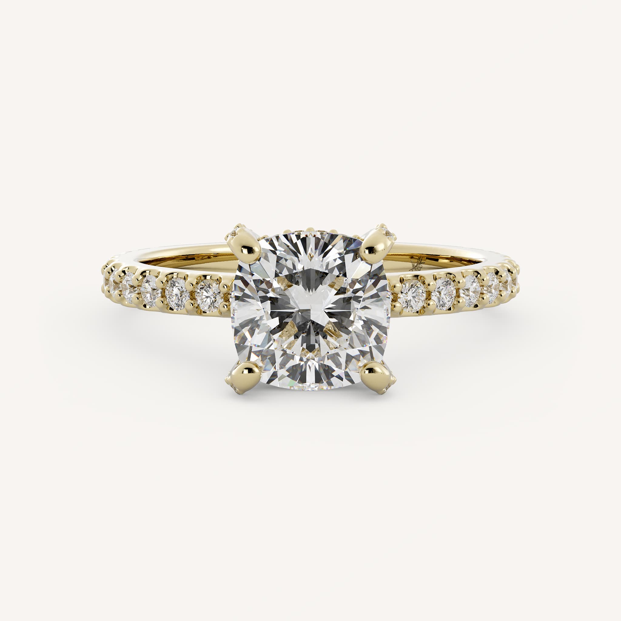 Maxine features a cushion center stone set in a traditional solitaire setting with a detailed hidden halo and diamond accents on the prongs and shank.