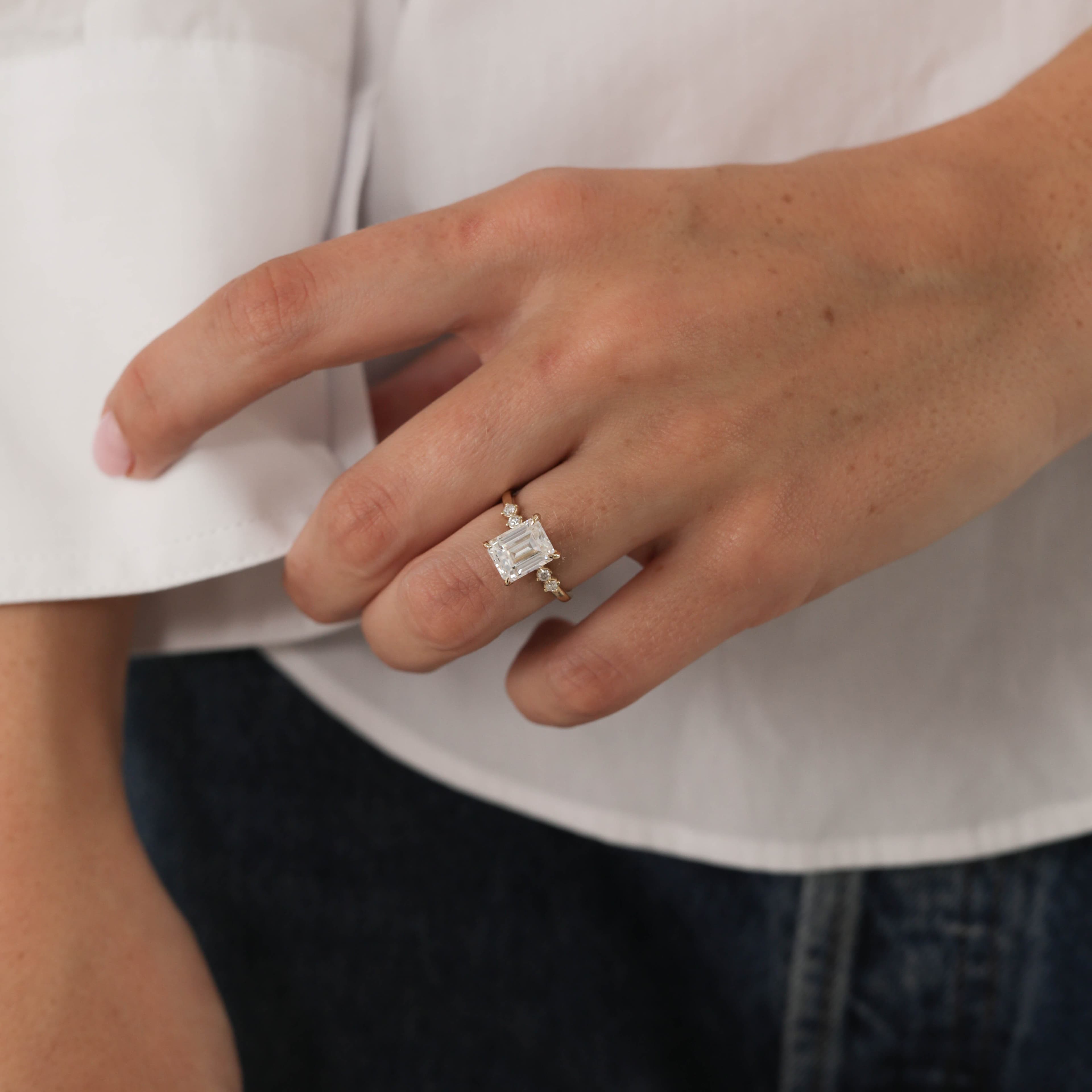 Nashville features an emerald shaped center stone set with claw prongs and stunning compass set accent stones on a half round shank.