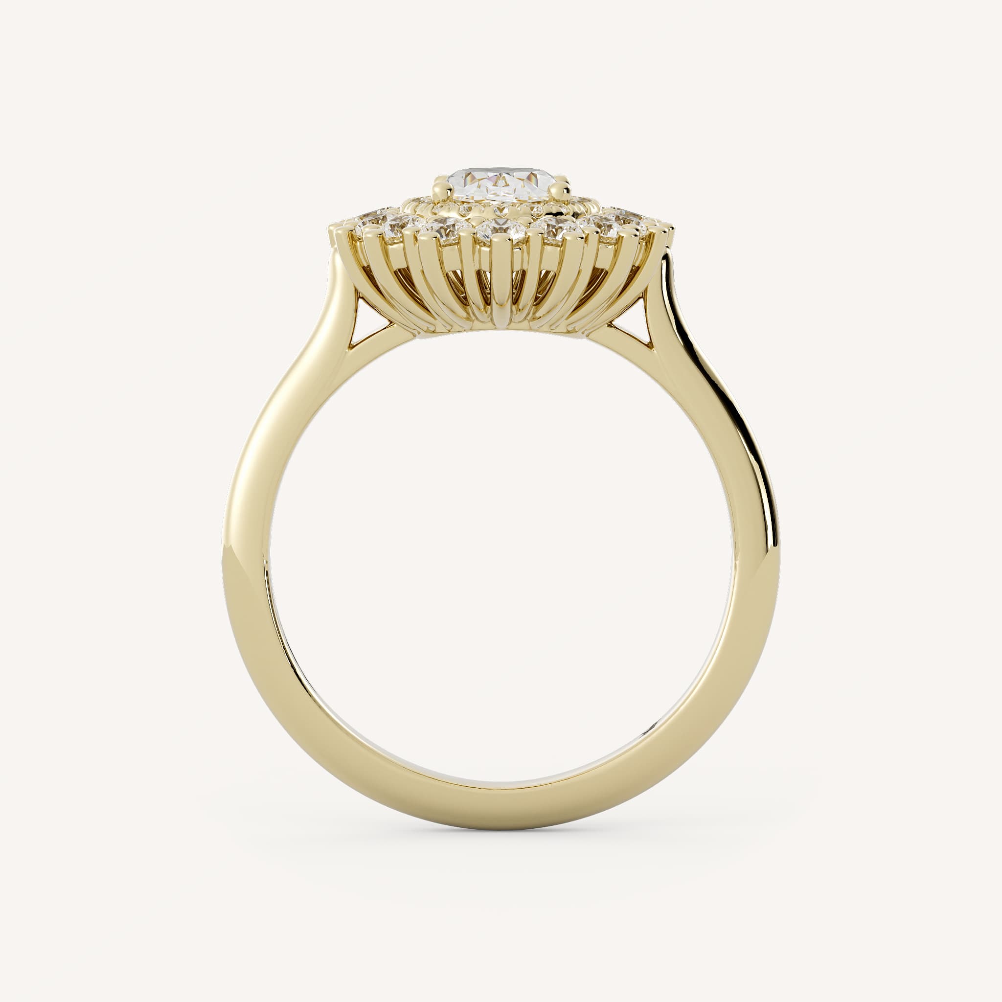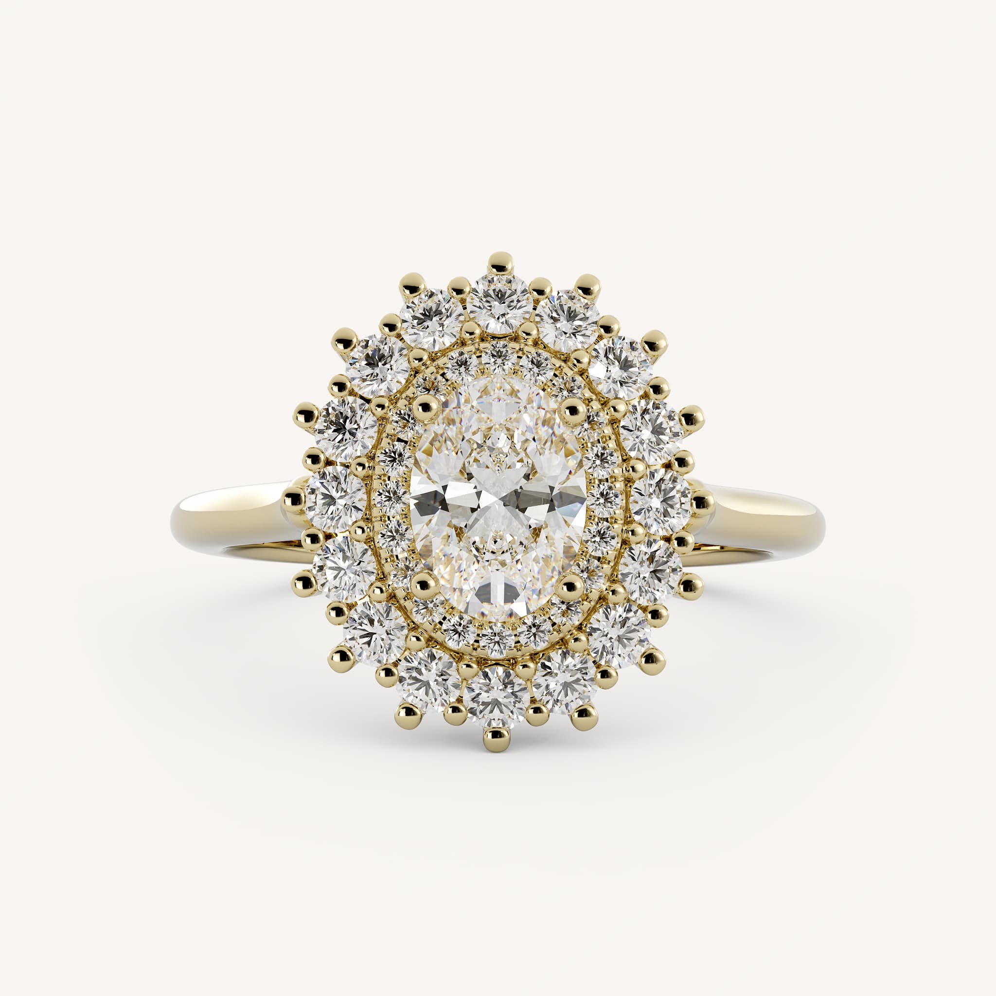 Penny features an oval center stone with an eye-catching double burst halo set in a basket setting with a half round shank.