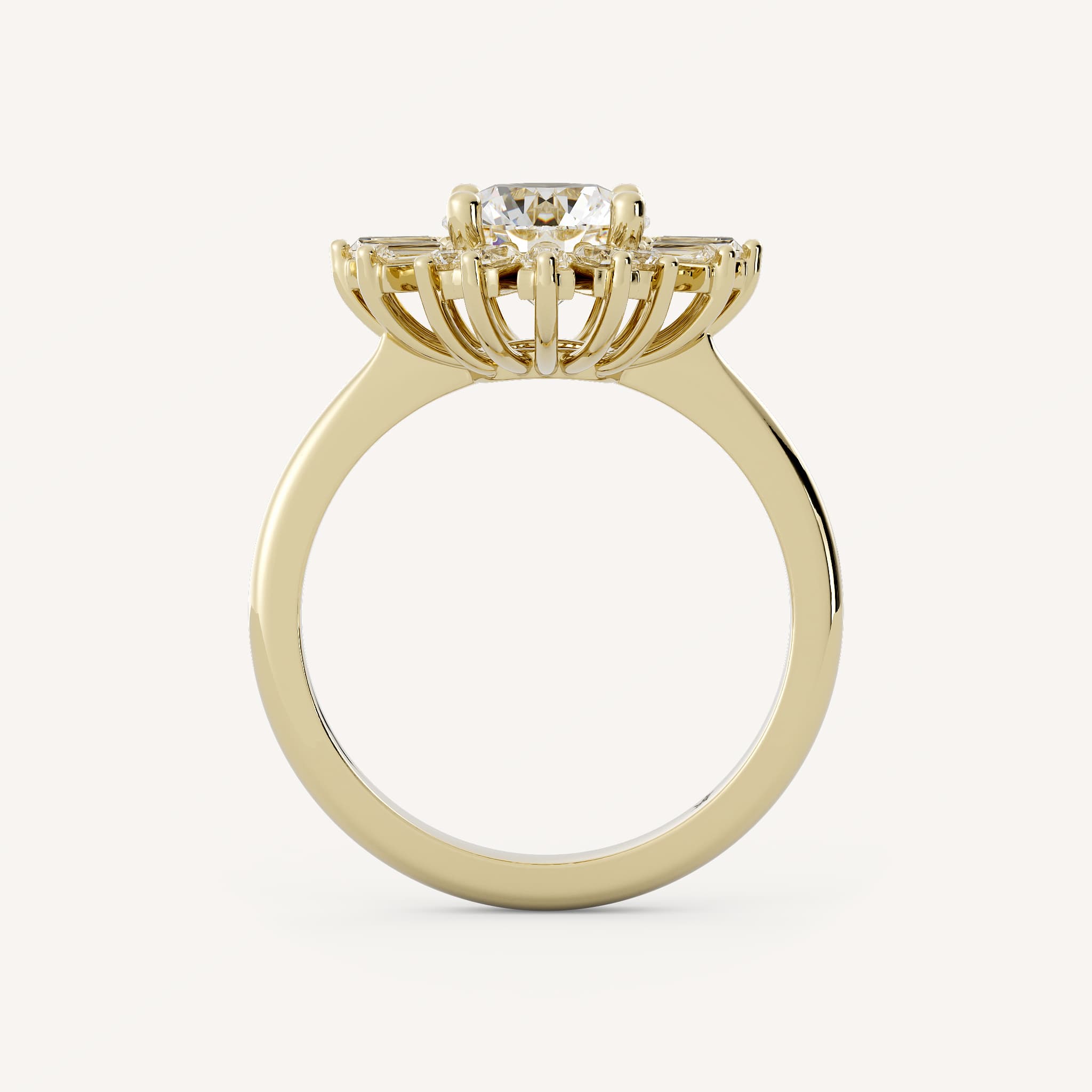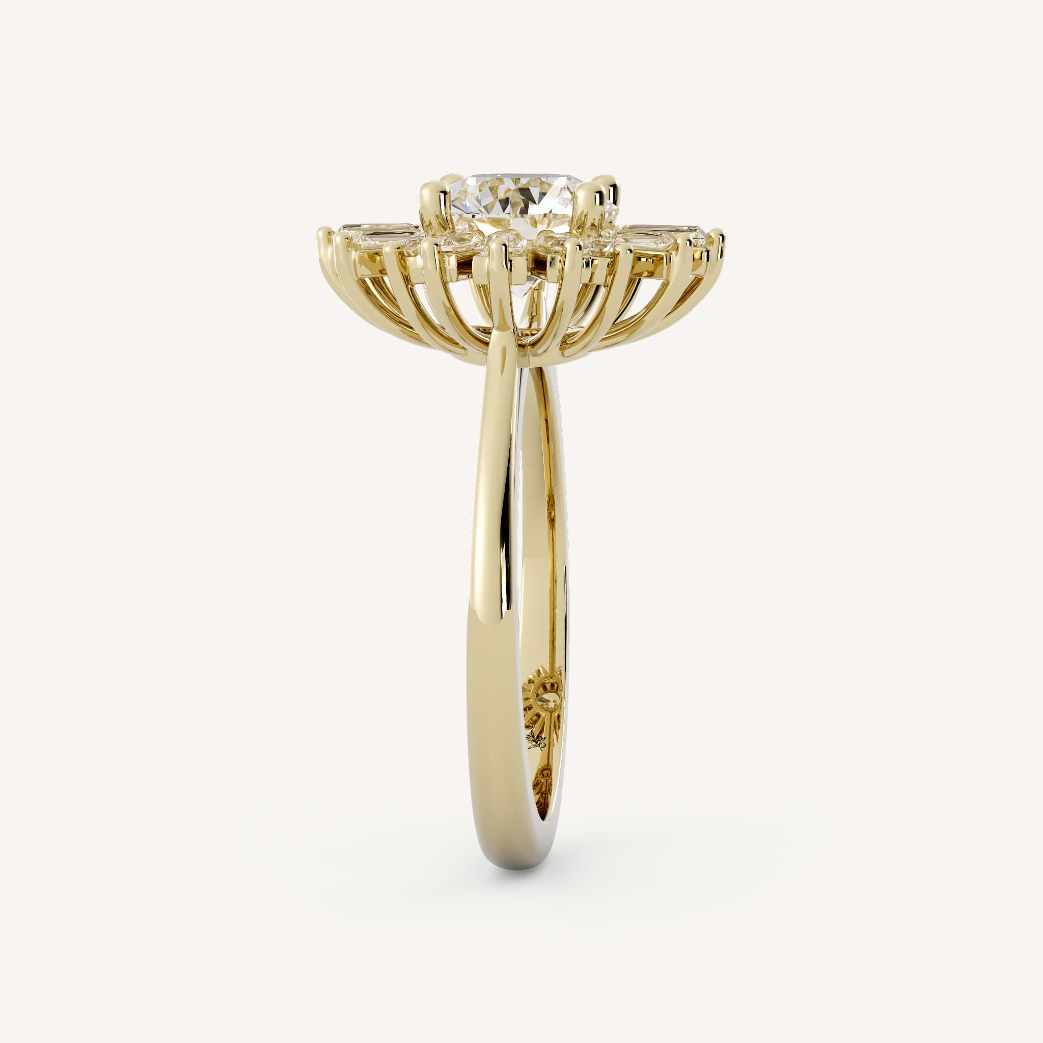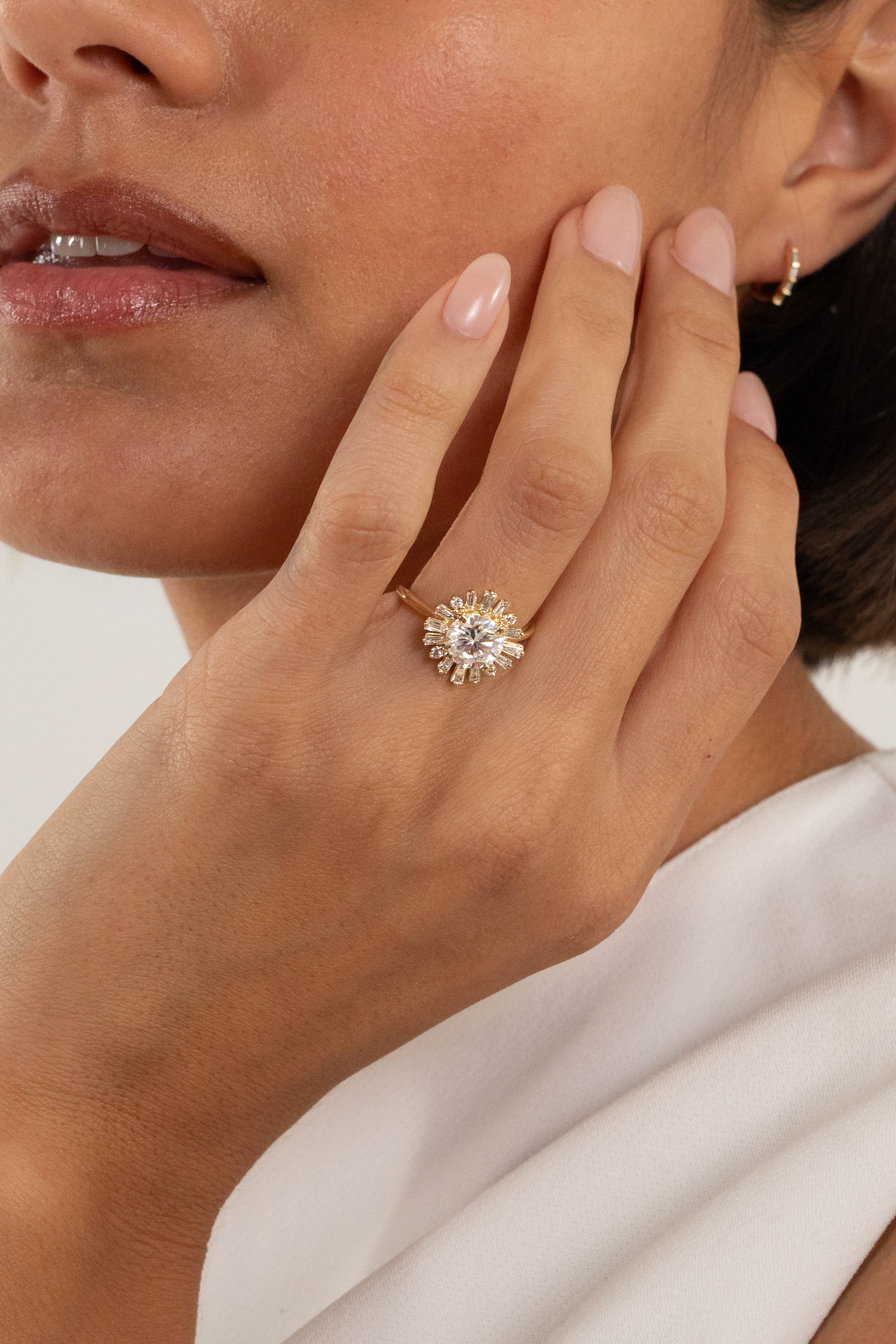 Pippa features a round center stone set in a whimsical halo made of baguette and round stones in a basket setting and half round shank.