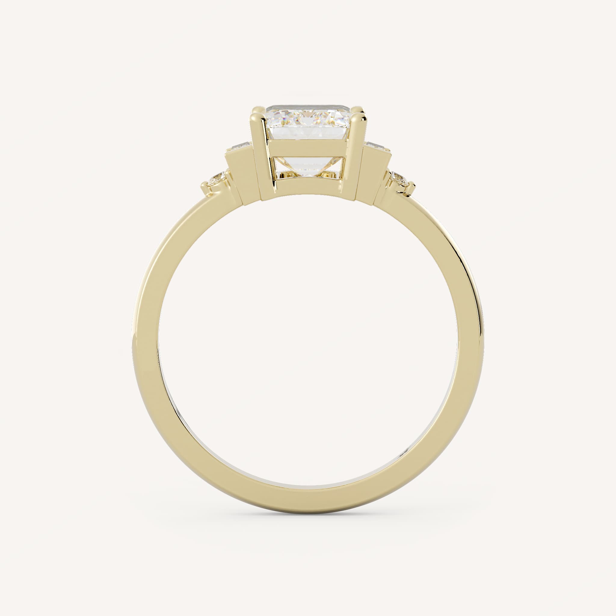 Quinn features an elegant emerald shaped center stone with round and baguette accent stones in a basket setting with a half round shank.