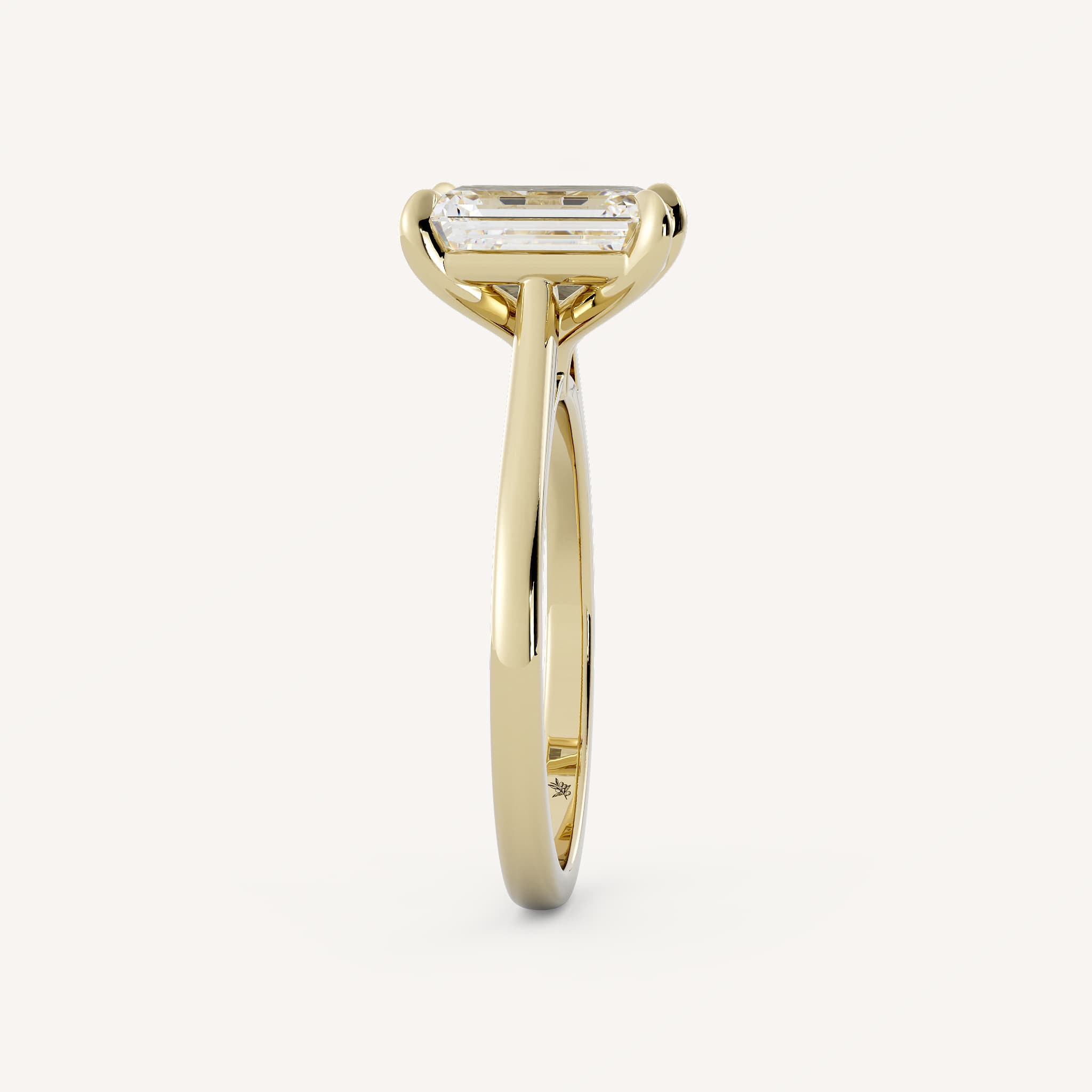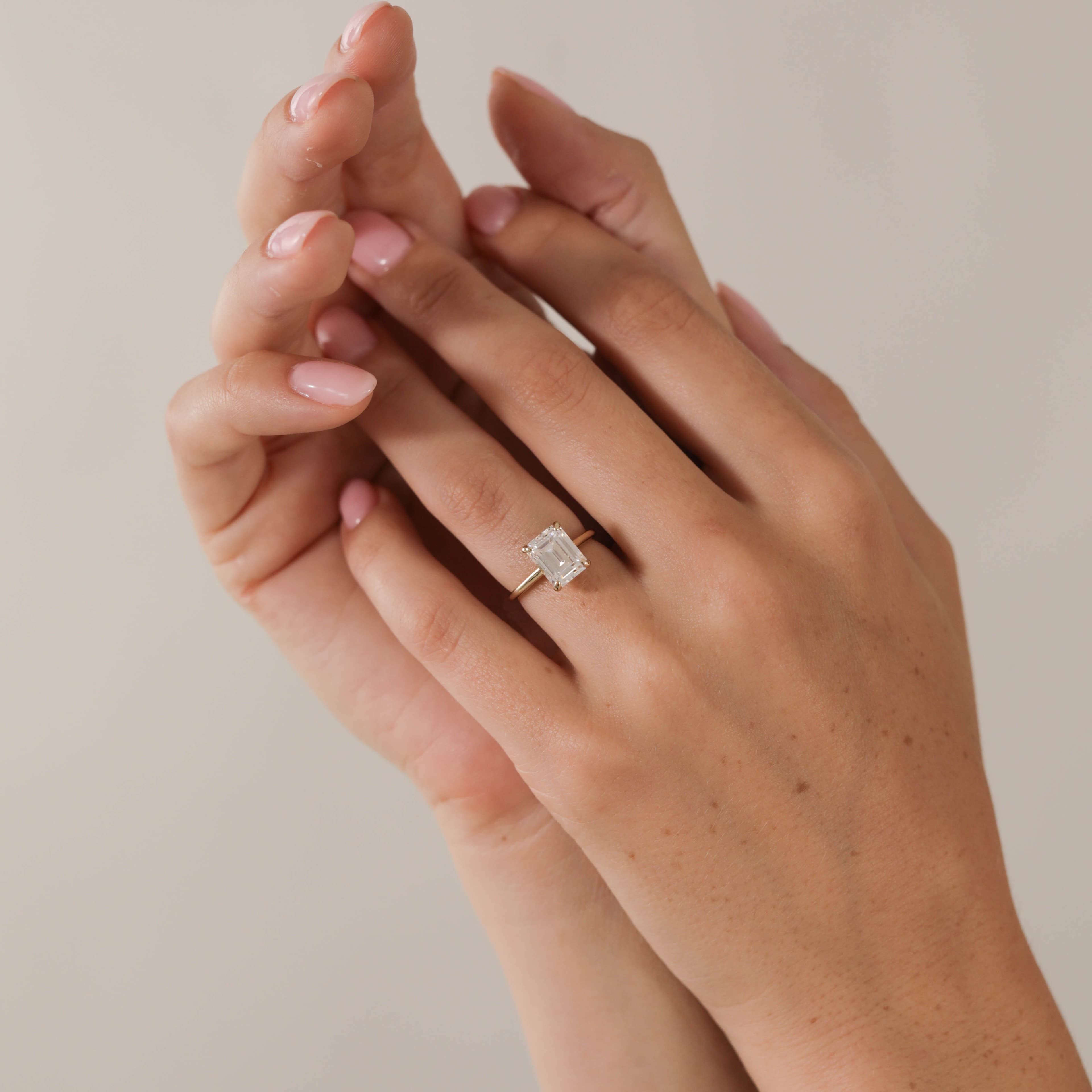 Rae features a stunning emerald shaped center stone set in a cathedral solitaire setting with a half round shank.