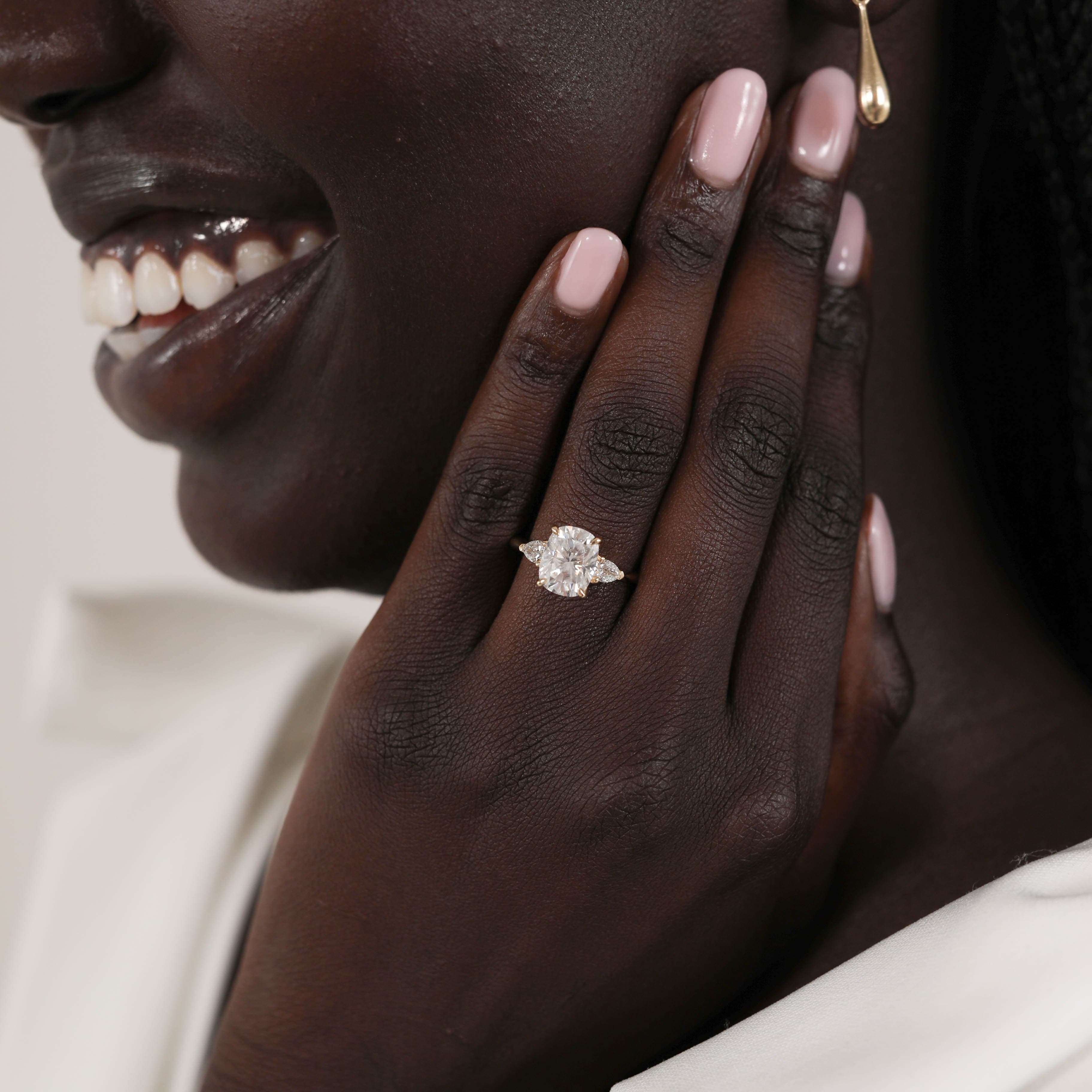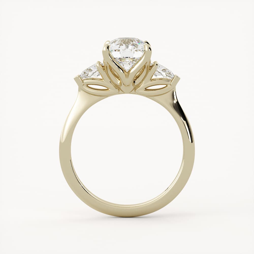 Set in a stunning tulip three-stone basket, Rockwell perfectly balances hard lines and fine details with pear accent stones and a center stone choice between emerald, radiant, or elongated cushion. Rockwell features a pinch-tapered half-round shank that perfectly finishes the design.