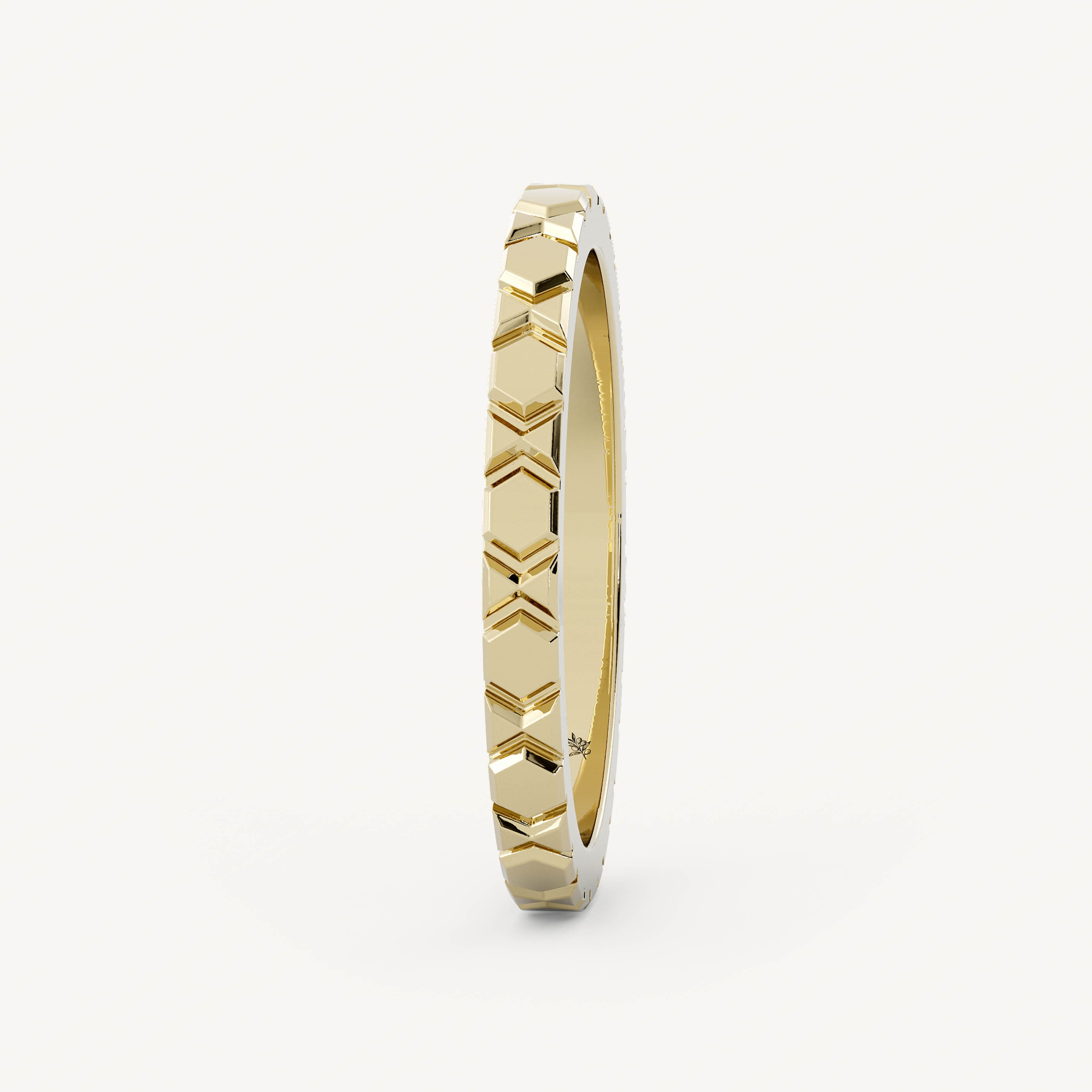 Shirley is a gold eternity band with uniform angular patterns on the shank. Made to be worn alone, stacked, or paired with engagement rings.