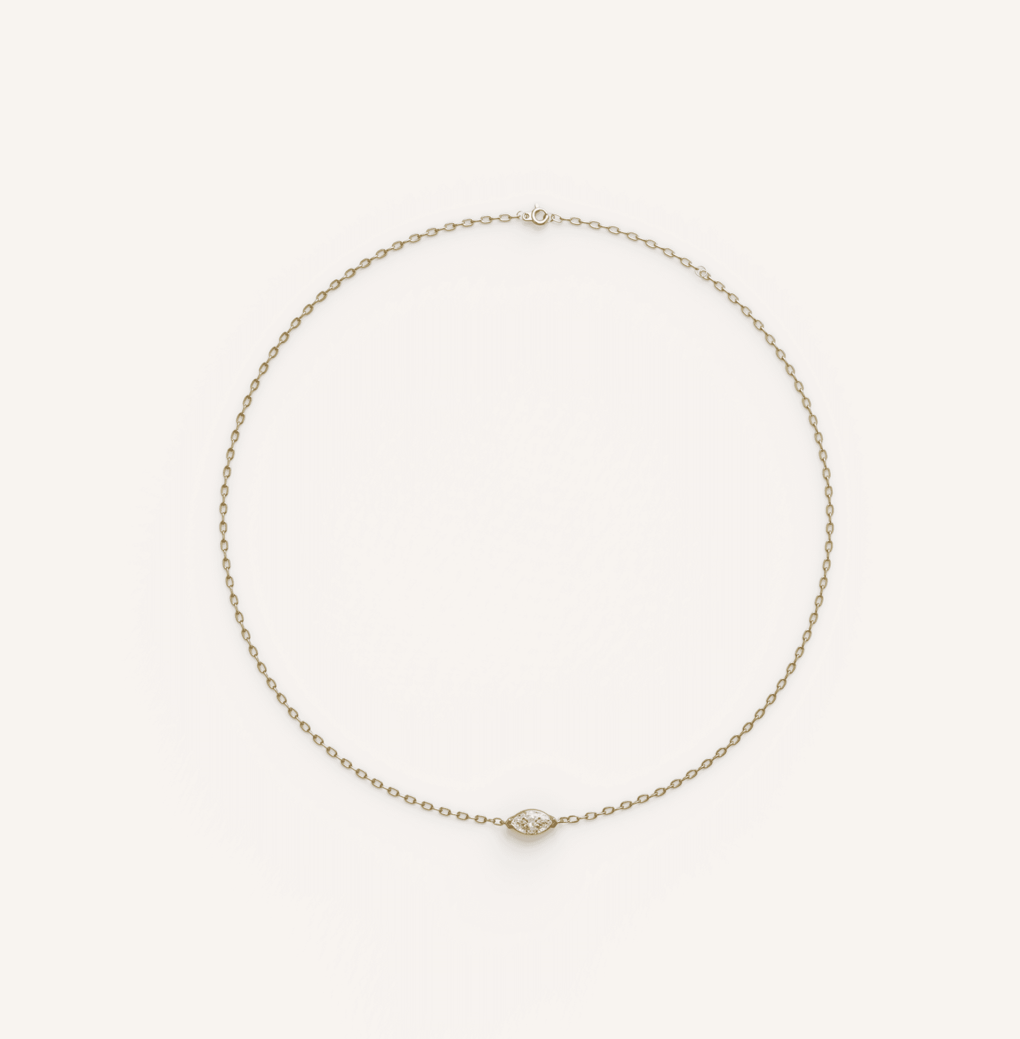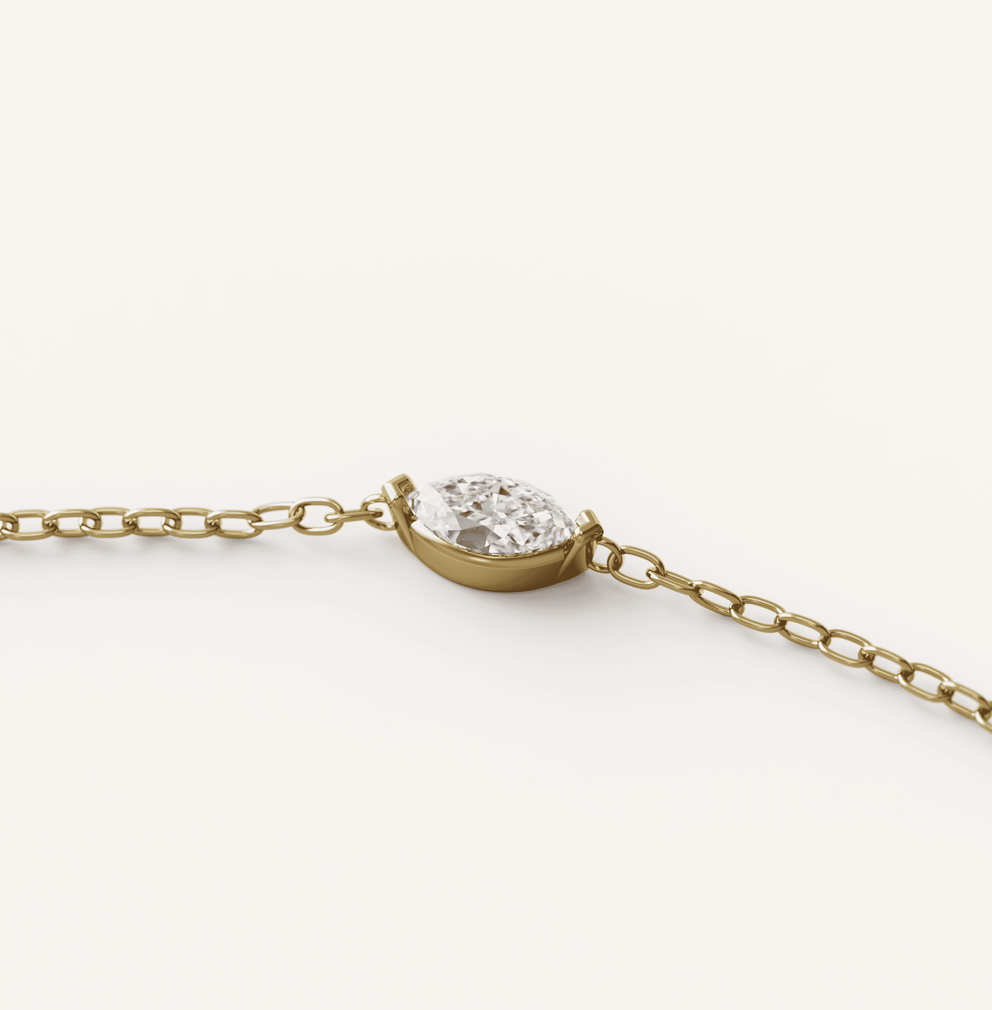Gold cable chain bracelet featuring a 1/4ct marquise cut lab diamond. The bracelet is adjustable to be 6.5 to 7.5 inch length.