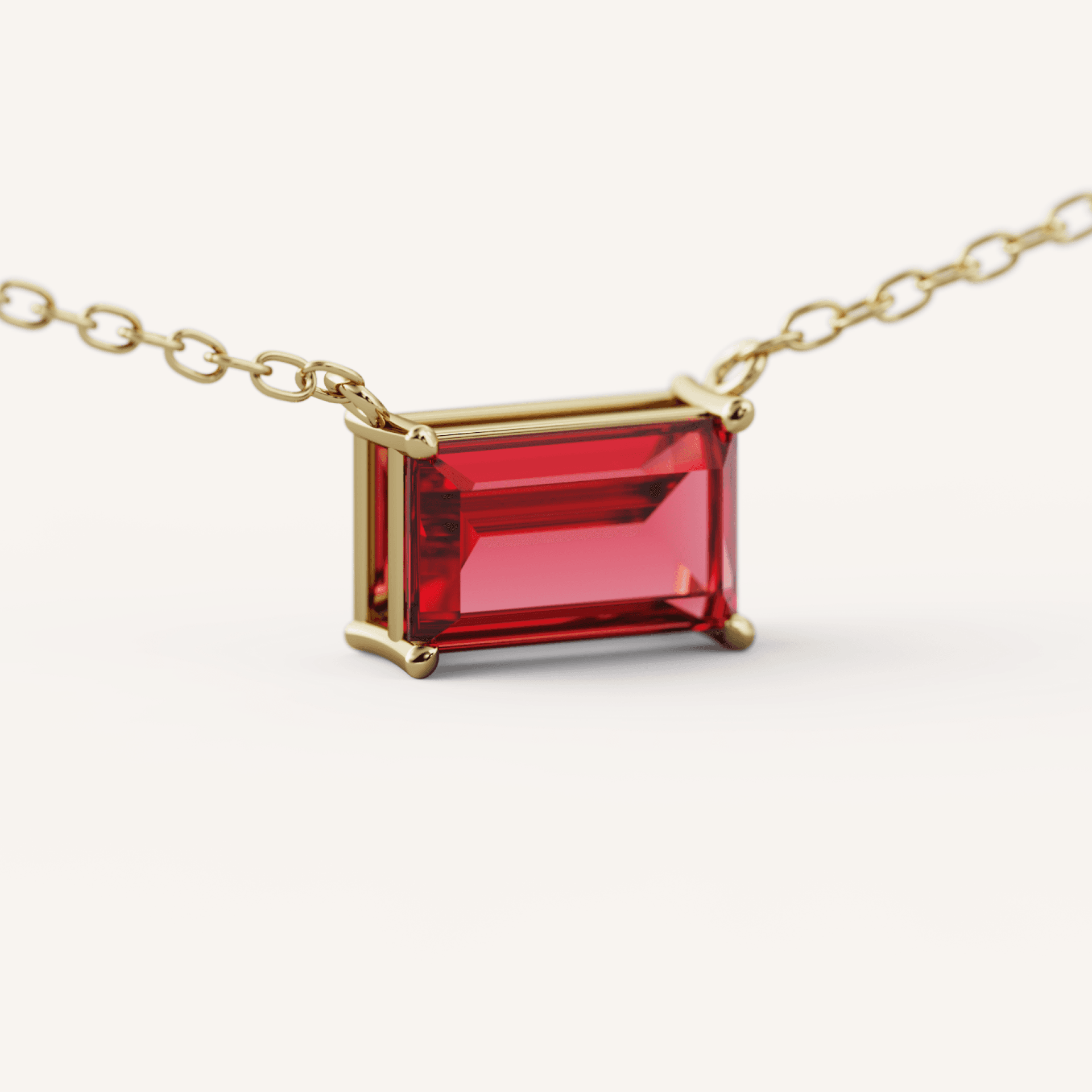Featuring a timeless and simple 18 inch gold cable chain necklace with a 5x3mm emerald cut gemstone pendant. Comes in both the a stunning lab grown ruby or emerald.