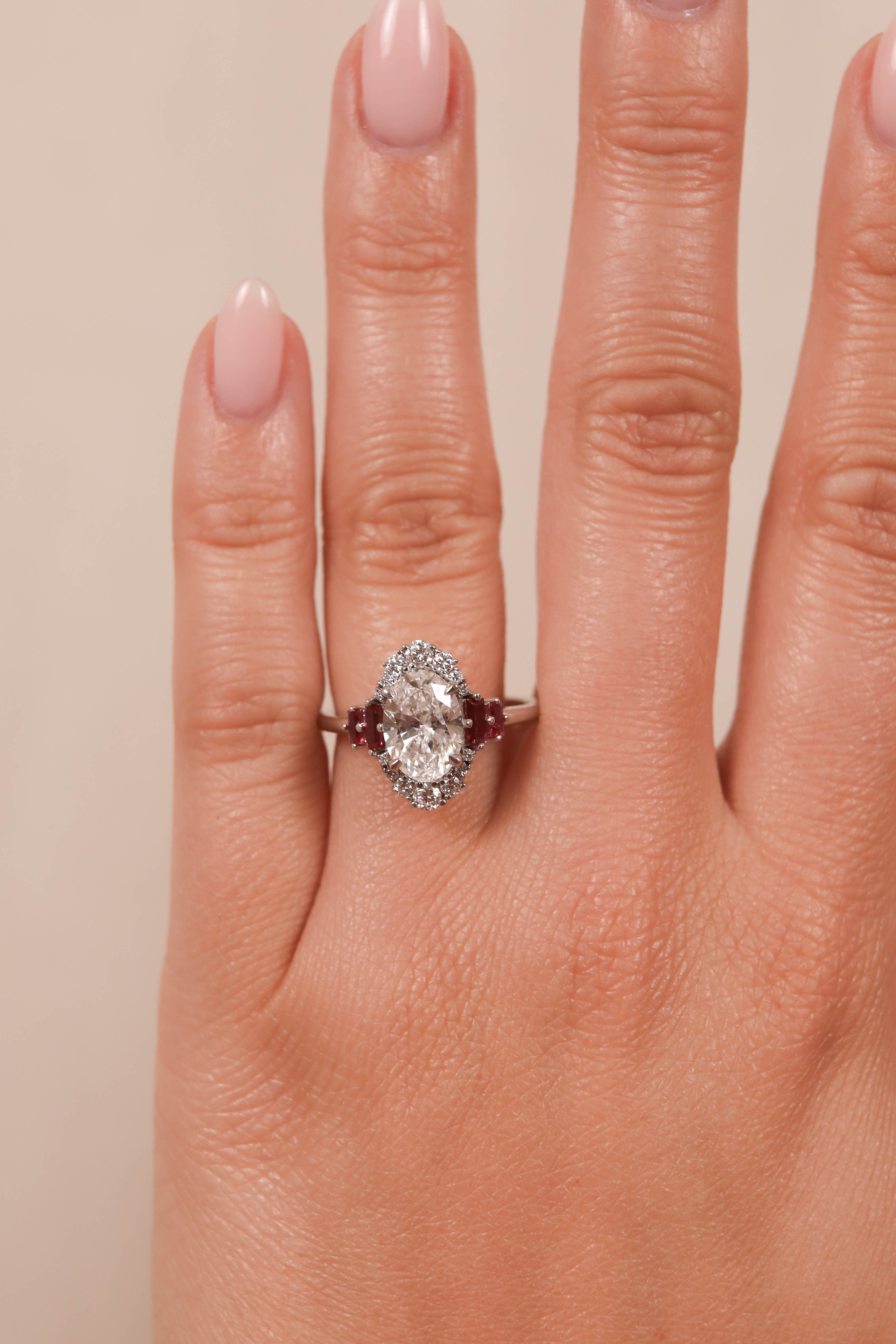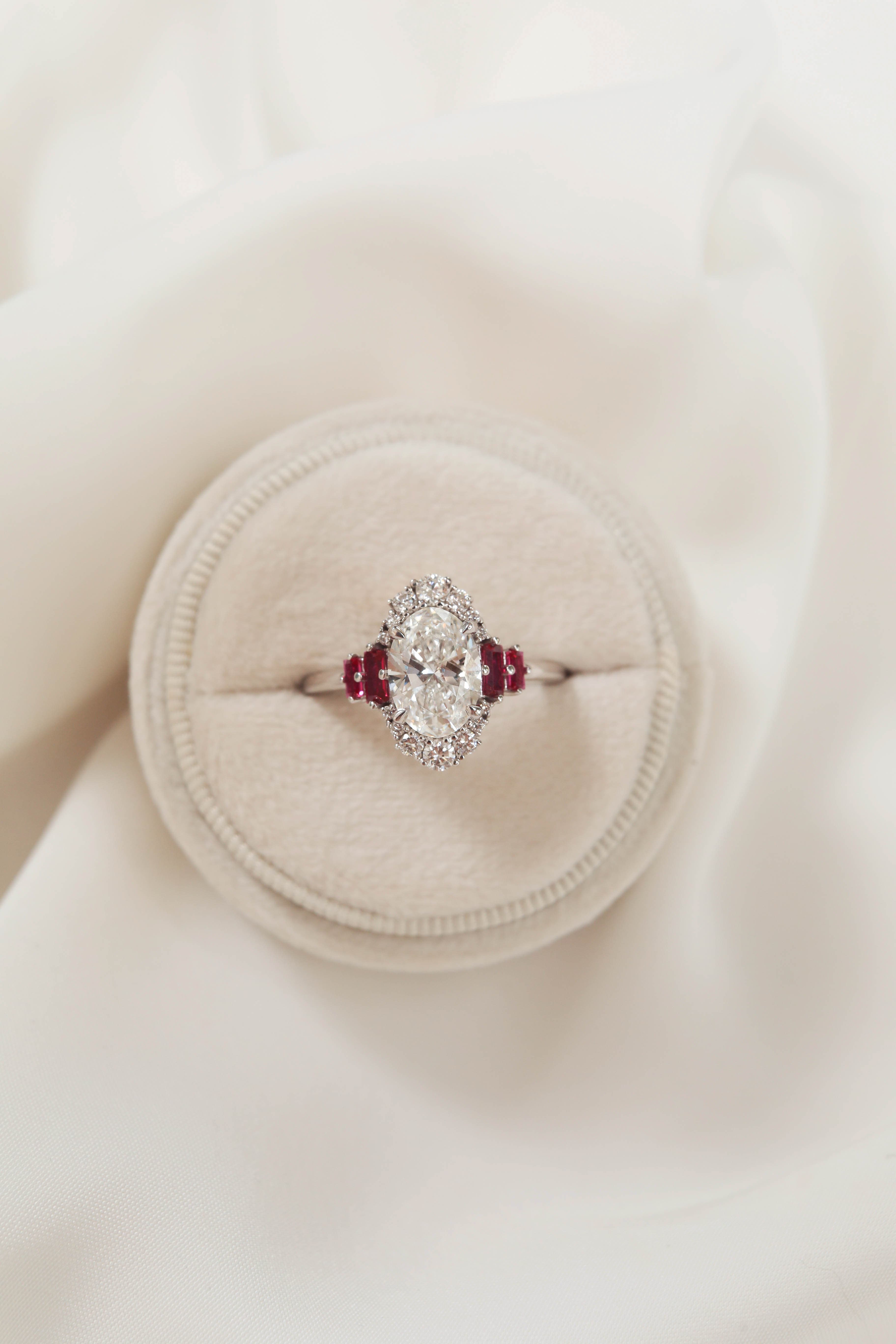 Sonnet features an elongated oval center stone with a striking halo featuring rubies in a cathedral setting on a half round shank.