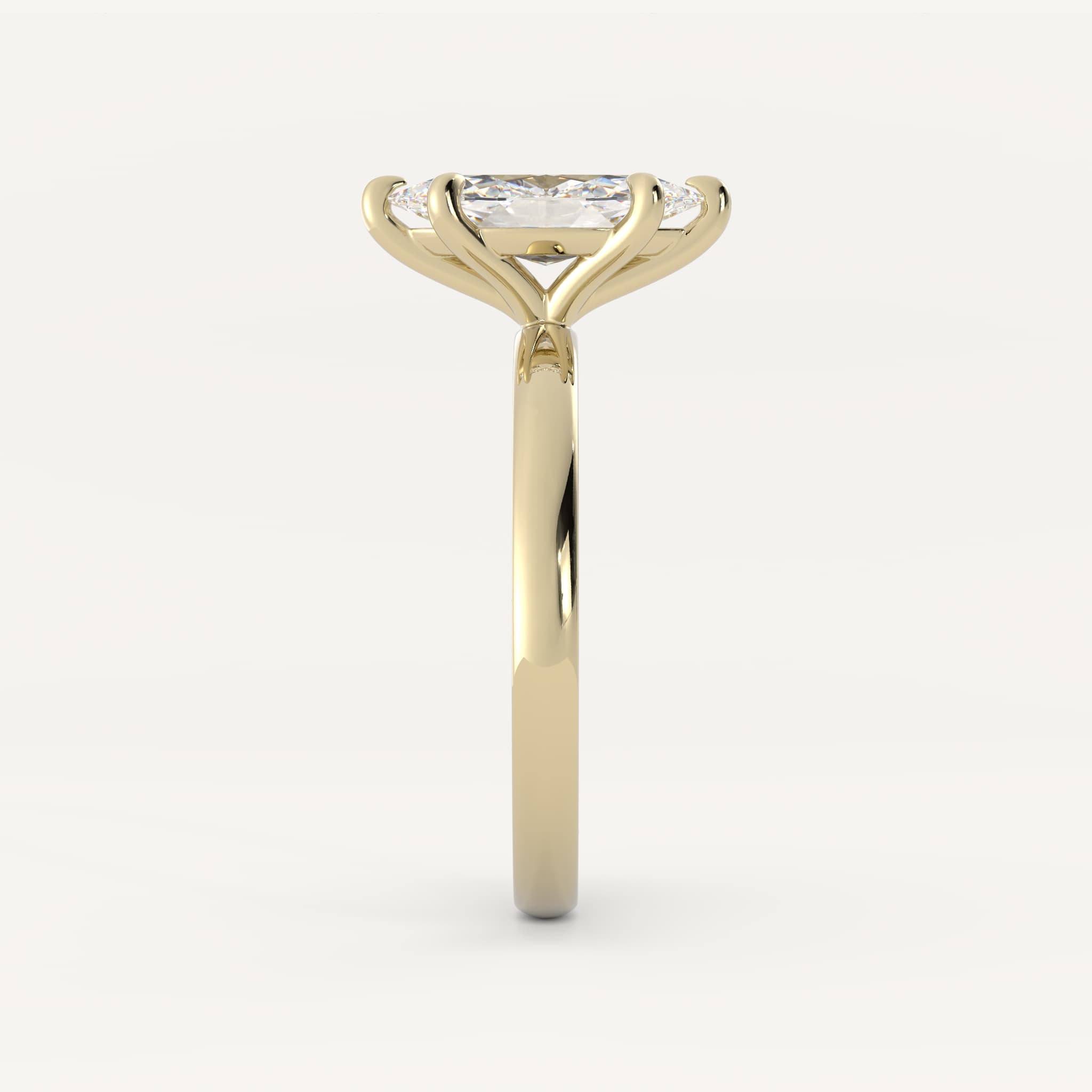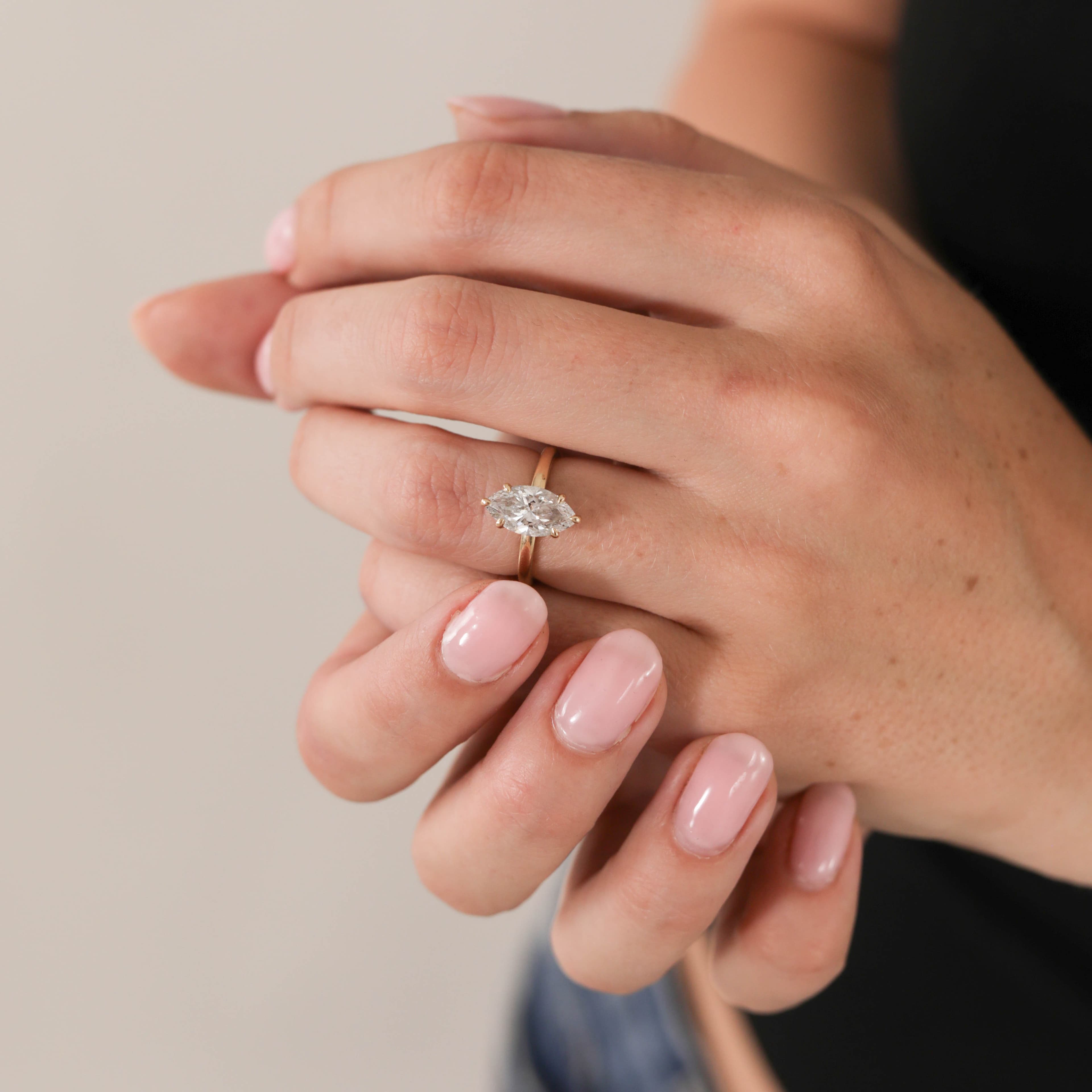 Stader features a daring marquise shaped center stone set in a traditional solitaire setting on a half round shank.