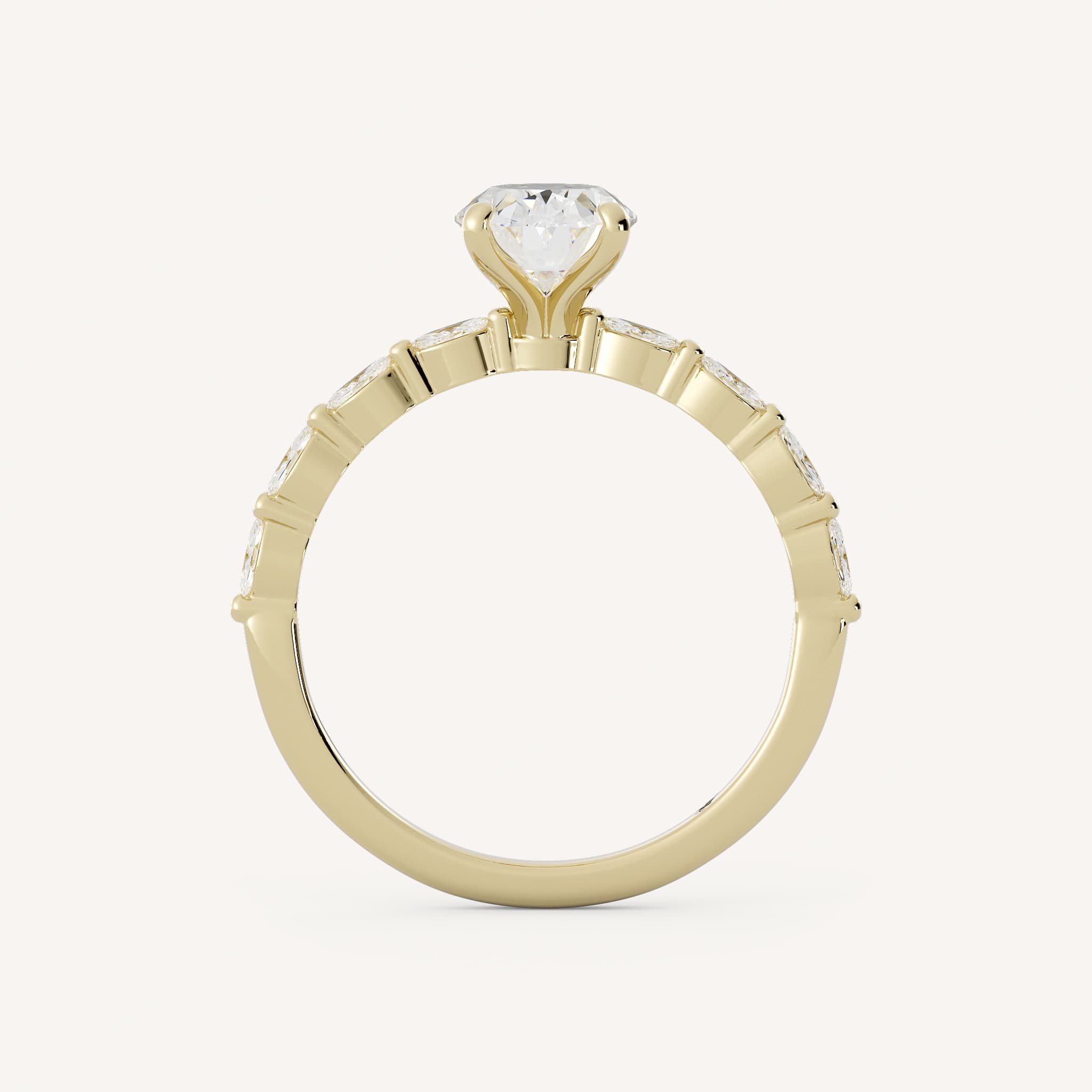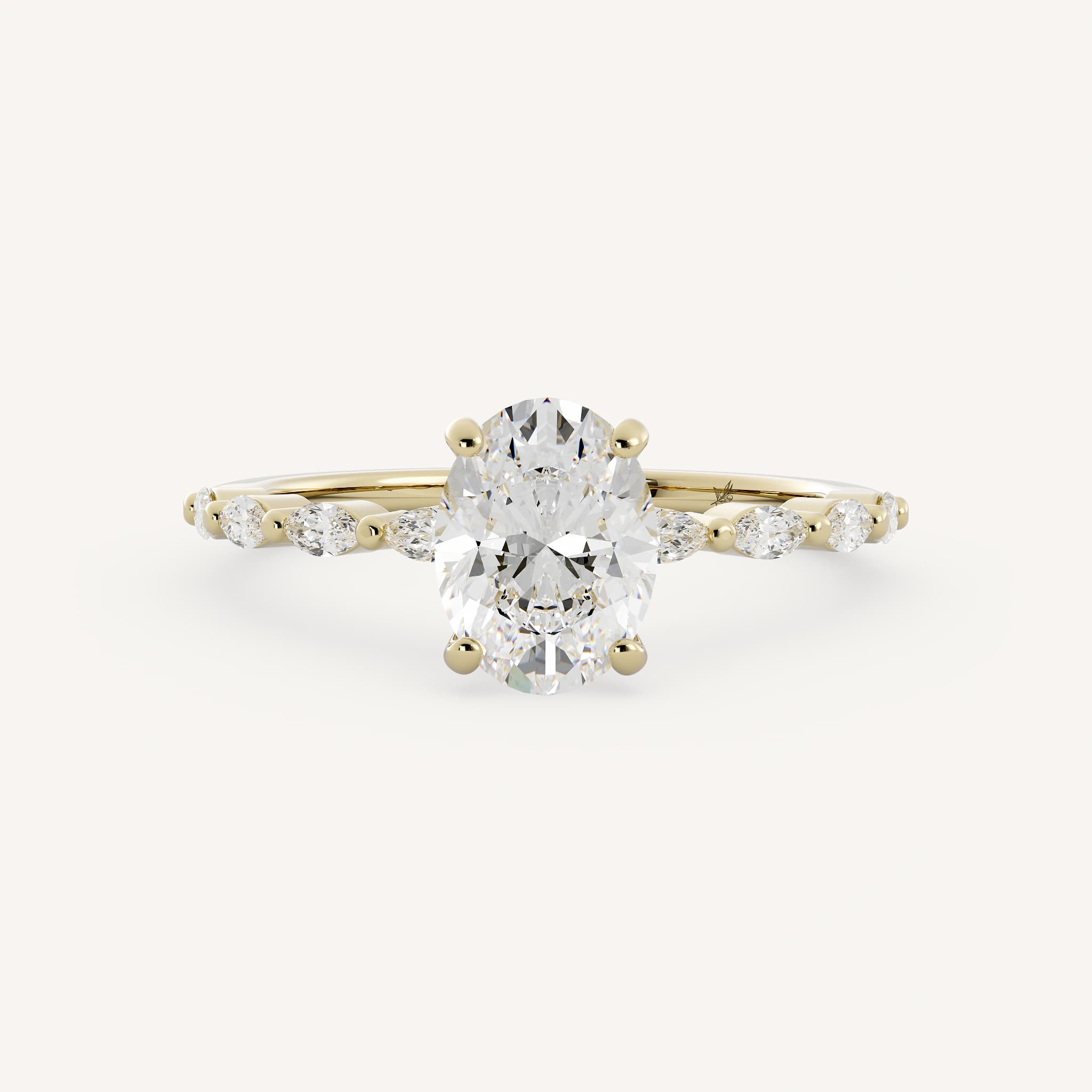 Sybil features a gorgeous oval center stone set in a traditional solitaire setting with a single shared prong marquise diamond shank.