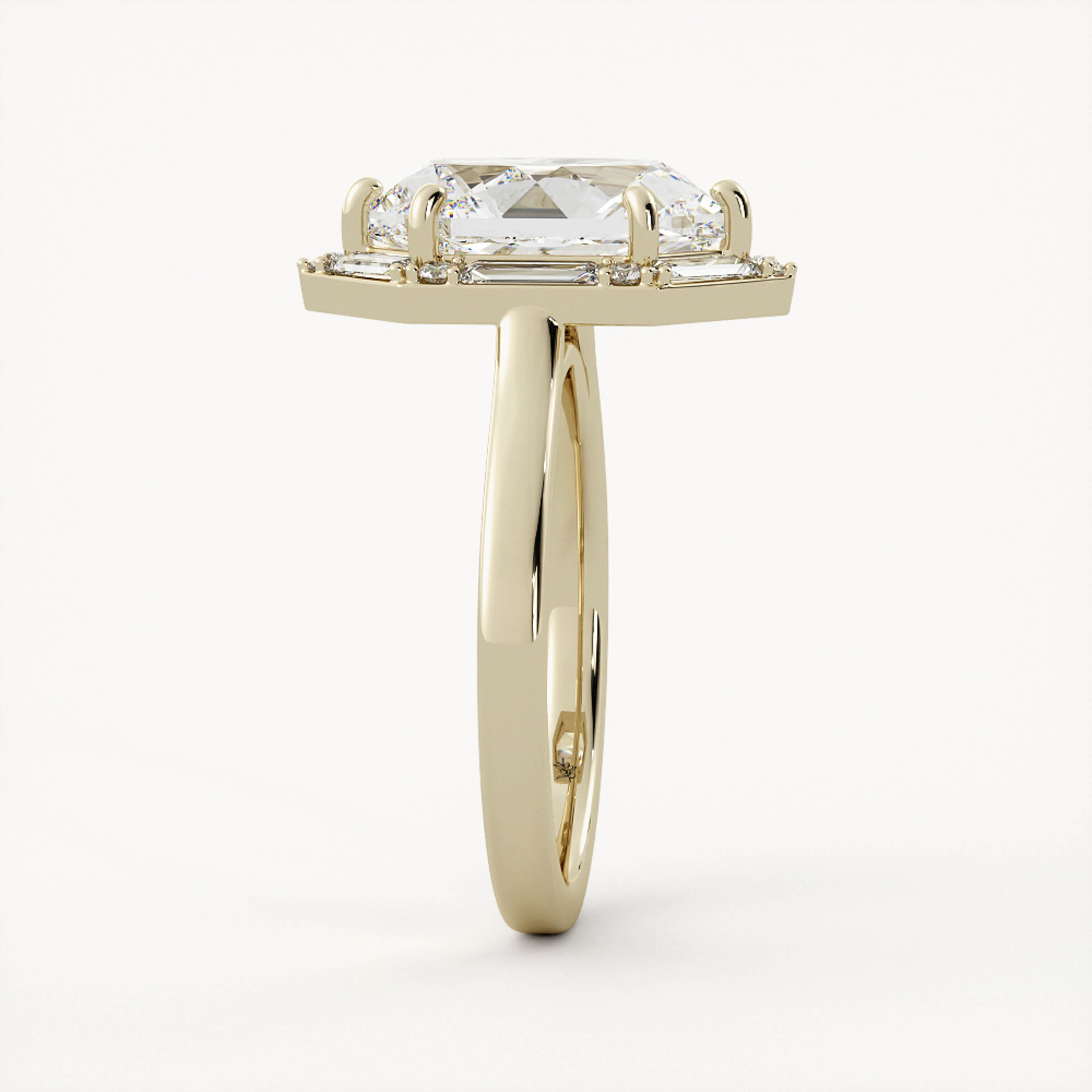 Valery features a stunning duchess shaped center stone with a halo made of baguette and round diamonds set in a cathedral setting on a half round flat edge shank.