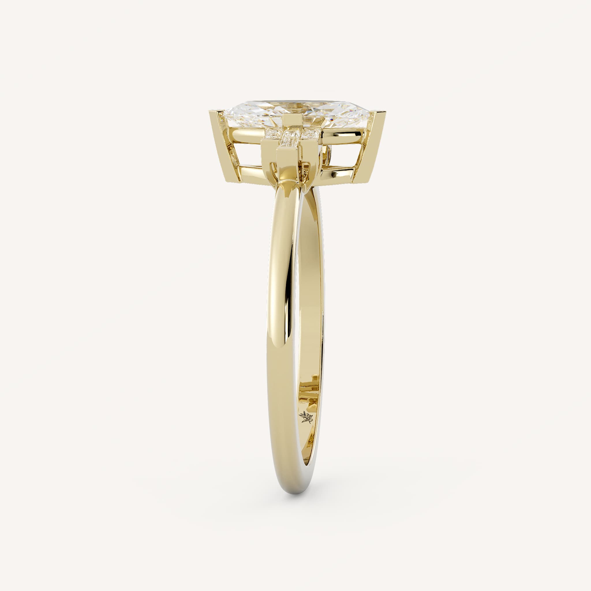Vancouver features a dramatic marquise center stone set in v-prongs and baguette accent stones of varying lengths set in bar prongs and a three stone basket.