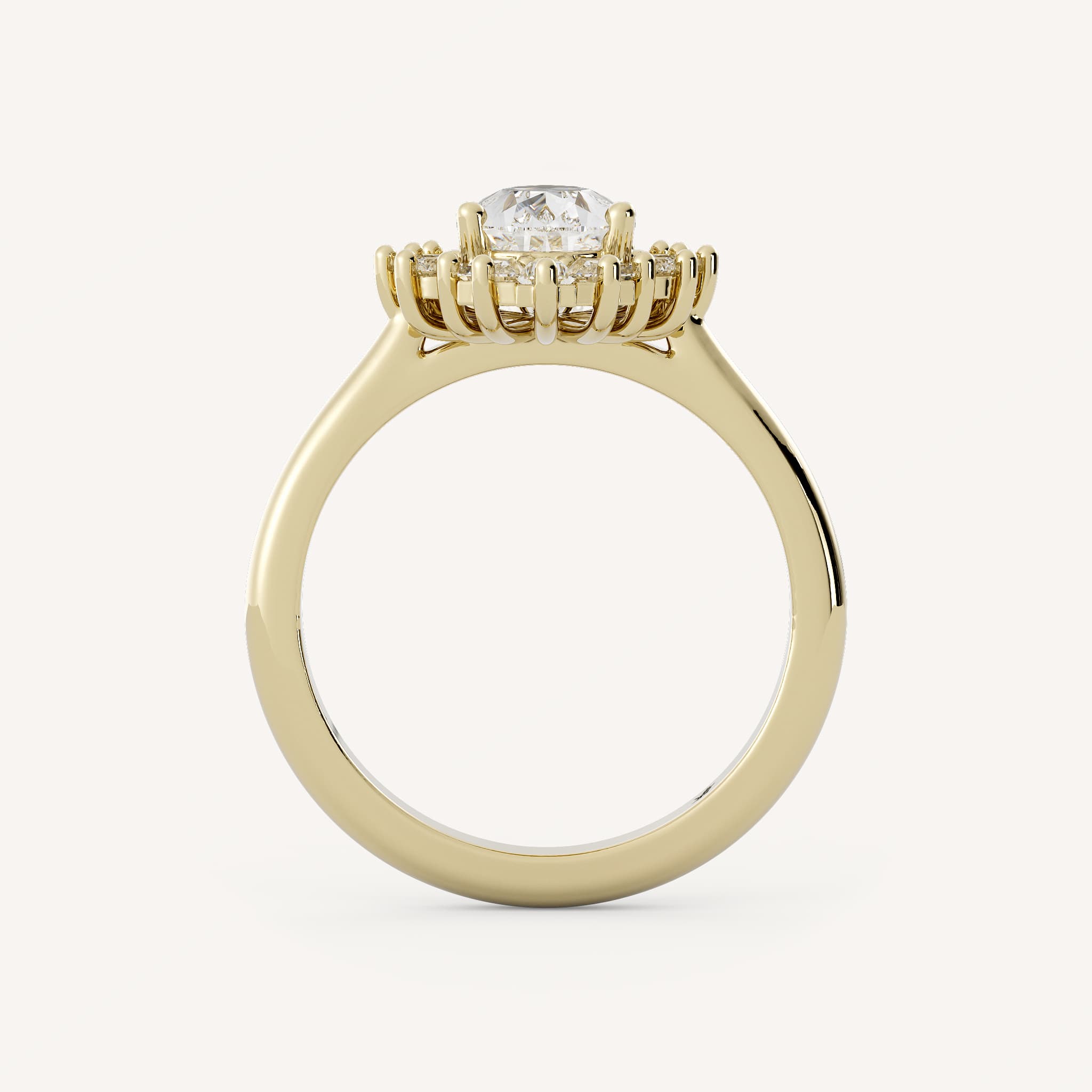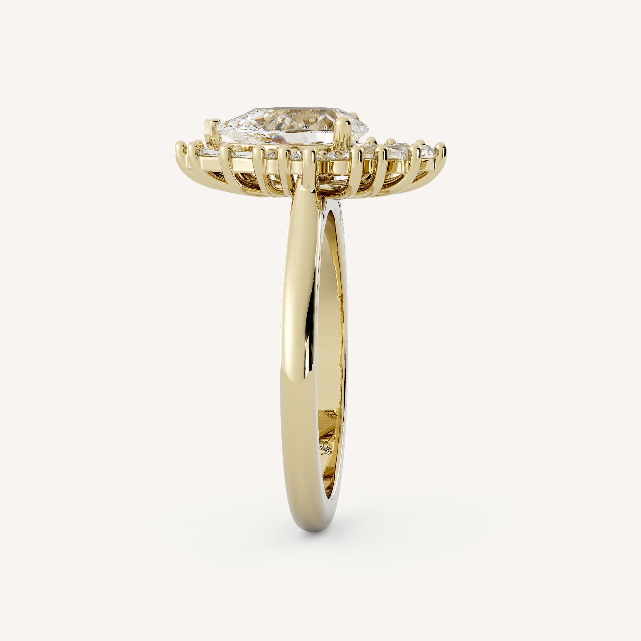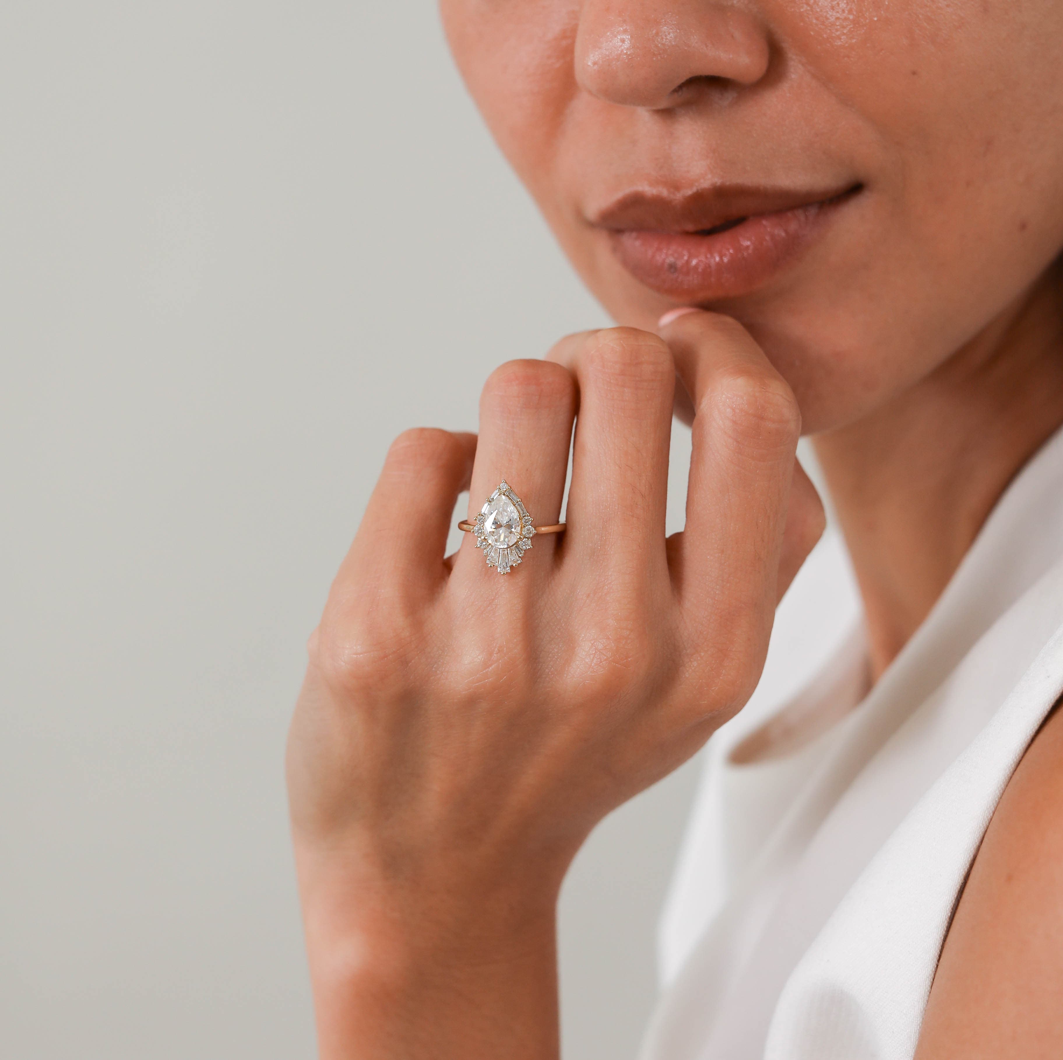 Victoria features a pear center stone accented with an elaborate halo with round, straight and tapered baguettes in a basket setting on a half round shank.
