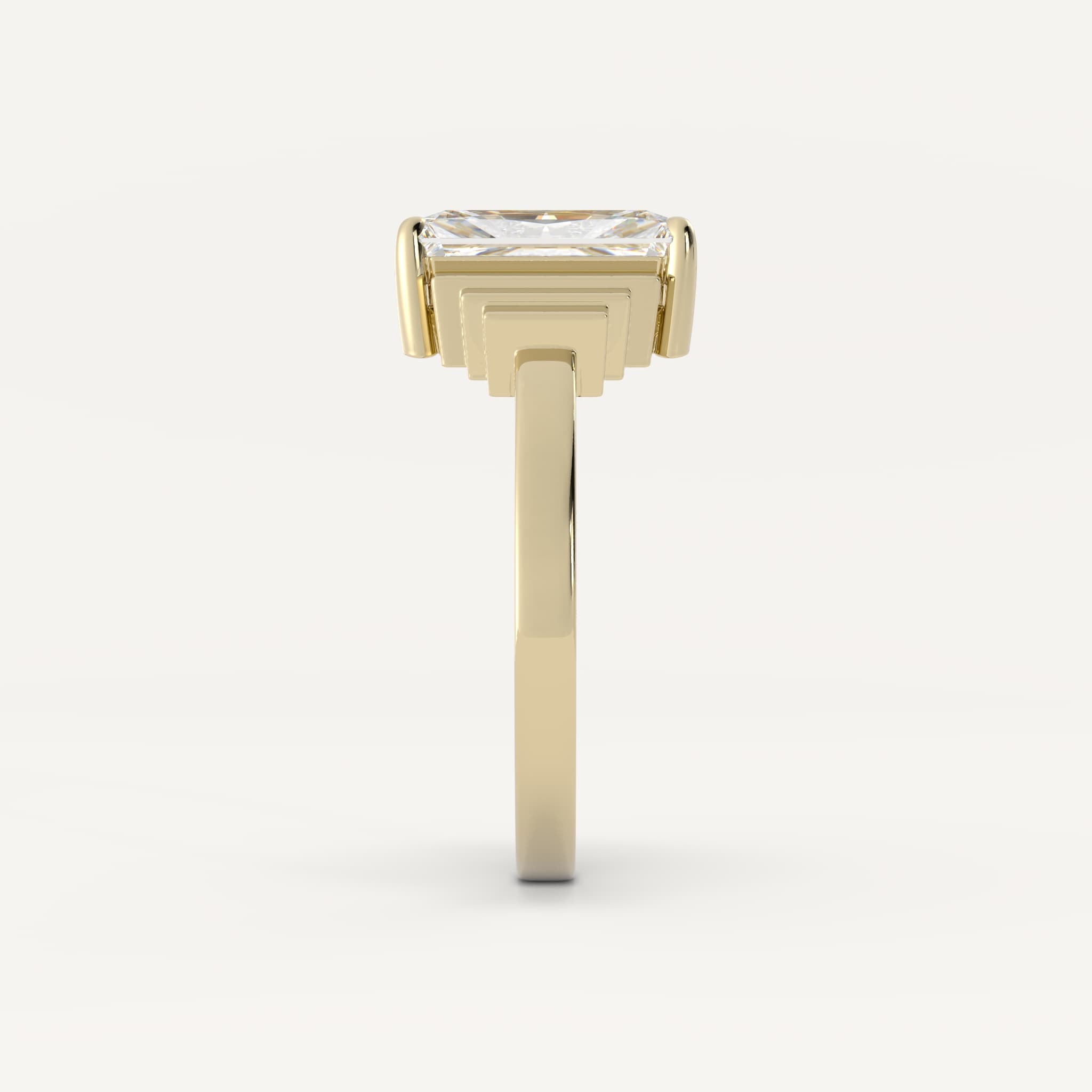 Walker features an emerald shaped center stone with a delicate hidden baguettes in a basket setting with gold detailing on each side on a half round flat edge shank.